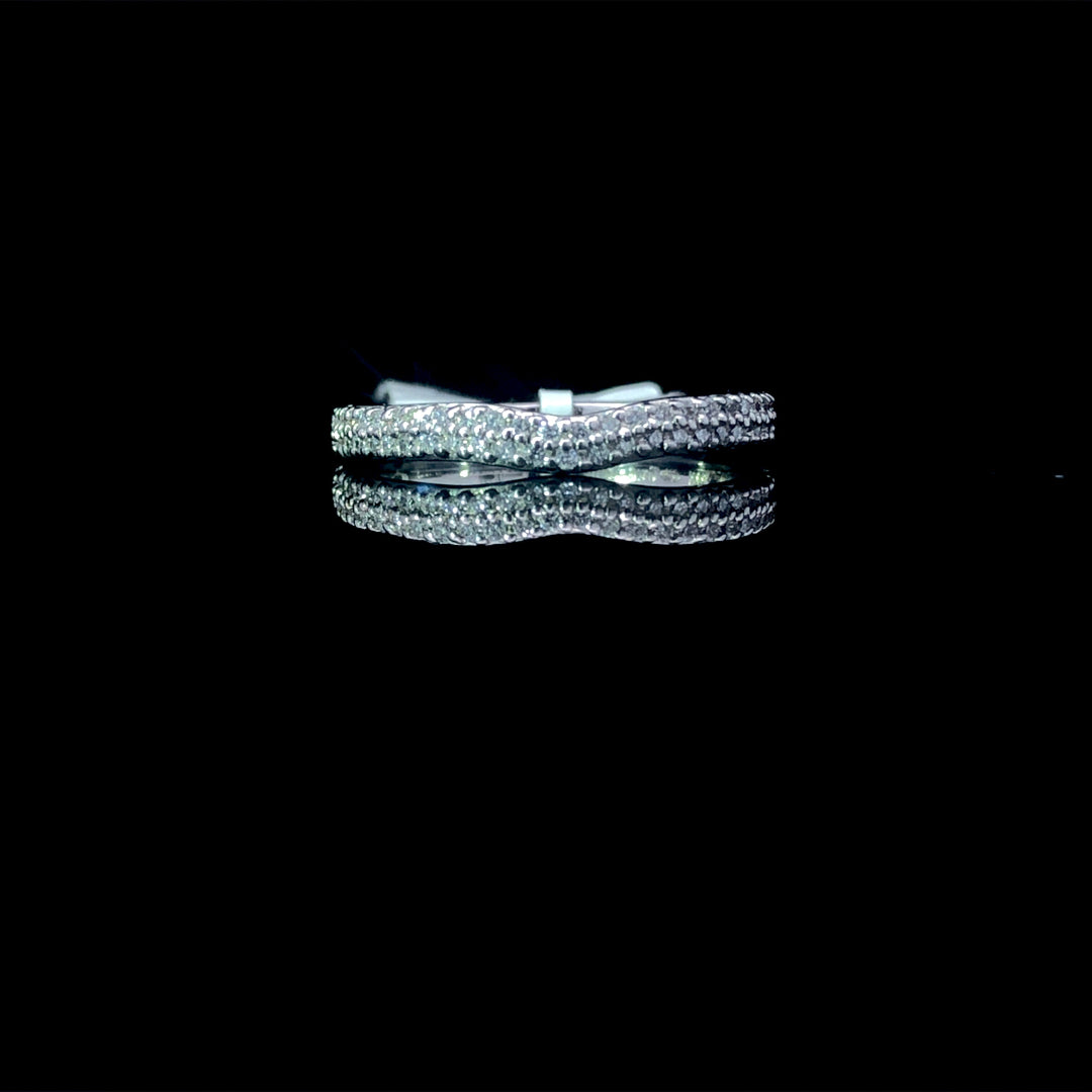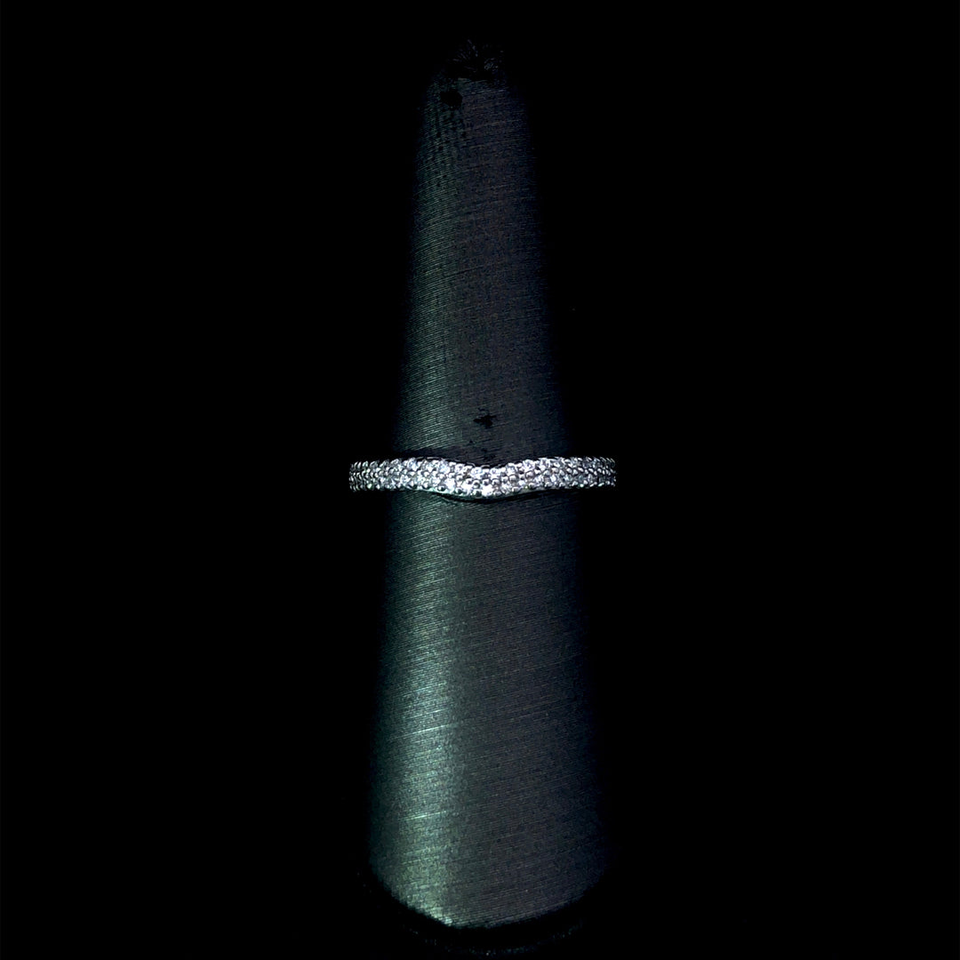 This diamond band is a stunning choice, with a double row of round diamonds totaling .25ctw. Crafted in 14kt white gold with a slight curve, it offers a touch of elegance and sparkle to any look. This ring is a size 7. If that size is not a perfect fit, first time sizing is free at the time of purchase. Additional sizing fees may apply.