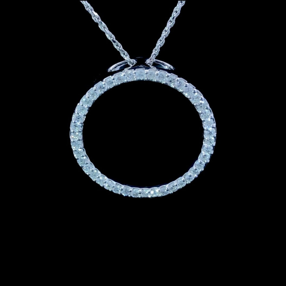 Make a statement with this elegant 14 kt white gold circle pendant, adorned with 1.00 ctw of glowing round diamonds! This one-of-a-kind piece exudes timeless sophistication and is sure to become a cherished heirloom. Wow friends and family with a bold style that will never go out of fashion! Chain is not included.