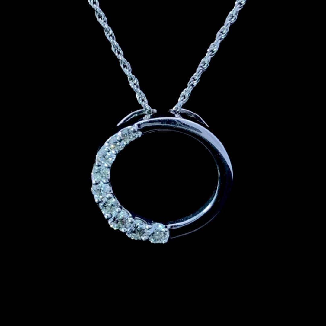 This stunning 14 kt white gold pendant is a unique piece of jewelry that's perfect for any occasion. Sparkling .50 ctw of diamonds glimmer in perfect gradation around half the circle, creating a timelessly elegant look. Make a statement and treat yourself to something special today. Chain is not included.