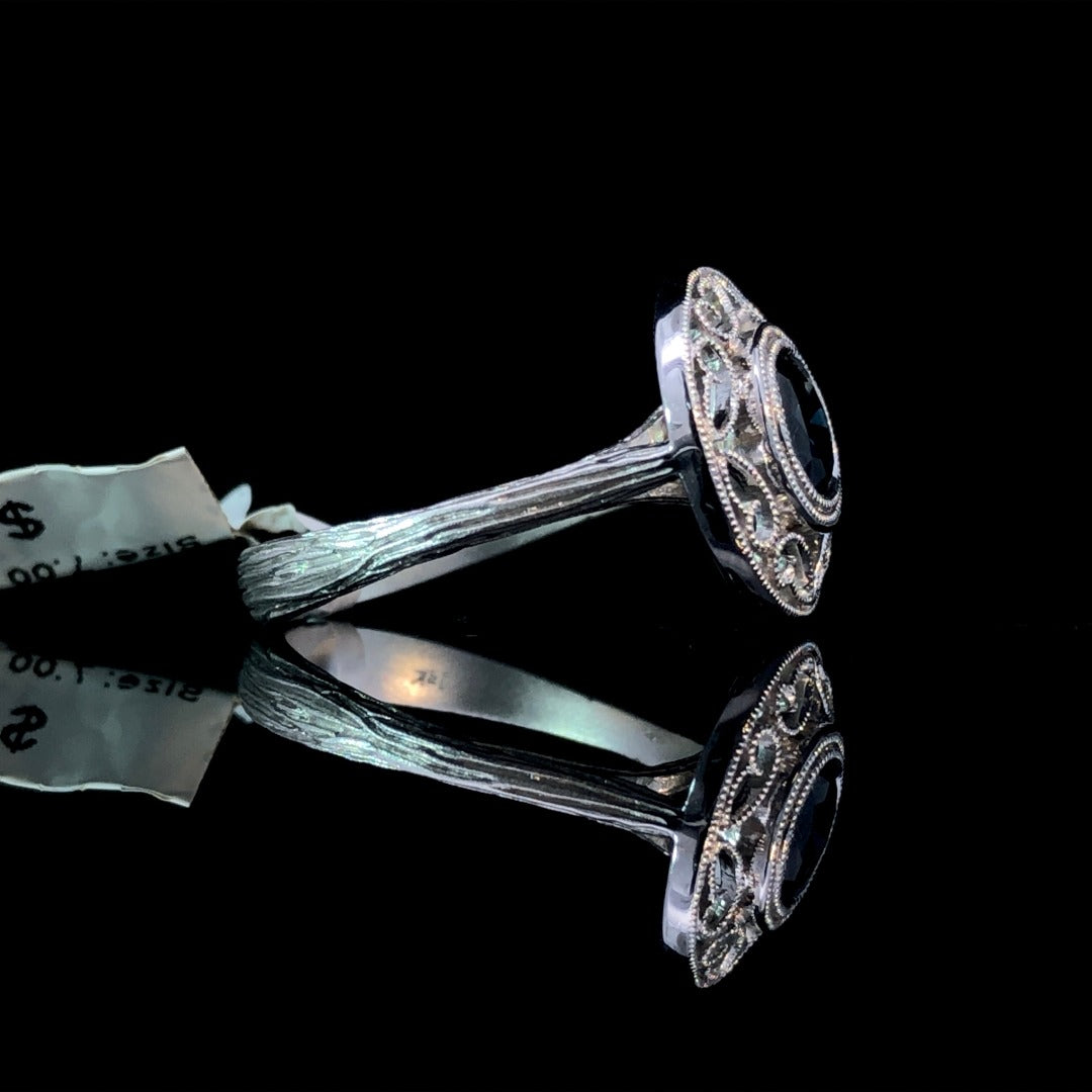 This exquisite 14kt white gold ring with 1.10ct sapphire is a dazzling work of art! The stunning sapphire lies at the center surrounded by a delicate filigree halo, creating a truly mesmerizing look. Feel elegant and radiant with this extraordinary piece! This ring is a size 7. If that size is not a perfect fit, first time sizing is free at the time of purchase. Additional sizing fees may apply.