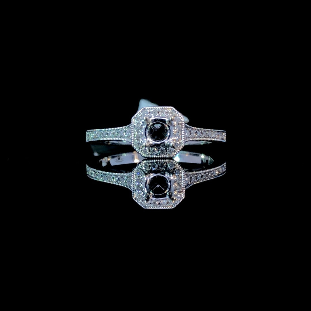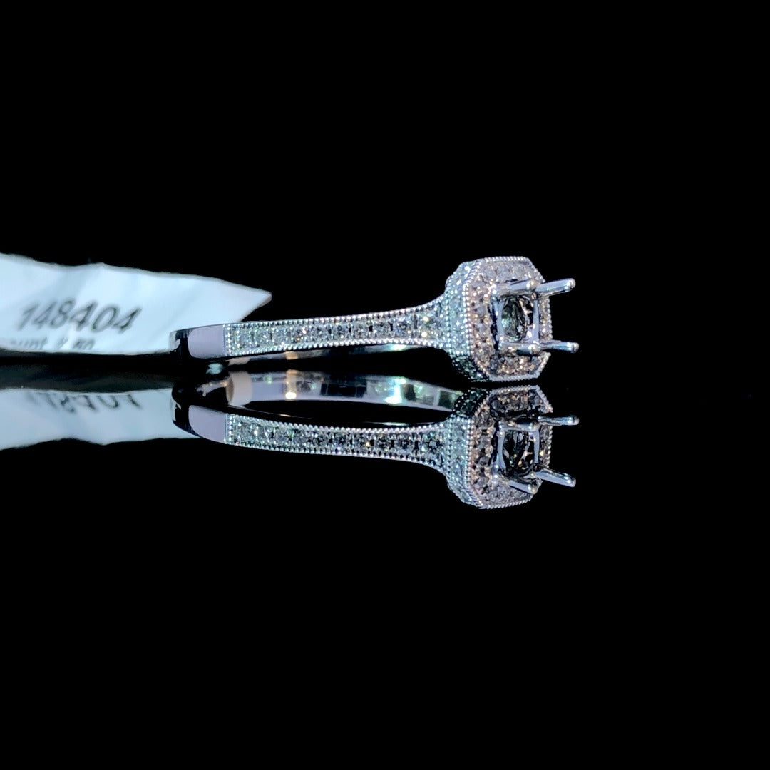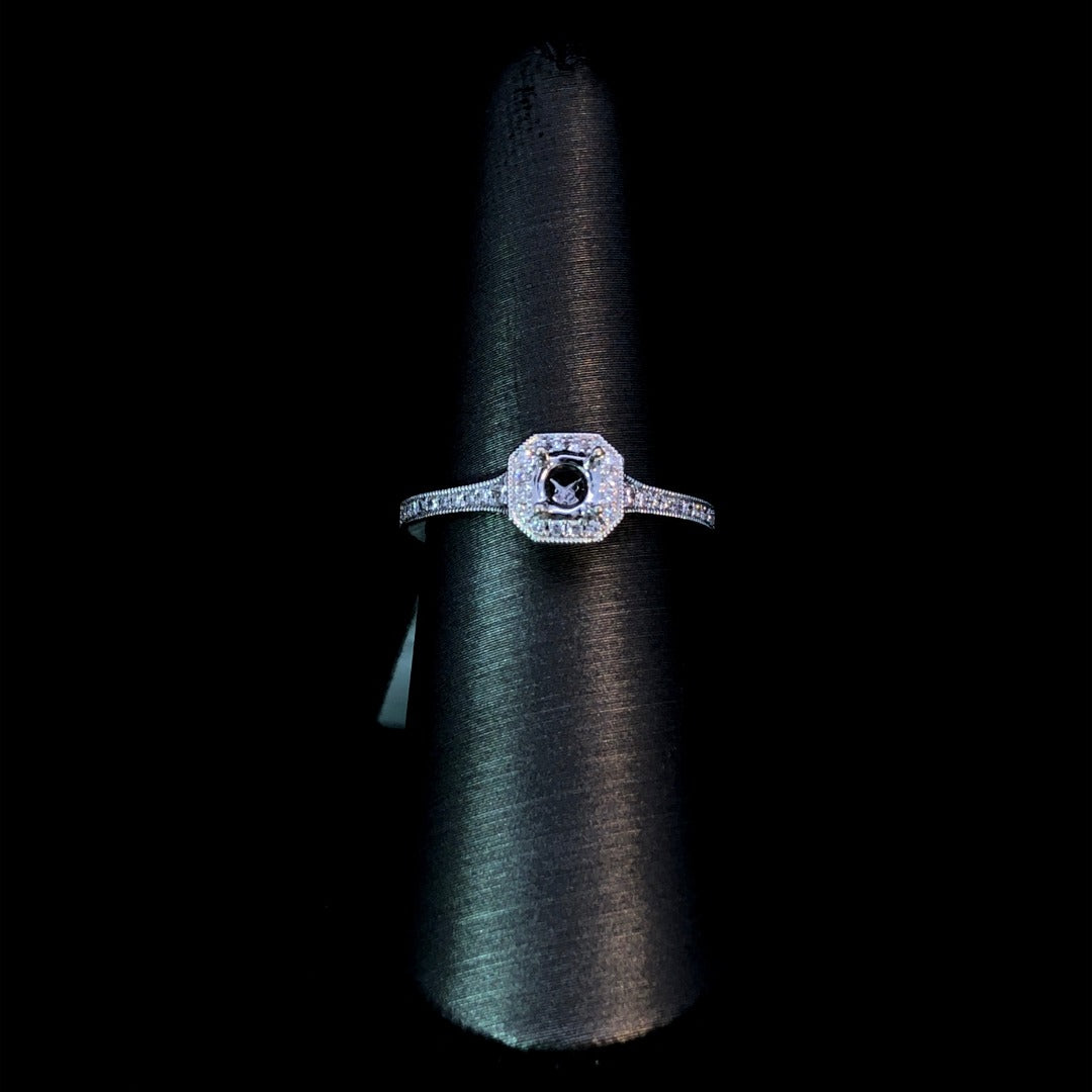 Create a timeless look with this beautiful diamond semi mount. Featuring a halo and band adorned with .21ctw of round diamonds, this 14kt white gold piece exudes sophistication and elegance. Customize it with the center stone of your choice from our wide selection for a truly exquisite finish. Price is for the semi mount only. Center stone will be added at an additional cost. This ring is a size 7. If that size is not a perfect fit, first time sizing is free at the time of purchase. Additional sizing fees may apply.