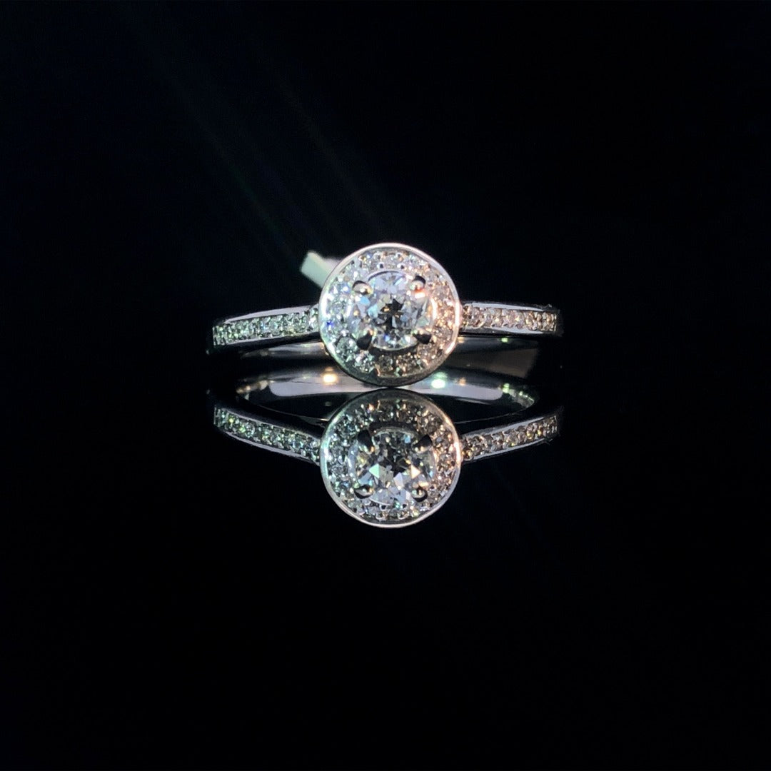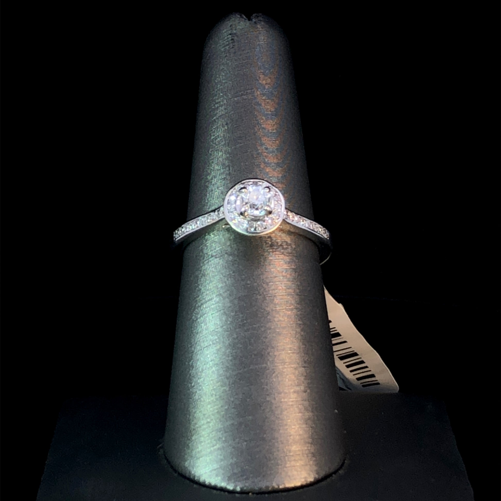 A timeless classic, this diamond ring is a symbol of everlasting beauty. Embellished with a dazzling .18ct round diamond in the center and sparkling diamond halo and channel set band, this 14kt white gold ring glimmers with .41ctw of diamonds. Make every moment a special one with this exquisite piece! This ring is a size 7. If that size is not a perfect fit, first time sizing is free at the time of purchase. Additional sizing fees may apply.
