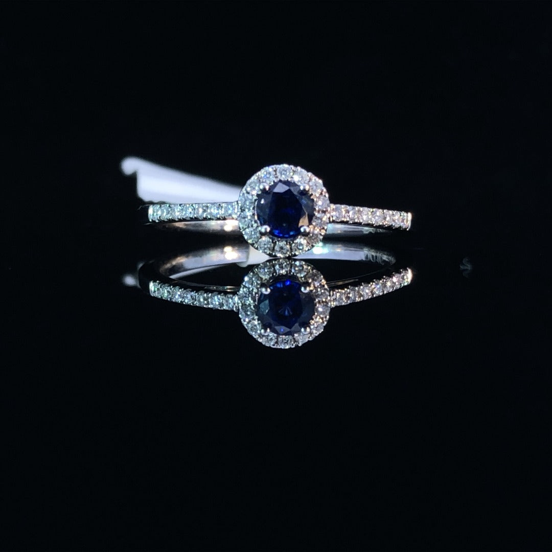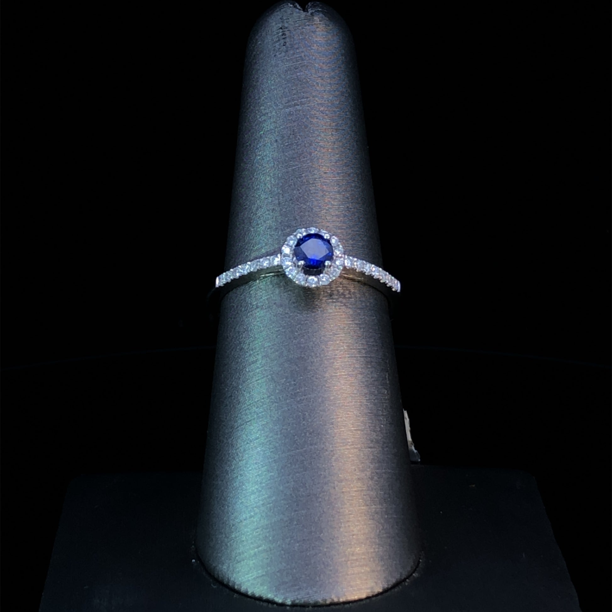 This exquisite 14k white gold ring offers a vibrant blue centerpiece from a .30ct round sapphire, perfectly complemented by round diamond accents of .16ctw to create a timeless, luxurious look. This stunning combination of royalty and sophistication makes this a truly special piece of jewelry. This ring is a size 7. If that size is not a perfect fit, first time sizing is free at the time of purchase. Additional sizing fees may apply.