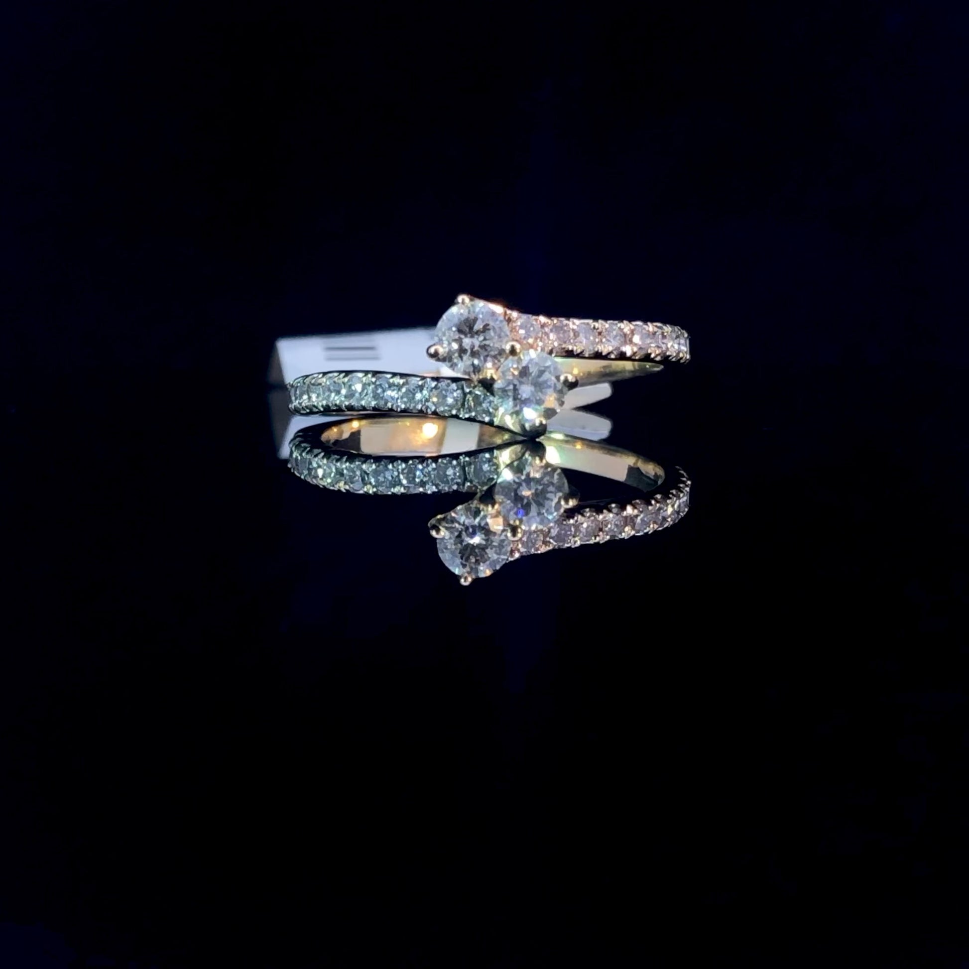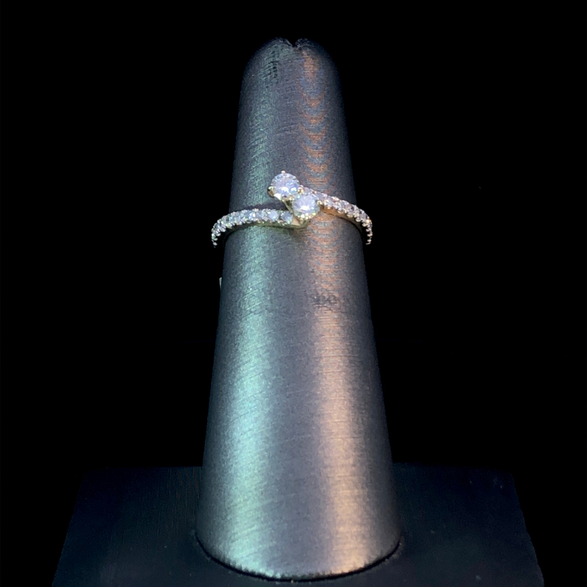 This stunning diamond ring features two dazzling diamonds side-by-side, complemented by a cascade of smaller diamonds totaling .50ctw, all set in 14kt yellow gold. Sparkling and luxurious, it's the perfect gift for a special someone. This ring is a size 5. If that size is not a perfect fit, first time sizing is free at the time of purchase. Additional sizing fees may apply.