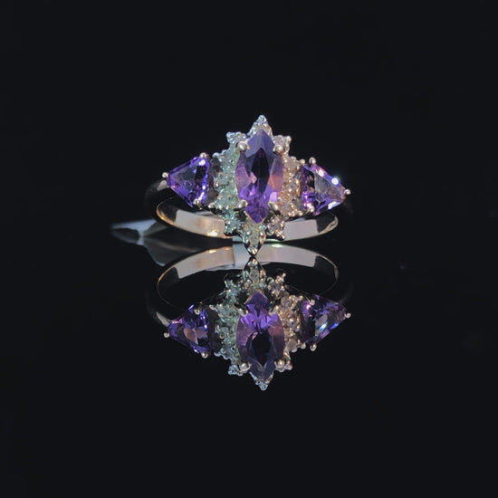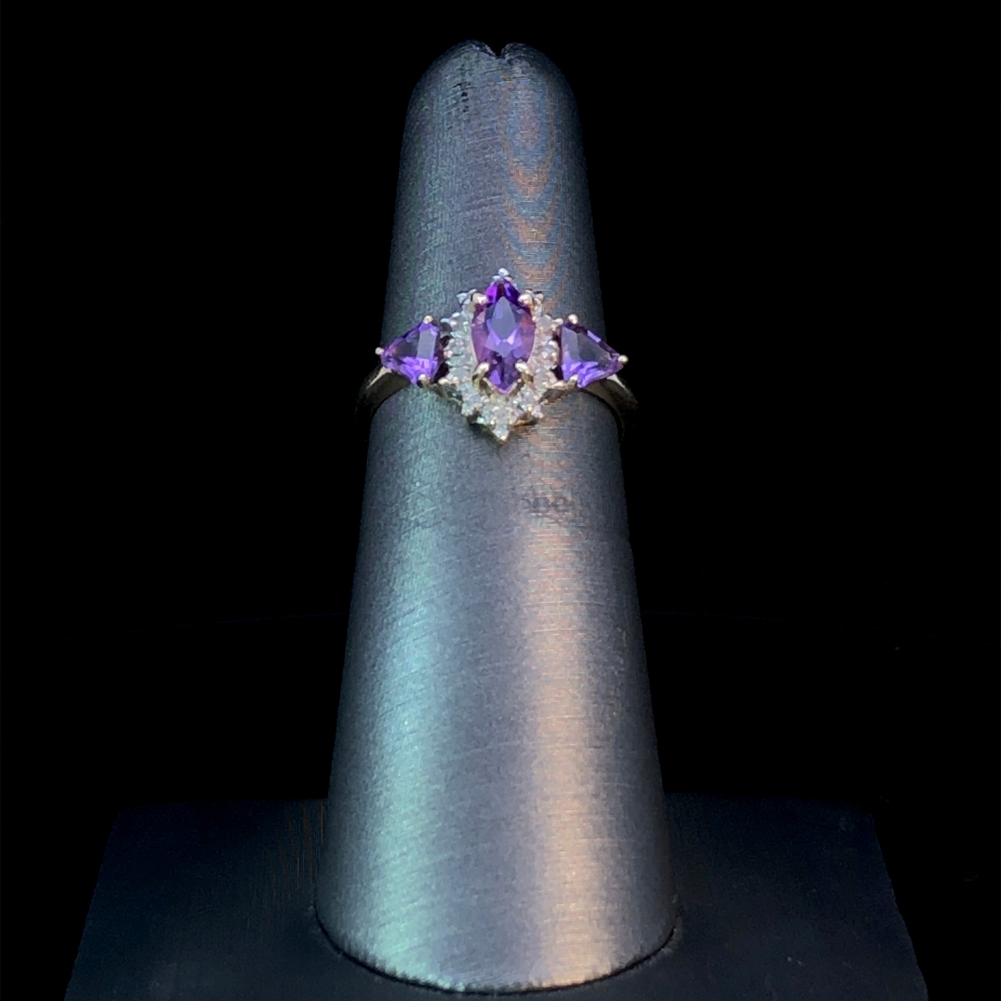 This exquisite ring will add a touch of luxury to any occasion. Crafted in lustrous 10kt yellow gold, it features a striking marquise-cut amethyst in the center, complemented by two graceful amethyst side stones, and a stunning halo of round diamonds totaling .03ctw. Perfect for any special event, this elegant ring is sure to take any look to the next level. This ring is a size 5.75. If that size is not a perfect fit, first time sizing is free at the time of purchase. Additional sizing fees may apply.