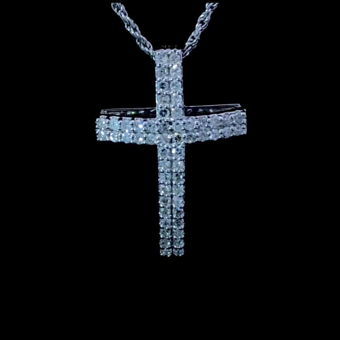 This exquisite 14kt white gold cross features an intricate double row of dazzling .48ctw diamonds expertly set in place. Every diamond is intricately prong-set, to ensure the sparkle and brilliance of each stone. Timeless, elegant and luxurious, it's perfect for any occasion. Chain is not included.