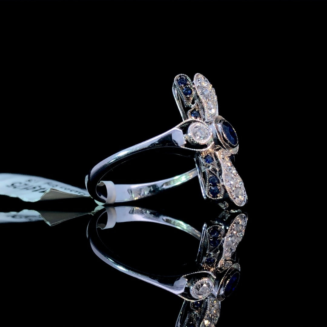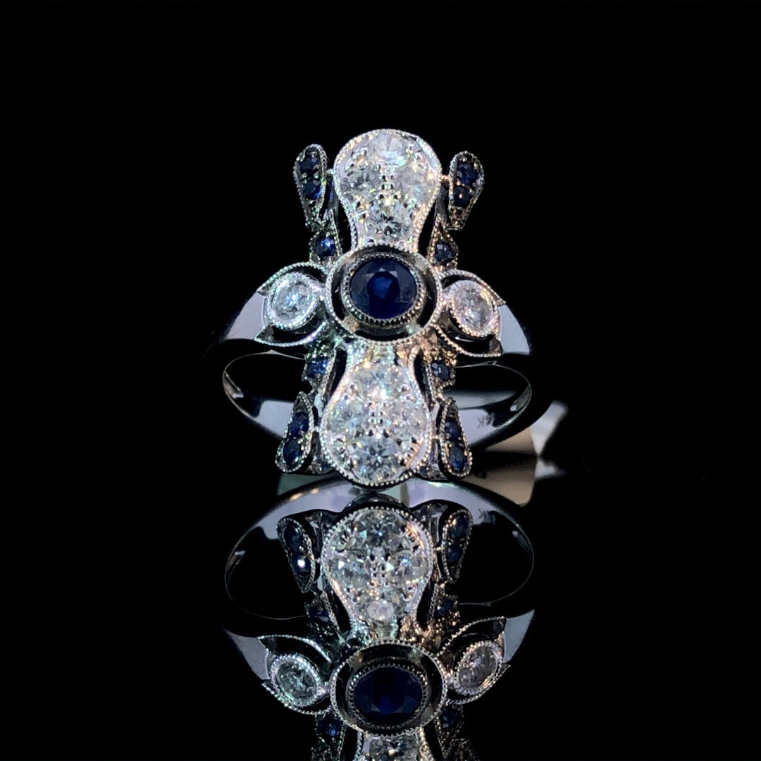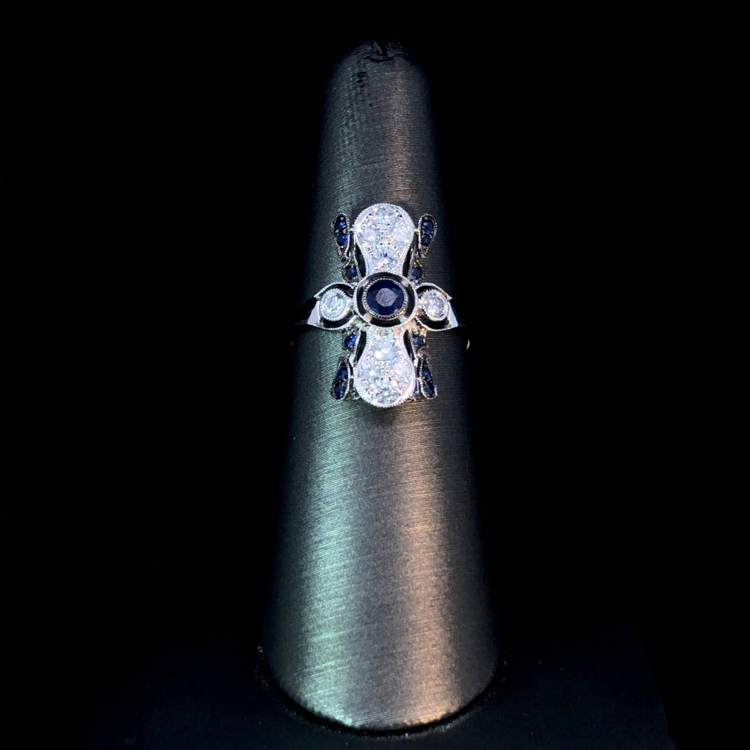 This gorgeous 14kt white gold ring is the perfect accessory for any occasion. It features 0.50ctw of sparkling diamonds and 0.40ctw of stunning blue sapphires, making it an accessory that is sure to turn heads. This ring is currently a size 6.5. If that size is not a perfect fit, first time sizing is free at the time of purchase. Additional sizing fees may apply.