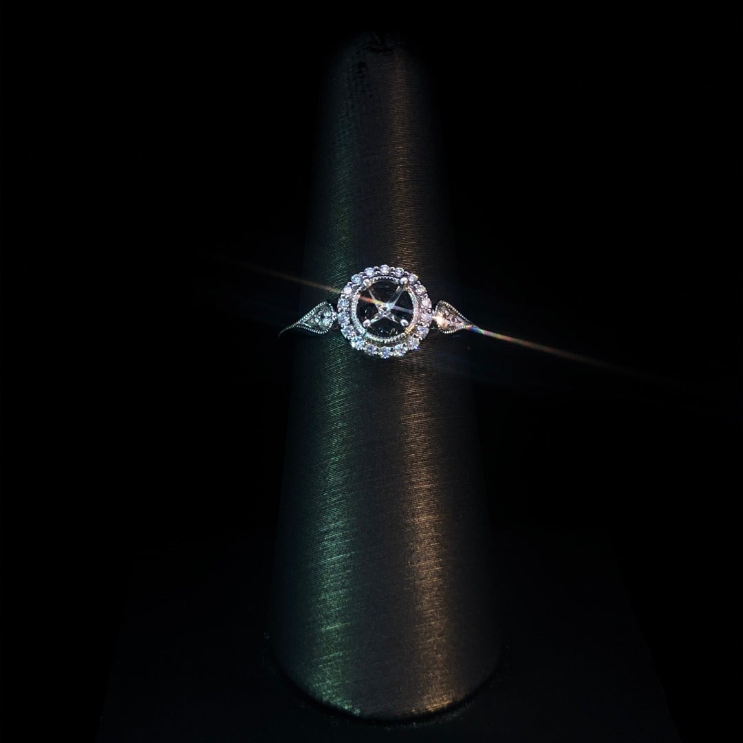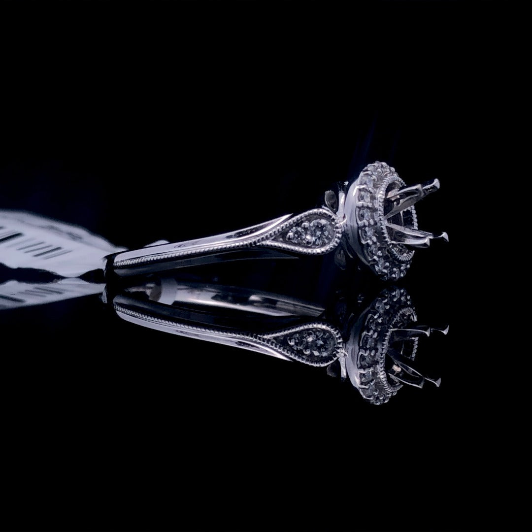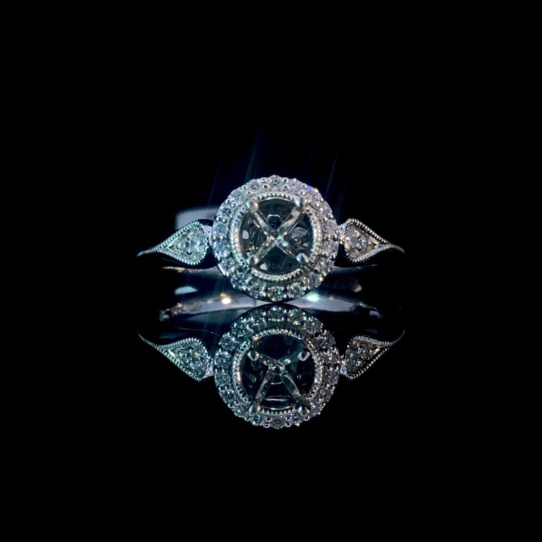 Indulge in elegance with this diamond semi mount. A stunning round halo and pear shaped milgrain bezel embrace 2 additional round diamonds on each side. Crafted in 14kt white gold, this piece sparkles with .18ctw. Choose your desired center stone from our wide selection for a truly unique and breathtaking piece. Price is for the semi mount only. Center stone will be added at an additional cost. This ring is a size 6.5. If that size is not a perfect fit, first time sizing is free at the time of purchase. Additional sizing fees may apply.