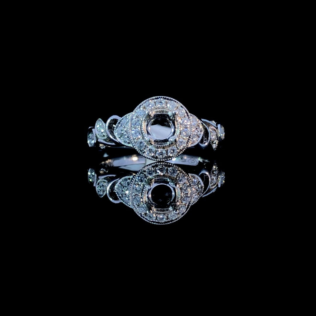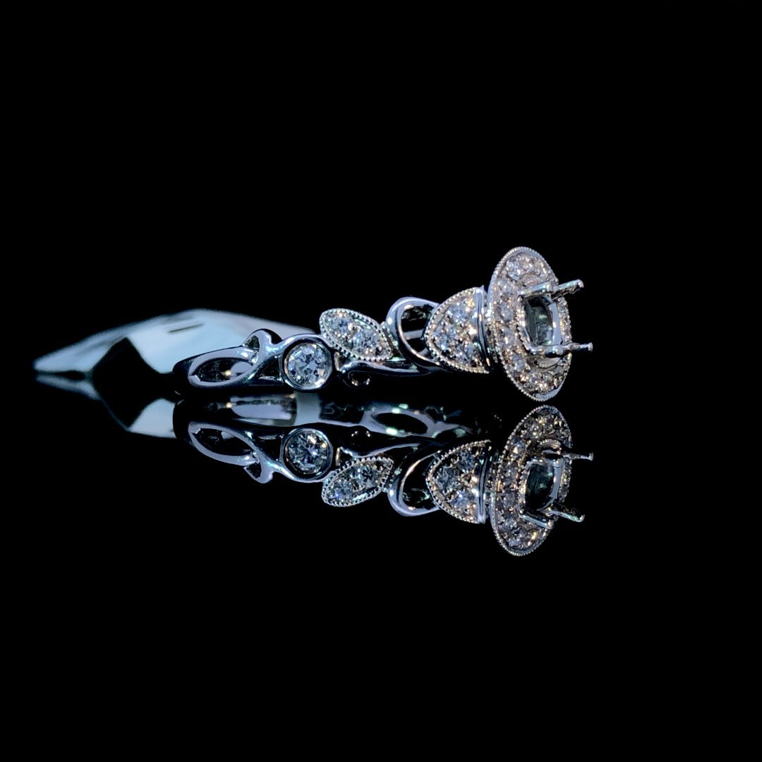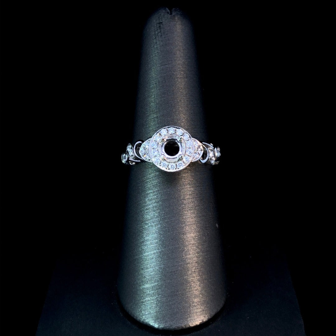 Indulge in the beauty and intricate details of this 14kt white gold semi mount. Adorned with a stunning round halo of diamonds and a leafy decorative band, this piece exudes elegance. With a total diamond weight of .30ctw and the option to add your own center stone, it's the perfect choice for a captivating accessory. Price is for the semi mount only. Center stone will be added at an additional cost. This ring is a size 7. If that size is not a perfect fit, first time sizing is free at the time of purchase. Additional sizing fees may apply.