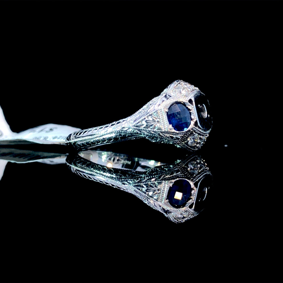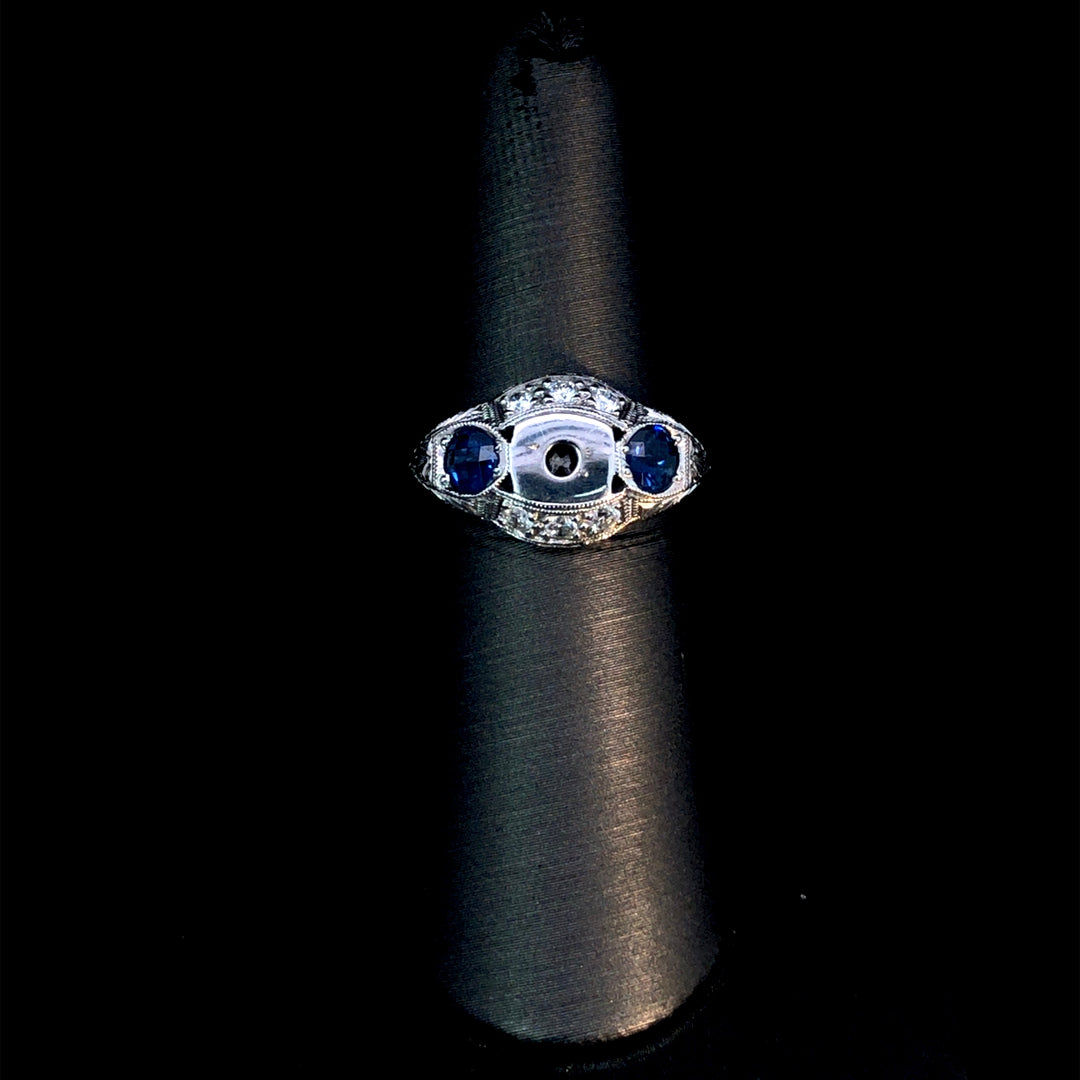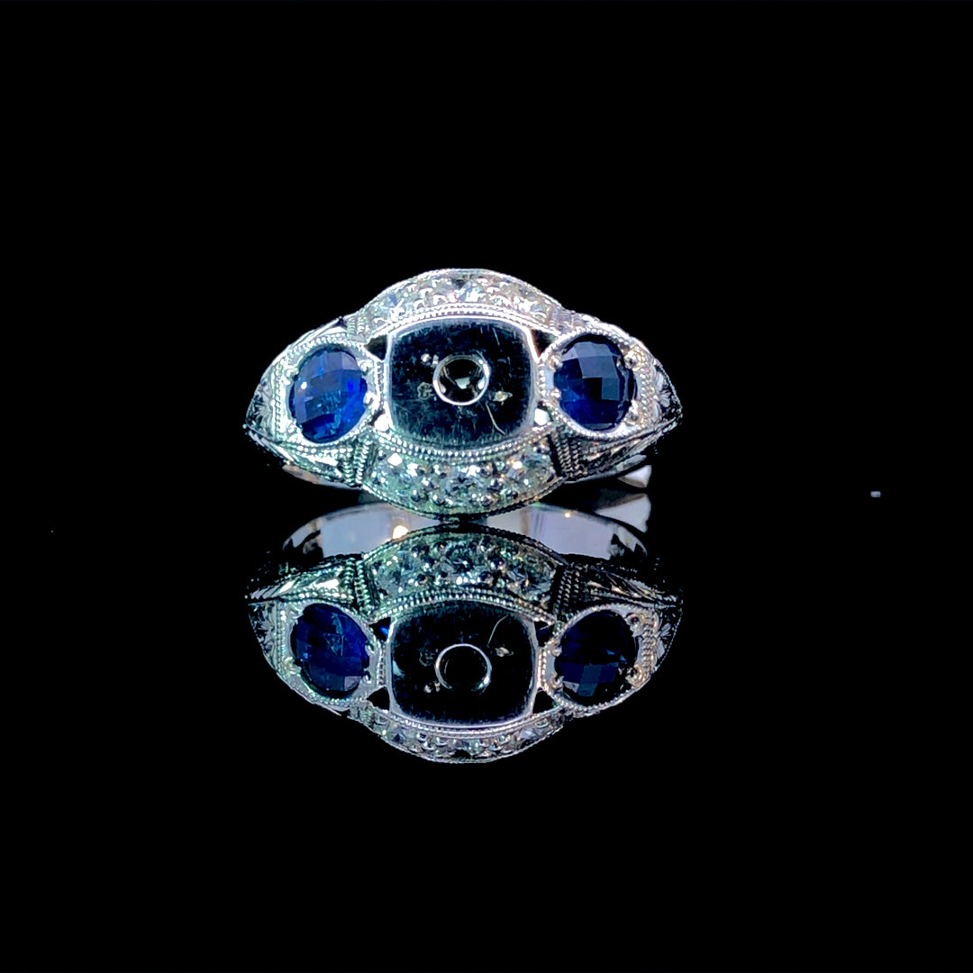 This elegant 14kt white gold semi mount features two round sapphire side stones and .21 ctw of round diamonds, offering a beautiful pop of color with a vintage-inspired design. Intricately detailed, it combines classic charm with modern sparkle. Complete this unique piece by selecting your preferred center stone from our collection, creating a ring that’s truly one of a kind. Price is for the semi mount only. Center stone will be added at an additional cost. This ring is a size 6.5. If that size is not a perfect fit, first time sizing is free at the time of purchase. Additional sizing fees may apply.