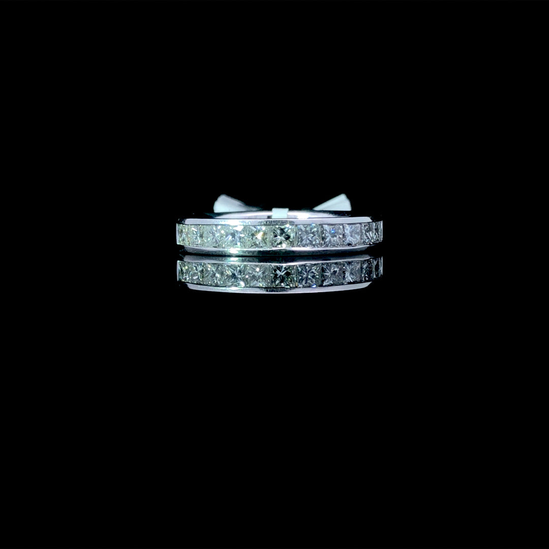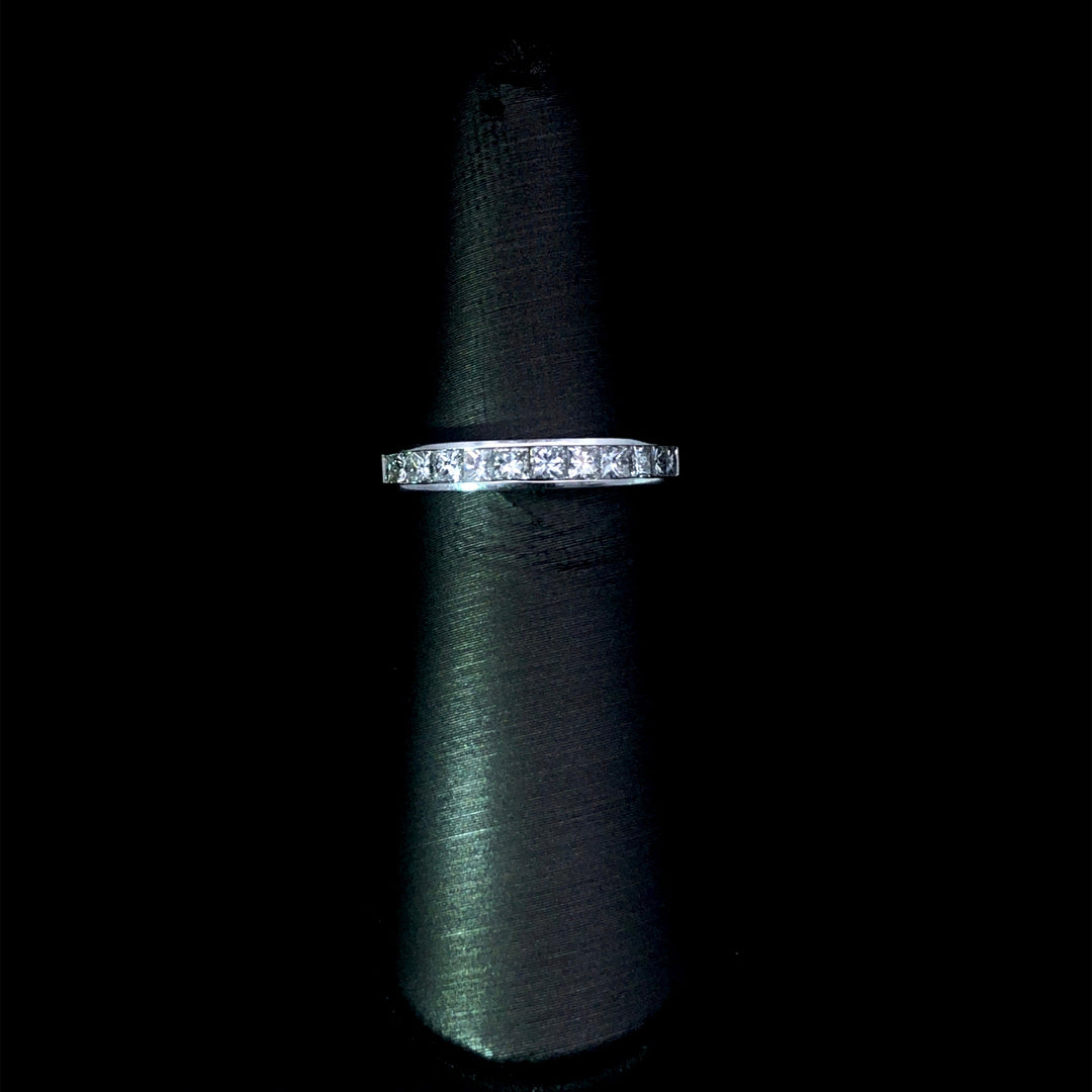Add some timeless sparkle to your everyday look with this classic diamond band. Crafted from 14kt white gold, this band features a dazzling .76ctw of princess cut diamonds in a sleek channel setting. This ring is a size 6. If that size is not a perfect fit, first time sizing is free at the time of purchase. Additional sizing fees may apply.