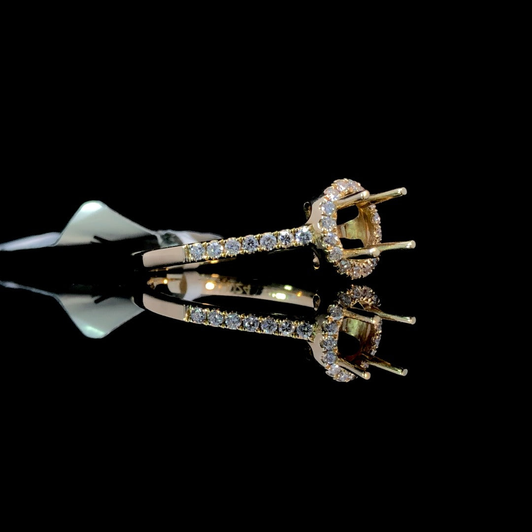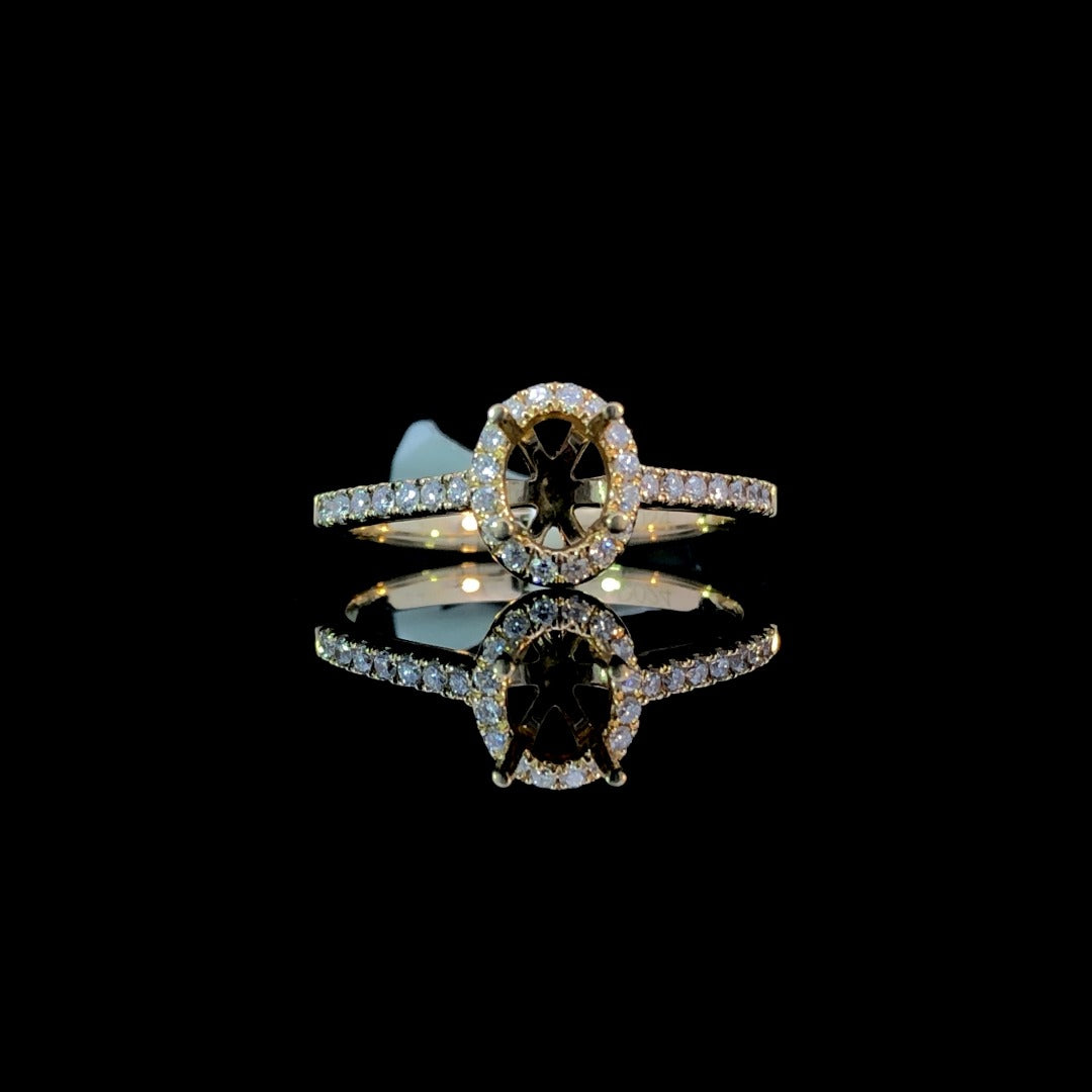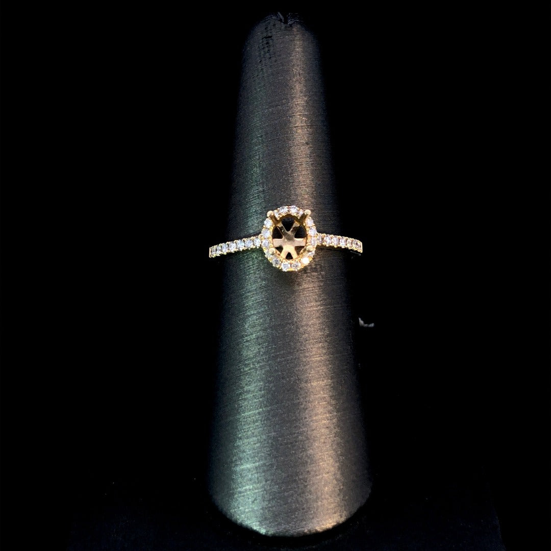 Indulge in luxury with this classic diamond semi mount. With a timeless oval halo design and .24ctw of round diamonds, set in 14kt yellow gold, this piece is a showstopper. Personalize your ring with an oval center stone from our large selection of loose stones. Perfect for the modern bride. Price is for the semi mount only. Center stone will be added at an additional cost. This ring is a size 6.75. If that size is not a perfect fit, first time sizing is free at the time of purchase. Additional sizing fees may apply.