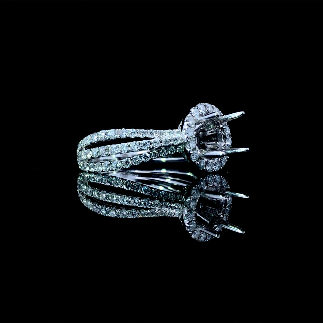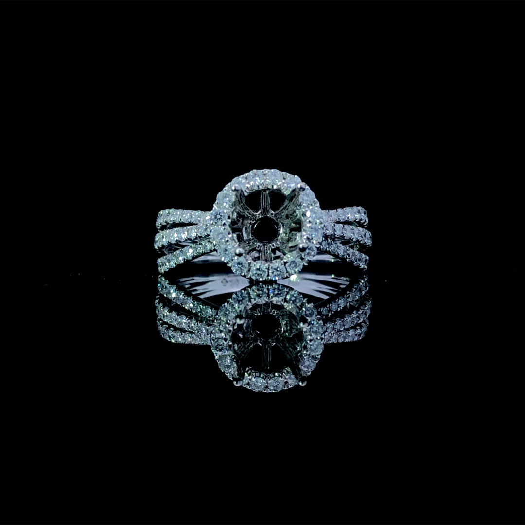Transform your vision into reality with this breathtaking diamond semi mount. A luminous round halo frames the center, while an elegant triple split shank band adds dimension and sophistication. Featuring 1.07ctw of sparkling round diamonds set in 14kt white gold, this semi mount provides the ideal foundation for your dream engagement ring. Select your perfect center stone from our extensive collection of premium loose diamonds to create a one-of-a-kind piece that captures your unique love story. Price is for the semi mount only. Center stone will be added at an additional cost. This ring is a size 6.5. If that size is not a perfect fit, first time sizing is free at the time of purchase. Additional sizing fees may apply.
