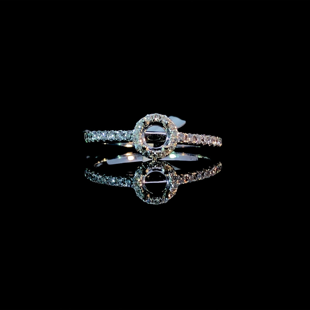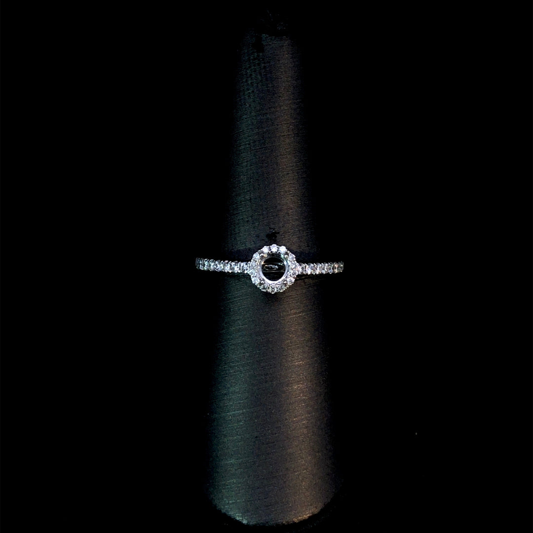This classic diamond semi-mount showcases a round halo and diamond accents along the band, totaling .24ctw set in 14kt white gold. Customize this elegant setting by selecting your own center stone from our collection of loose stones to create a ring that reflects your personal style and love. Price is for the semi mount only. Center stone will be added at an additional cost. This ring is a size 7. If that size is not a perfect fit, it can be sized up 2 sizes for free at the time of purchase. Additional sizing fees may apply.