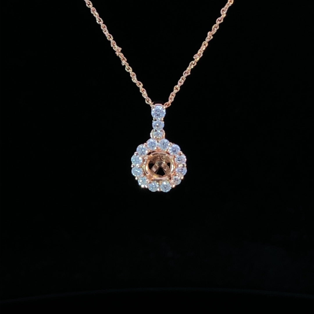 Complete your look with the radiant elegance of this classic diamond halo pendant mounting. A stunning .19ctw of round diamonds sparkles brilliantly in 14kt rose gold, offering timeless beauty and a hint of luxury. Add a timeless touch of glamour to your wardrobe today! Price is for the mounting only. Center stone will be added at an additional cost. Chain is not included.