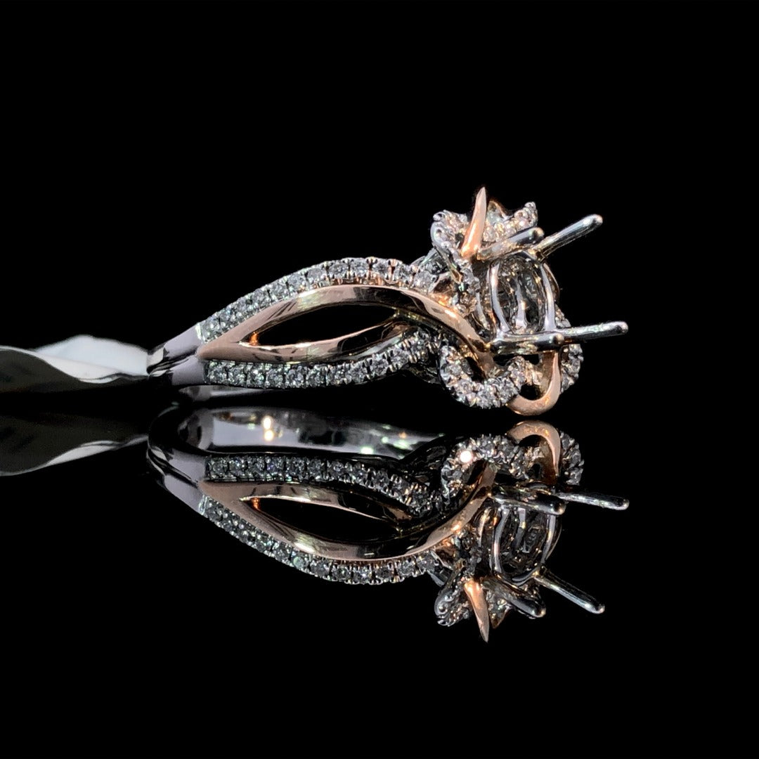 Elevate your style with this unique diamond semi mount. Featuring a captivating design of intertwined white and warm rose gold, adorned with .31ctw of round diamond accents. Add your own center stone from our unmatched loose stone selection for a custom touch. Dazzle with this stunning piece of art. Price is for the semi mount only. Center stone will be added at an additional cost. This ring is a size 7. If that size is not a perfect fit, first time sizing is free at the time of purchase. Additional sizing fees may apply.