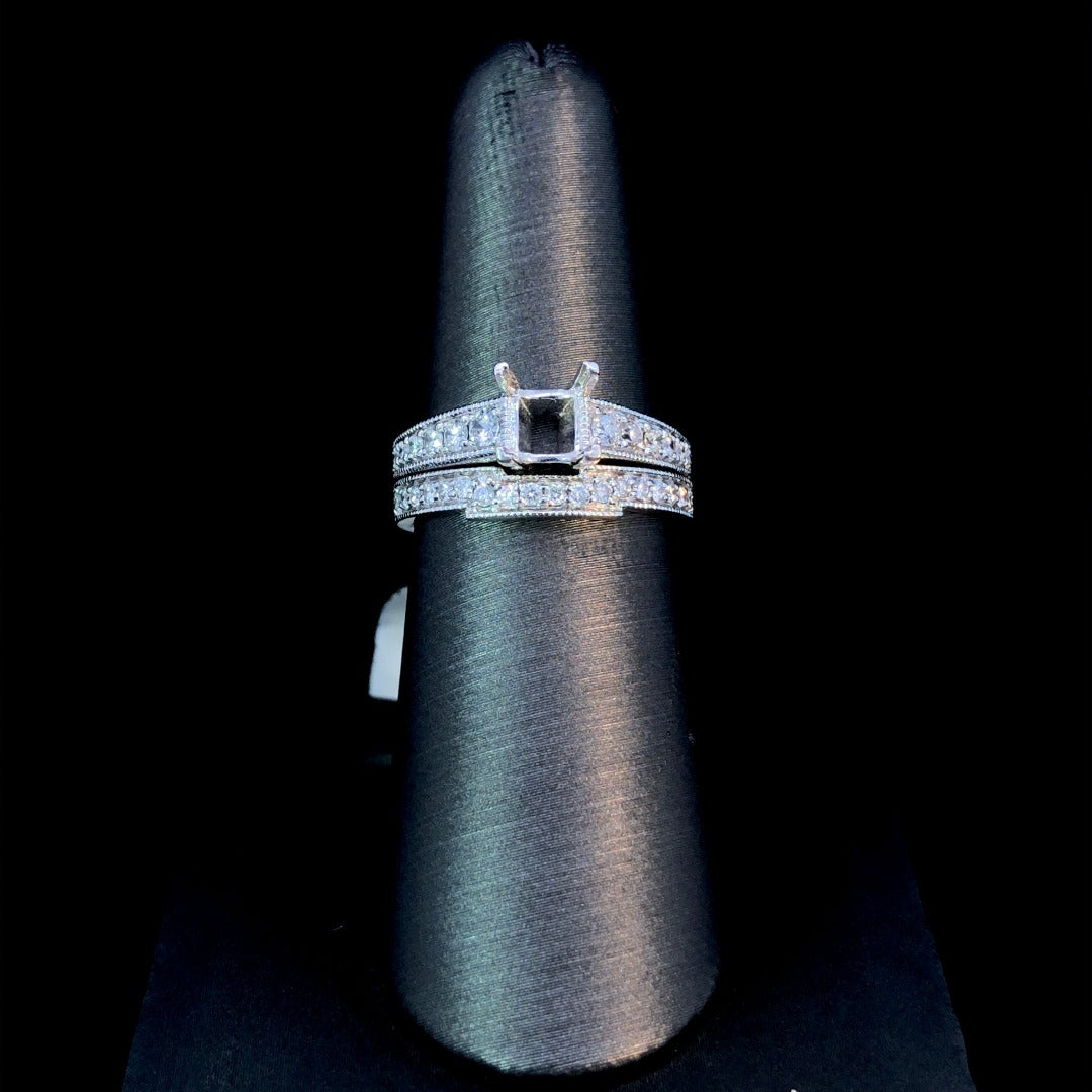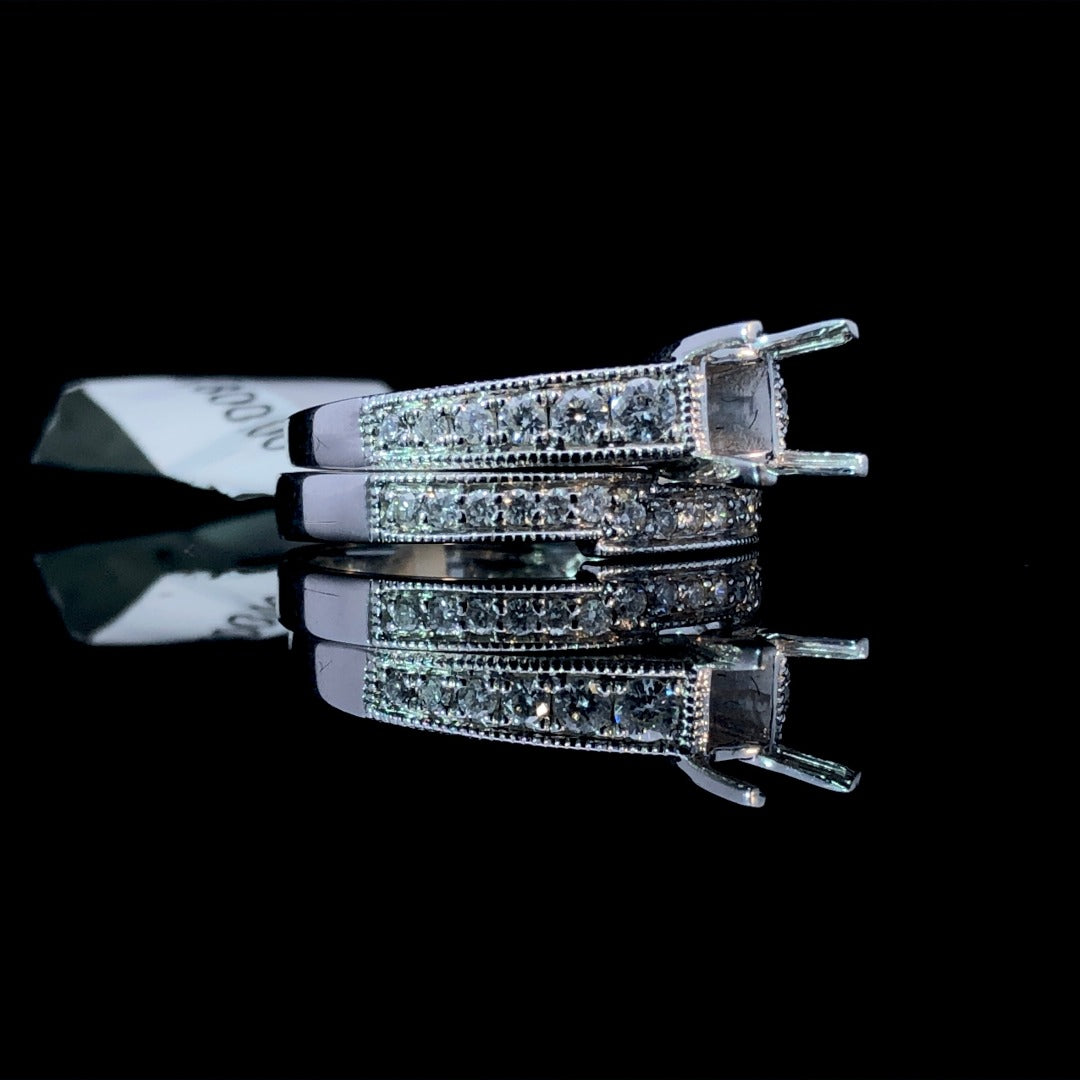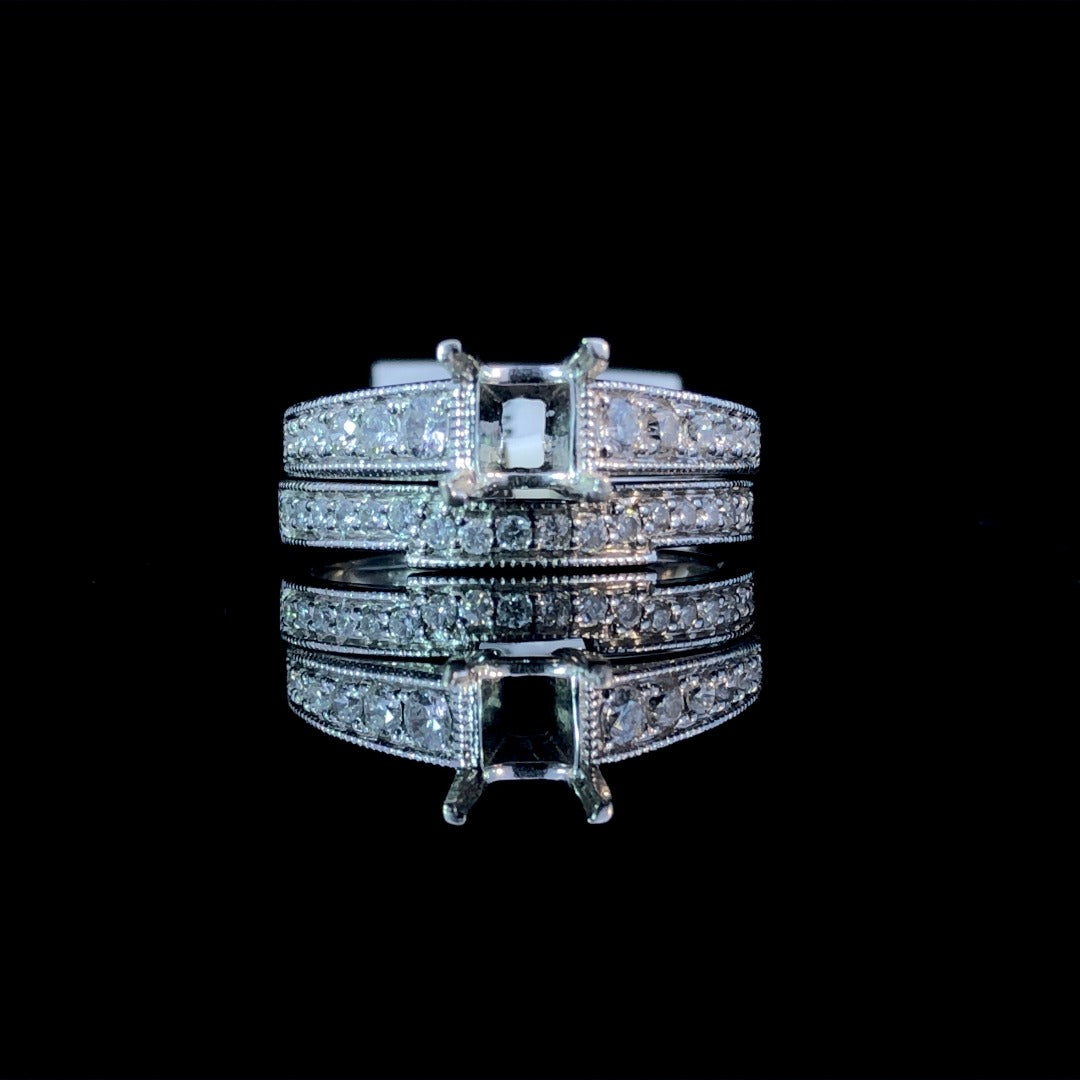 Indulge in the luxury of this exquisite set. The dazzling diamond semi mount accommodates your perfect center stone and features milgrain detailing on the band, all set in 14kt white gold. Complete the look with the matching contour band, boasting a sparkling .49ctw weight for the set. Elevate your style with this beautiful and exclusive bridal set. Price is for the semi mount only. Center stone will be added at an additional cost. This is a size 7. If that size is not a perfect fit, firs time sizing is free at the time of purchase. Additional sizing fees may apply.