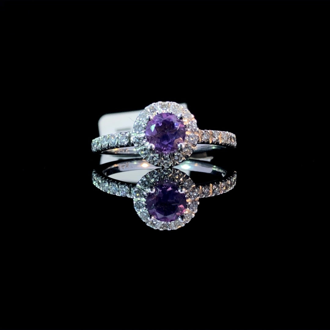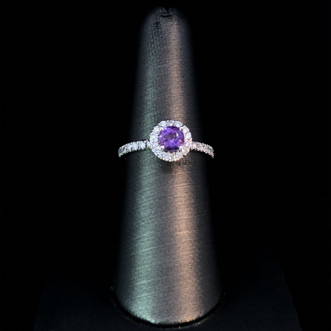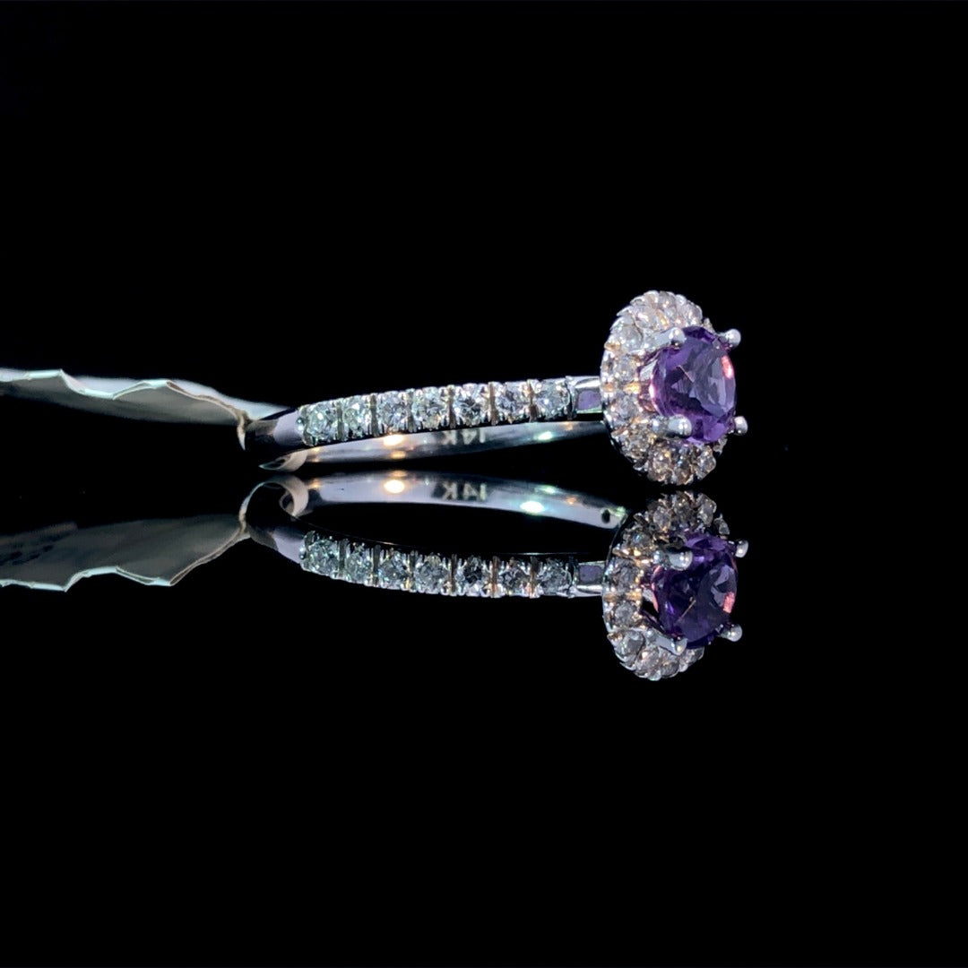 With a dazzling .35ct round amethyst at the center surrounded by a diamond halo, this classic 14kt white gold gemstone ring is simply breathtaking! Further enhanced with accent diamonds down the band, it sparkles with effortless elegance and grace with its .31ctw of diamonds! What a stunning, show-stopping piece! This ring is a size 6.5. If that size is not a perfect fit, first time sizing is free at the time of purchase. Additional sizing fees may apply.