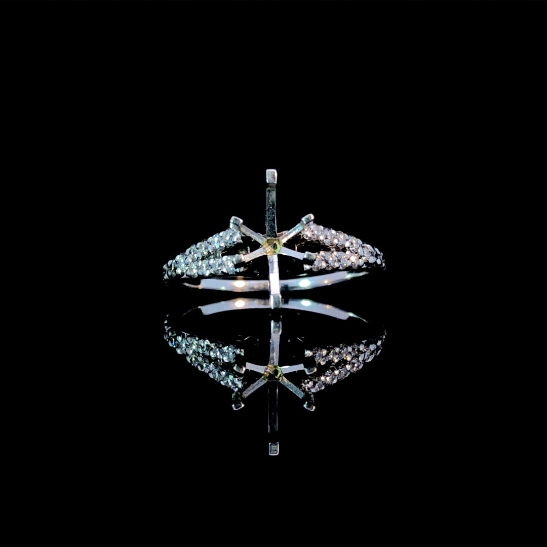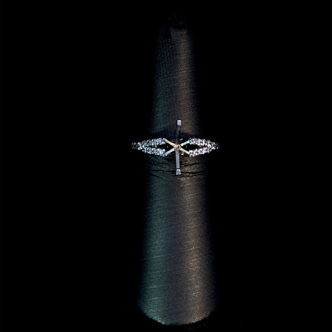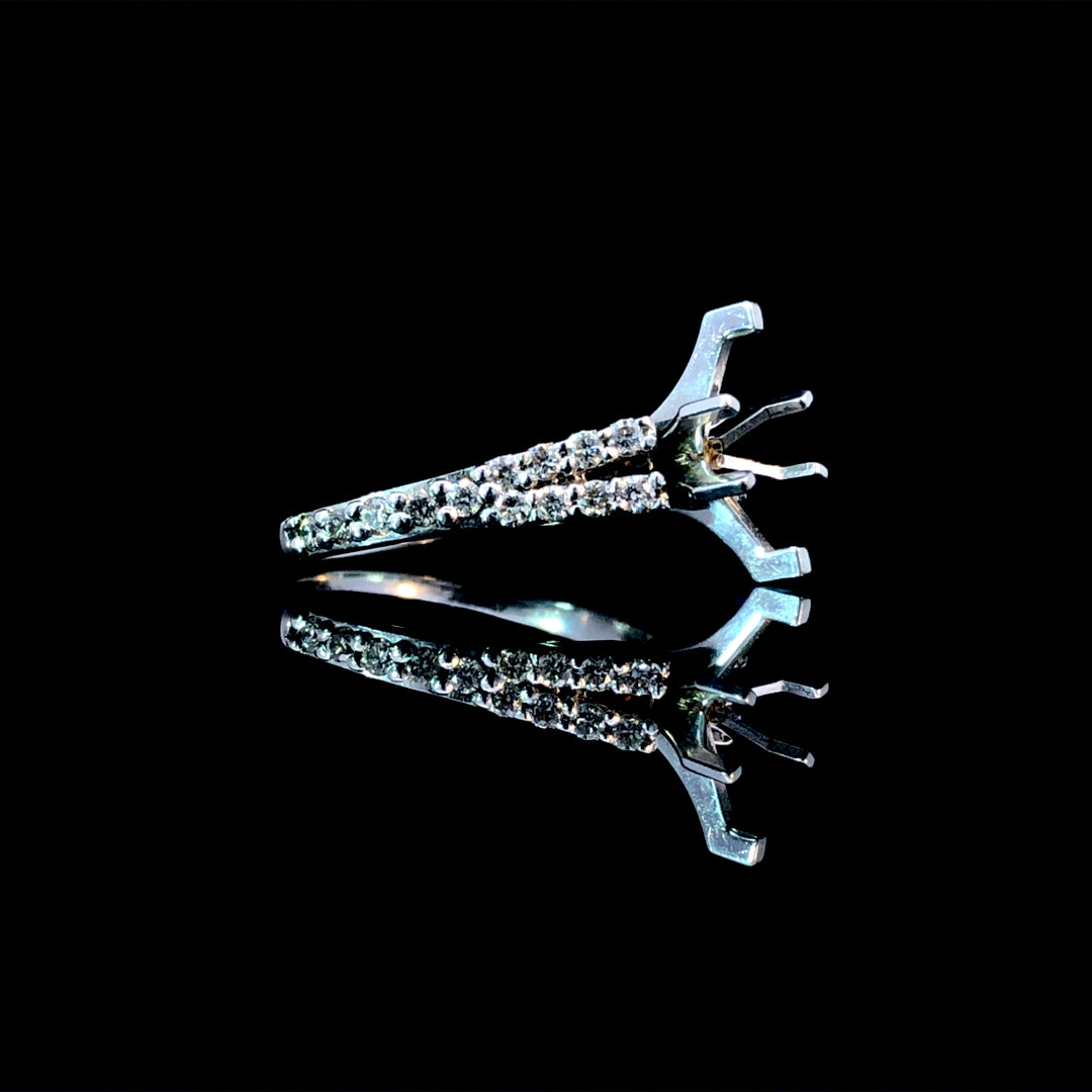 This diamond semi mount provides a beautiful foundation to showcase any shape or size center stone from our exceptional collection of loose diamonds. Crafted in 14kt white gold, its split shank design sparkles with .41ctw of round diamonds, enhancing the brilliance and elegance of your chosen stone. Designed to support and complement your perfect center, this setting helps you create a truly personalized and stunning piece. Price is for the semi mount only. Center stone will be added at an additional cost. This ring is a size 6. If that size is not a perfect fit, first time sizing is free at the time of purchase. Additional sizing fees may apply.