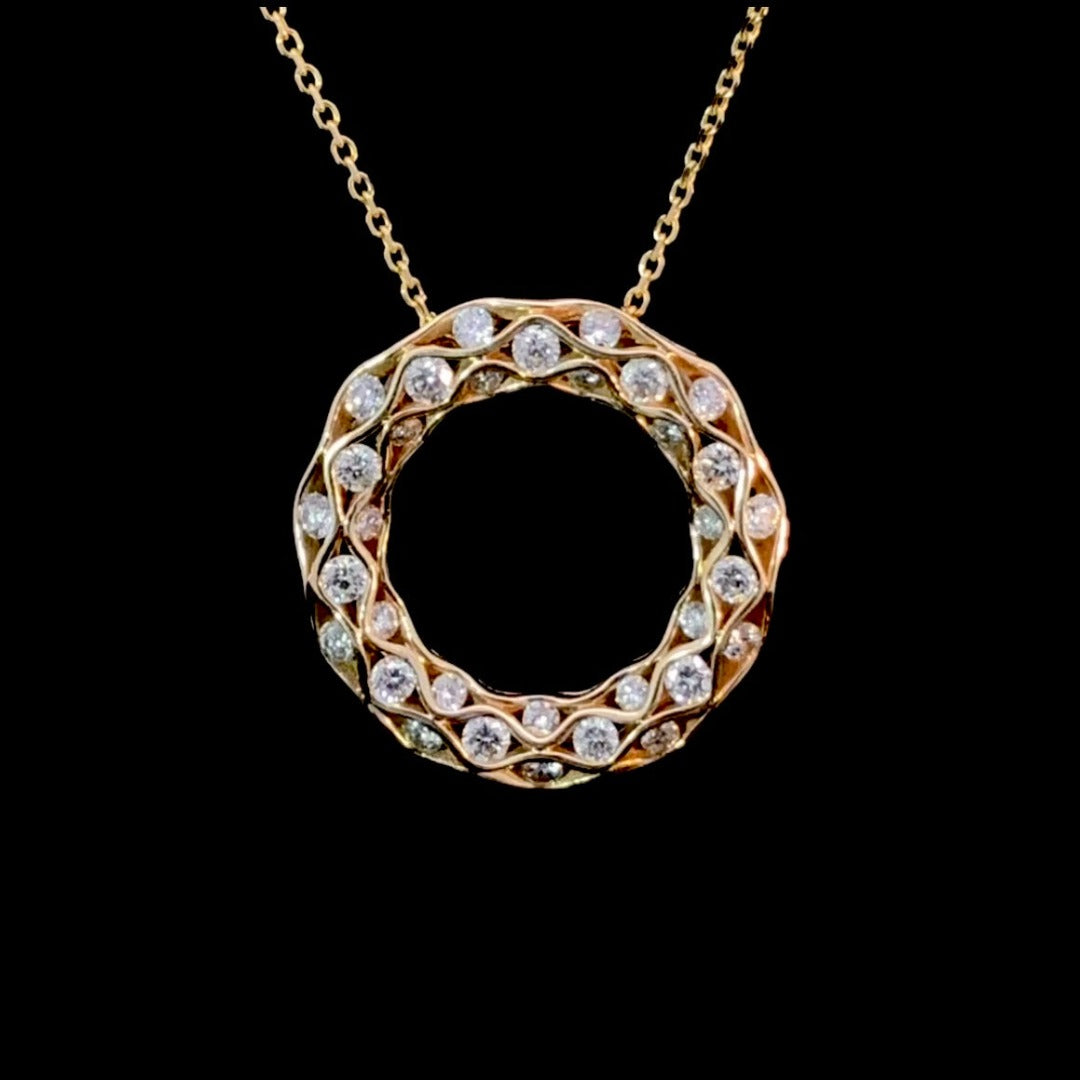 This luxurious 14. kt yellow gold circle pendant is exquisitely crafted with a swirl design and embedded with 1.00 ctw of glimmering diamonds, creating a mesmerizing and timeless piece of fine jewelry. With its spellbinding beauty, this pendant is sure to make a statement. Chain is not included.