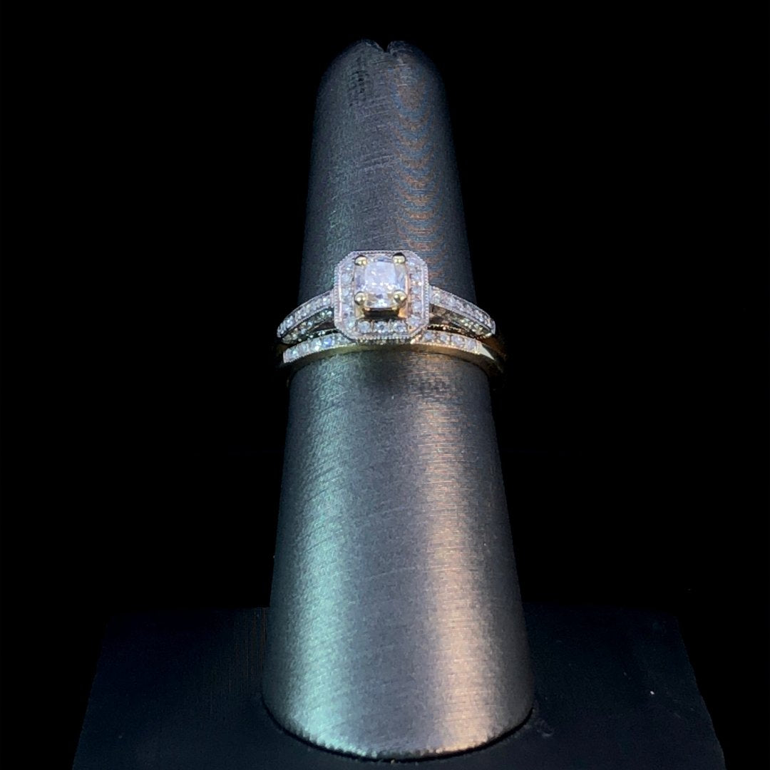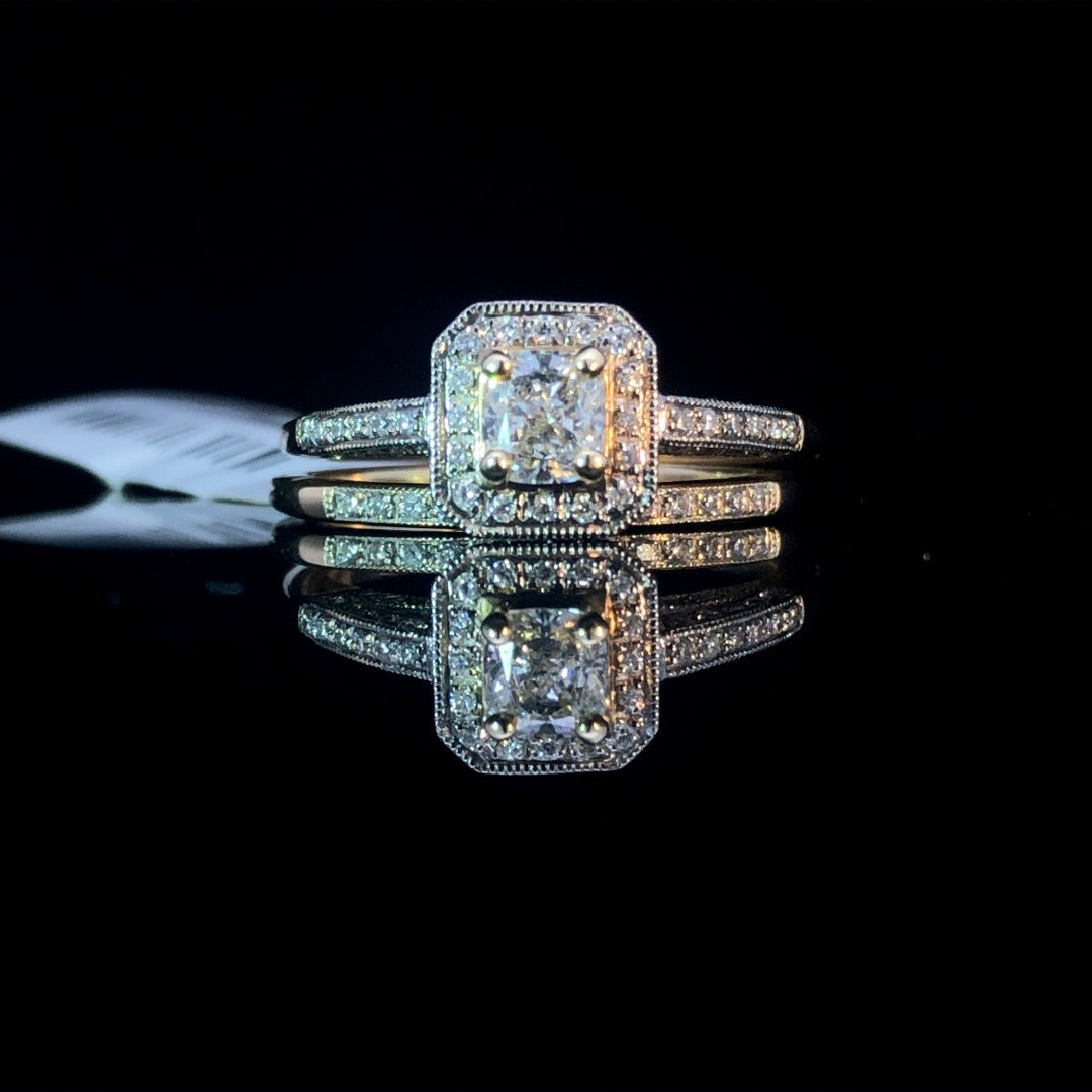 Capture your unique love story with this stunning diamond ring set. This design features a .50 carat cushion cut diamond center, surrounded by brilliant diamonds and milgrain detailing, all set in luxurious 14 karat yellow gold. The matching diamond wedding band completes the set for a total diamond weight of .95ctw. Be the light of your beloved's life with this exquisite symbol of love.