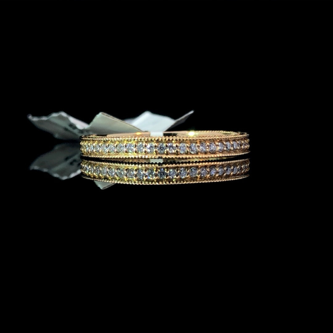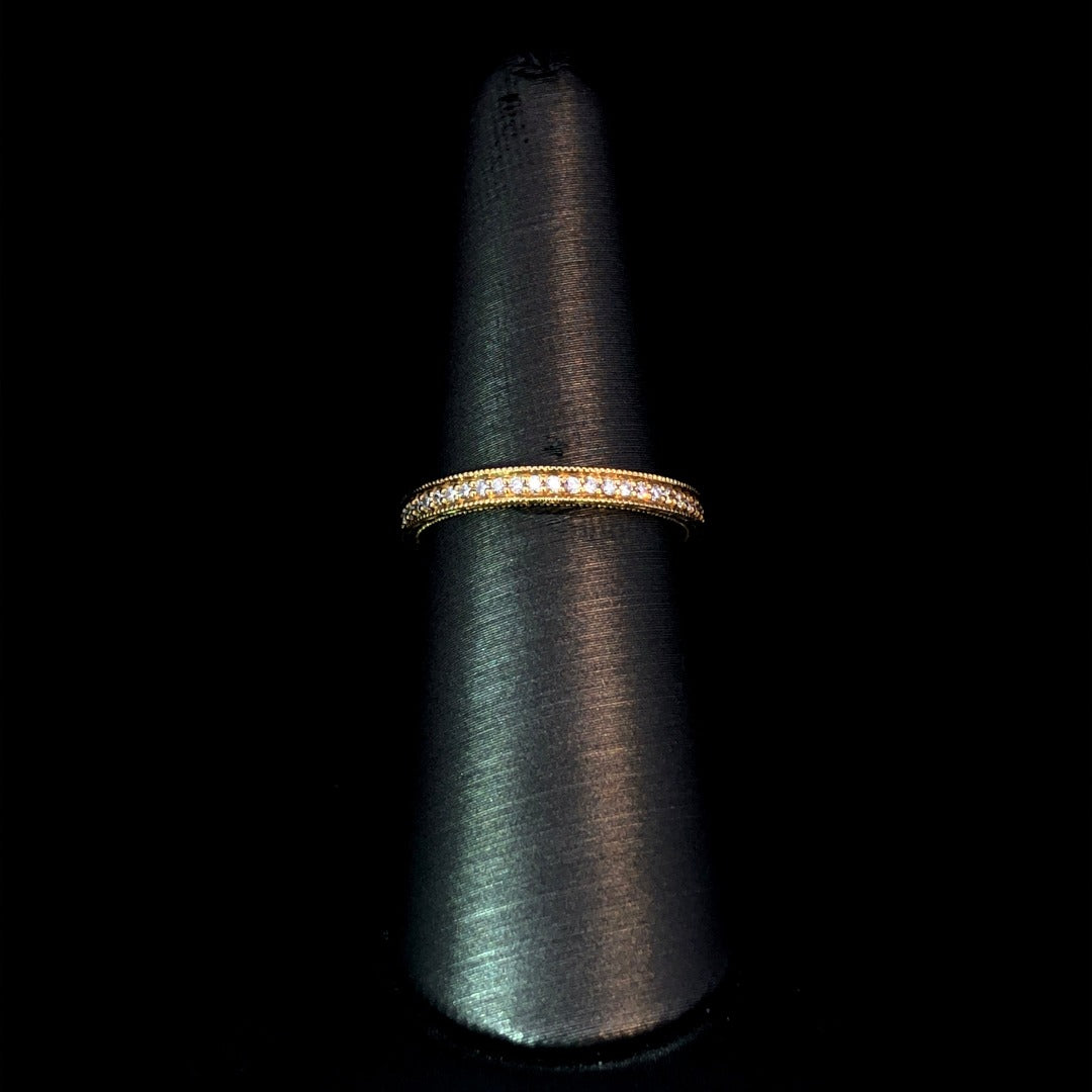 Indulge in the charm of this exquisite diamond band. Crafted in 14kt yellow gold, it boasts .23ctw of sparkling round diamonds and delicate milgrain details. Complete your luxurious look with this captivating piece. This ring is a size 7. If that size is not a perfect fit, first time sizing is free at the time of purchase. Additional sizing fees may apply.