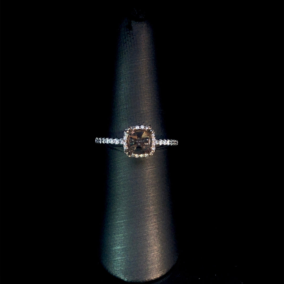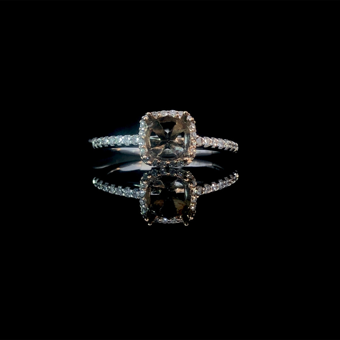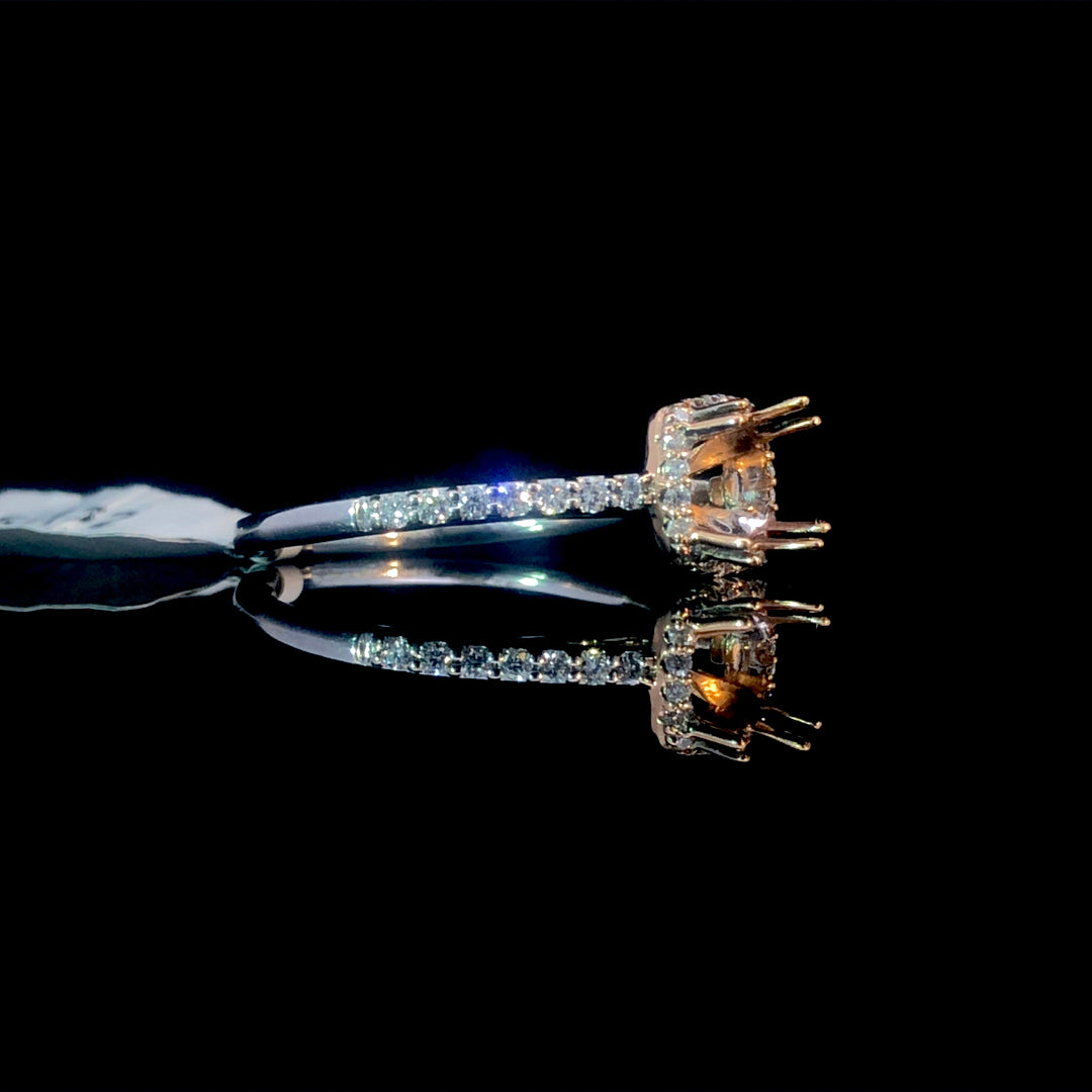 This exquisite 14kt two-tone semi mount features a rose gold head adorned with a diamond halo, complemented by diamonds gracefully cascading down the white gold band. With a total of .31ctw of round diamonds, it offers a dazzling shimmer. Personalize this elegant design by selecting your ideal center stone from our extensive collection of loose stones to create a truly unique piece. Price is for the semi mount only. Center stone will be added at an additional cost. This ring is a size 7. If that size is not a perfect fit, first time sizing is free at the time of purchase. Additional sizing fees may apply.