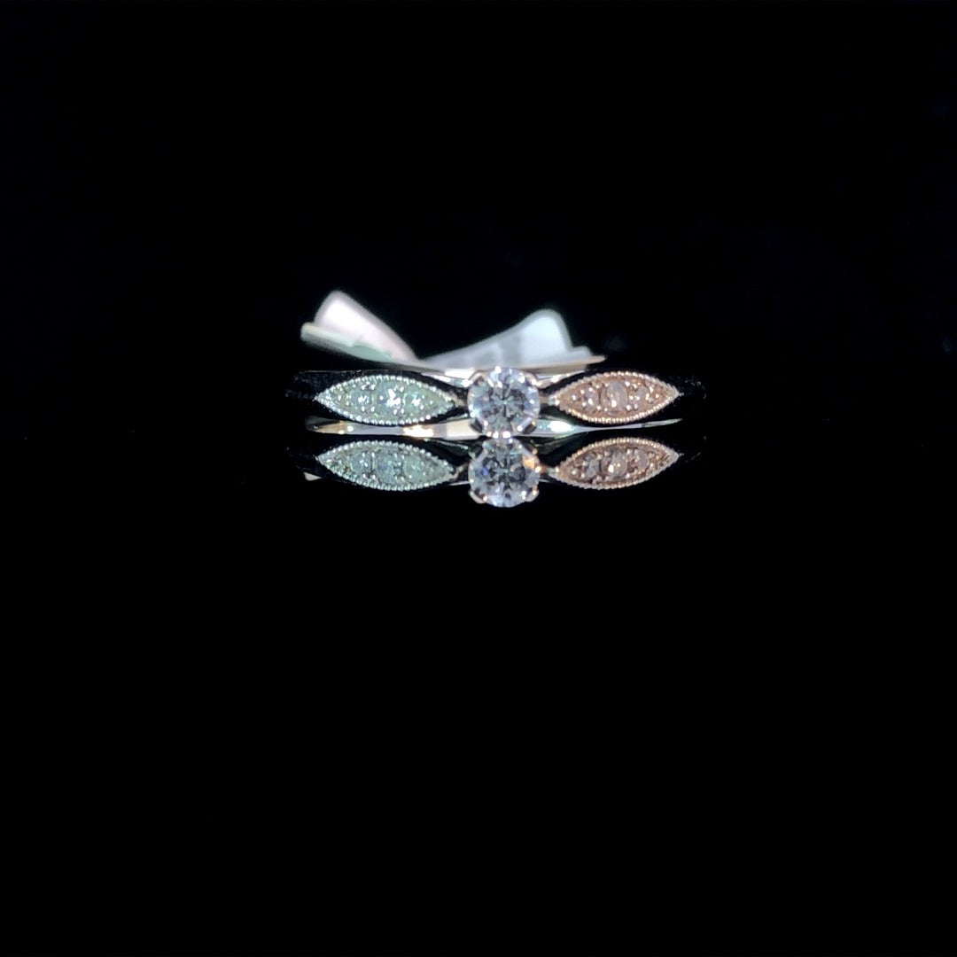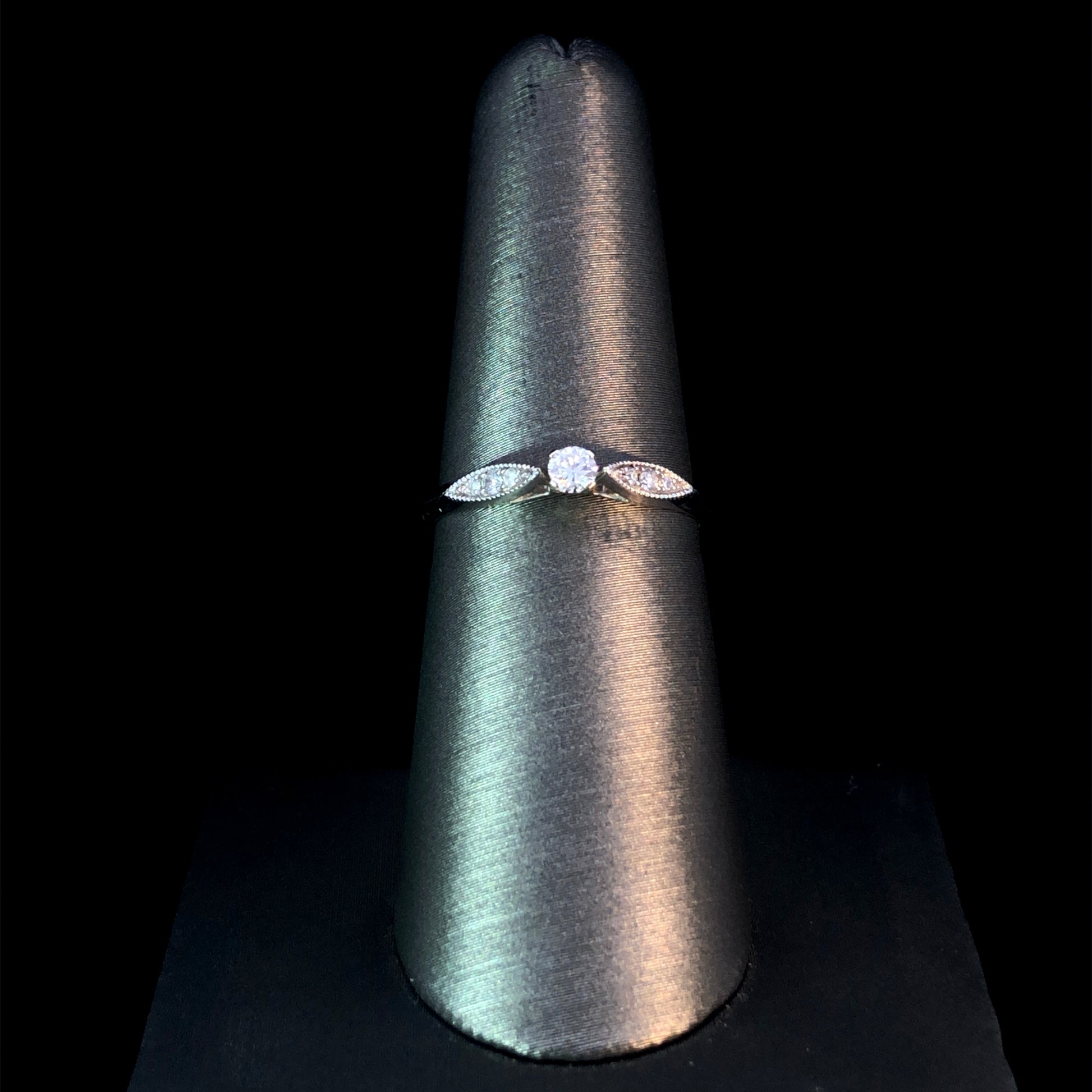 This timeless classic ring sparkles with a bright center diamond and is further enhanced by small accent diamonds in a milgrain design. Crafted in 14kt white gold, it's sure to make your special occasions even more memorable! .16ctw of diamond beauty! This ring is a size 7.25. If that size is not a perfect fit, first time sizing is free at the time of purchase. Additional sizing fees may apply.