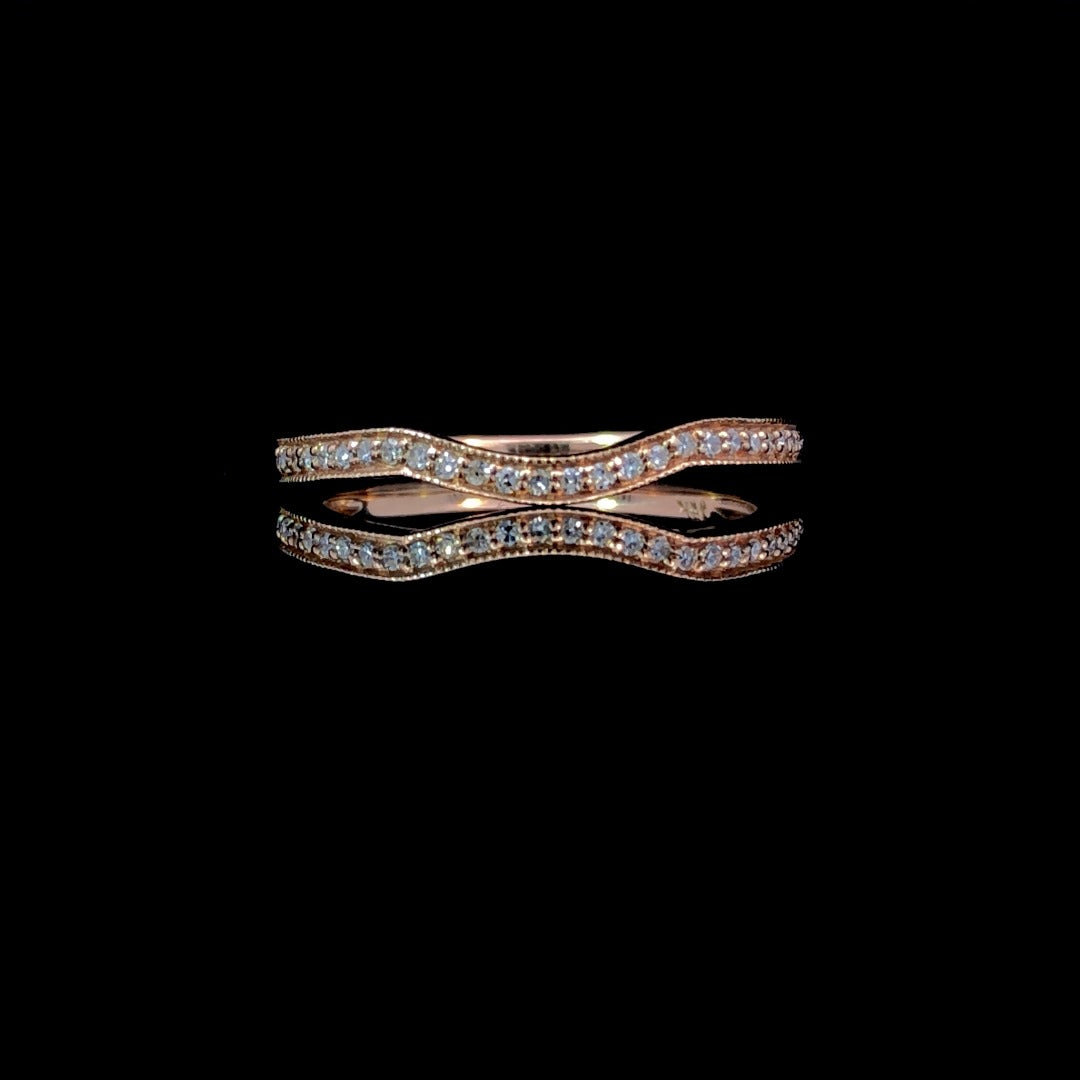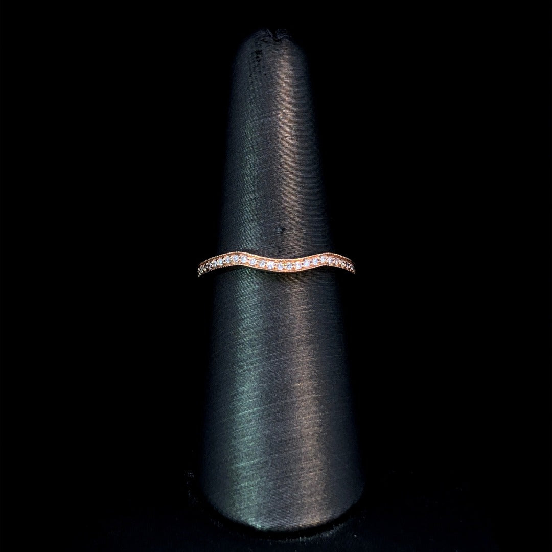 This breathtaking diamond contour band features a delicate curve, .14ctw of sparkling round diamonds, and exquisite 14kt rose gold with elegant milgrain detailing. Its timeless design and subtle elegance will enhance any look and add a touch of luxury to your style. Dare to dazzle with this beautiful piece! This ring is a size 7. If that size is not a perfect fit, first time sizing is free at the time of purchase. Additional sizing fees may apply.