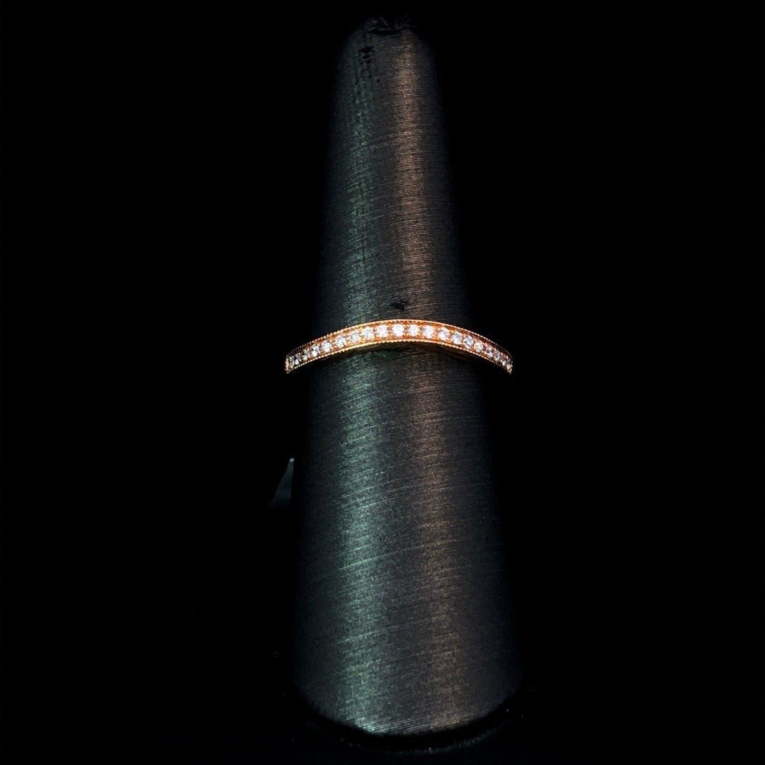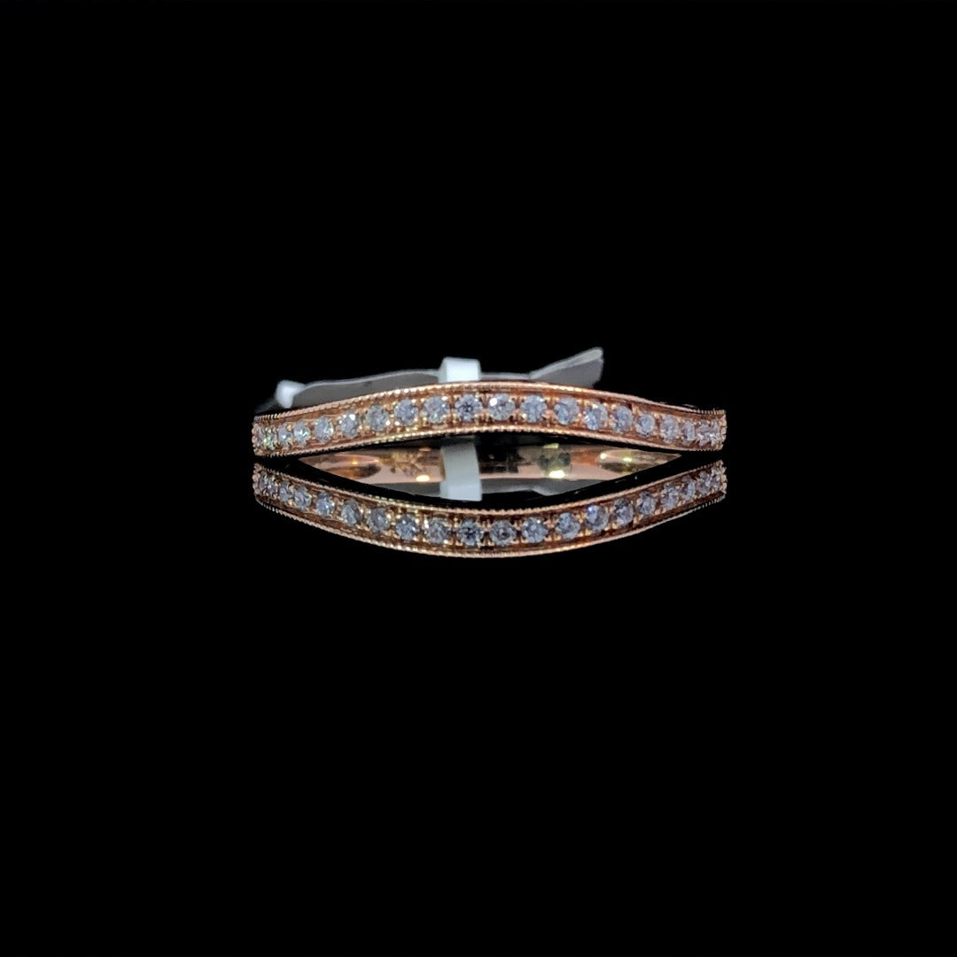 Elevate your style with this beautiful diamond contour band. Crafted in 14kt rose gold, it boasts .14ctw of sparkling round diamonds and intricate etchings. The gentle curve hugs the proportions of your matching engagement ring for a seamless and elegant look. Upgrade to luxury with this exclusive piece. This ring is a size 7. If that size is not a perfect fit, first time sizing is free at the time of purchase. Additional sizing fees may apply.