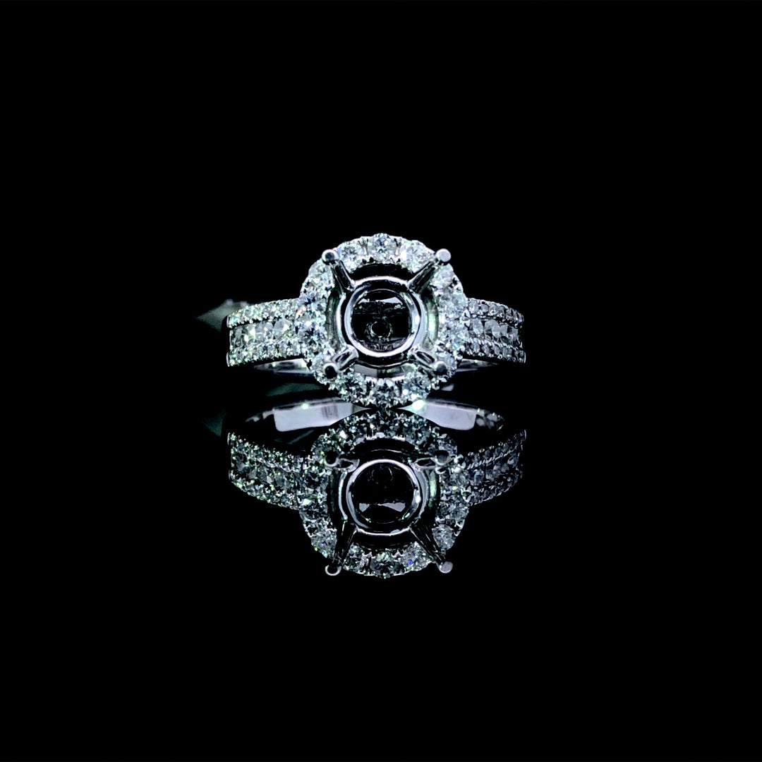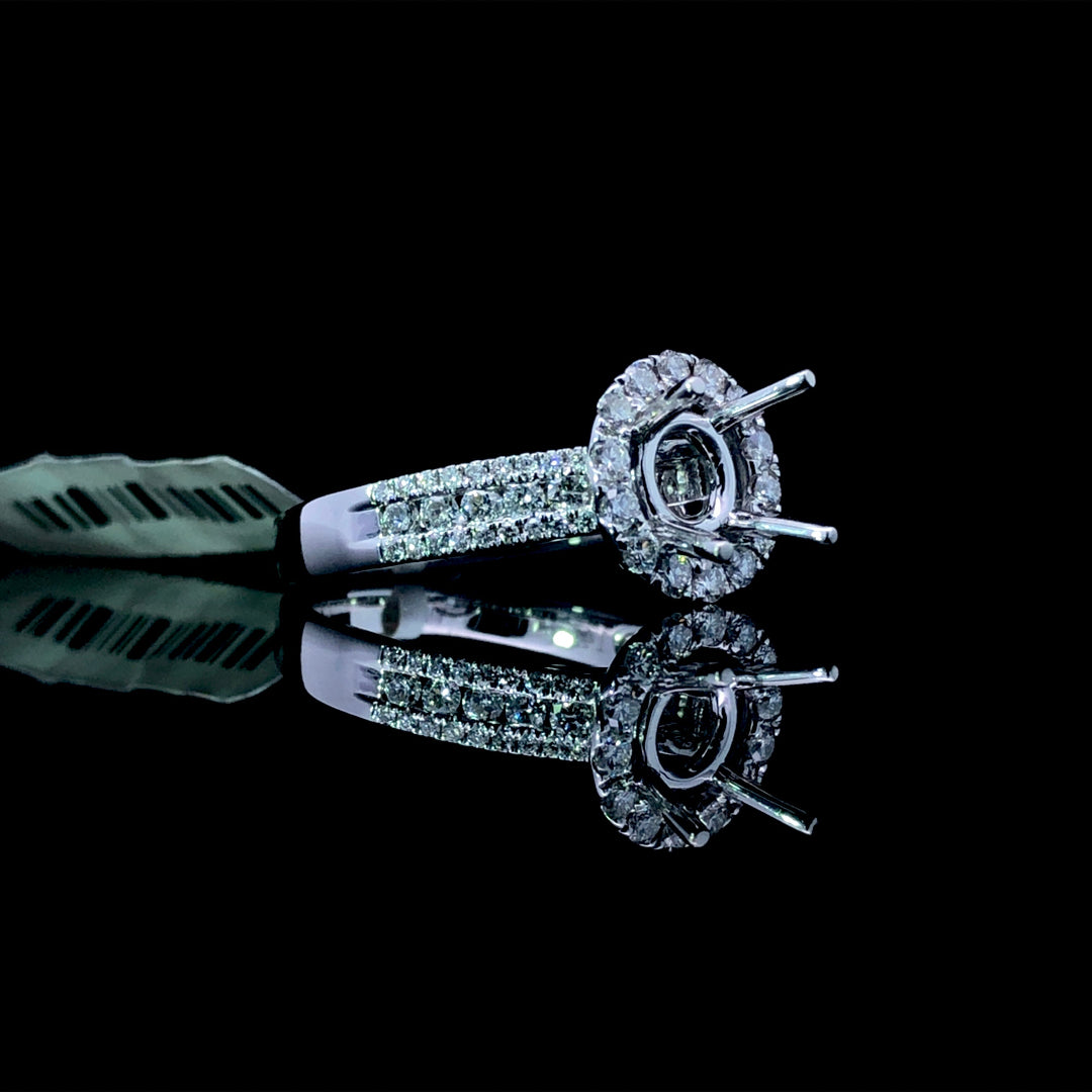 Build your ideal engagement ring with this beautifully designed diamond semi mount. The enchanting round diamond halo creates a luminous frame that surrounds your chosen center stone, while the thoughtfully constructed multi-row band adds dimension and allure. Set in 14kt white gold with .63ctw of sparkling round diamonds, this semi mount gives you the flexibility to express your personal style. Explore our diverse collection of loose stones and discover the perfect match to complete your one-of-a-kind treasure. Price is for the semi mount only. Center stone will be added at an additional cost. This ring is a size 6.5. If that size is not a perfect fit, first time sizing is free at the time of purchase. Additional sizing fees may apply.