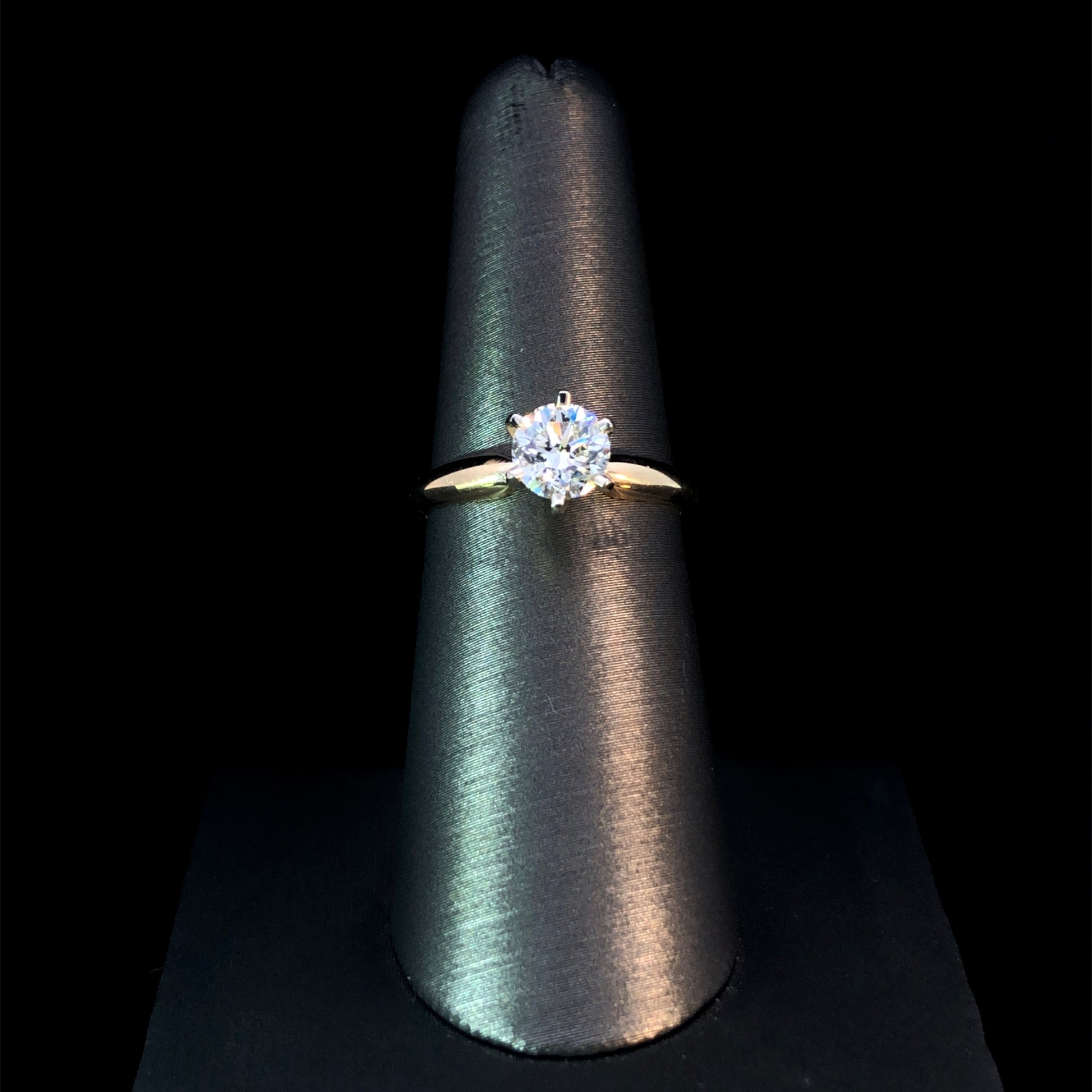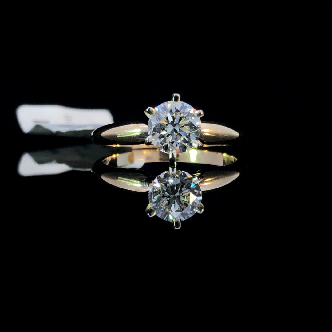 This timeless diamond solitaire ring showcases a magnificent 1.02ct round diamond set in a beautiful white gold head, designed to accentuate the diamond's sparkle. The 14kt yellow gold band adds a touch of elegance to this radiant ring, perfect for any extraordinary occasion! This ring is a size 6.75. If that size is not a perfect fit, first time sizing is free at the time of purchase. Additional sizing fees may apply.