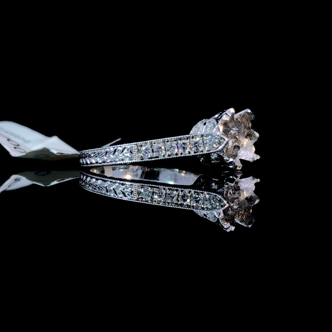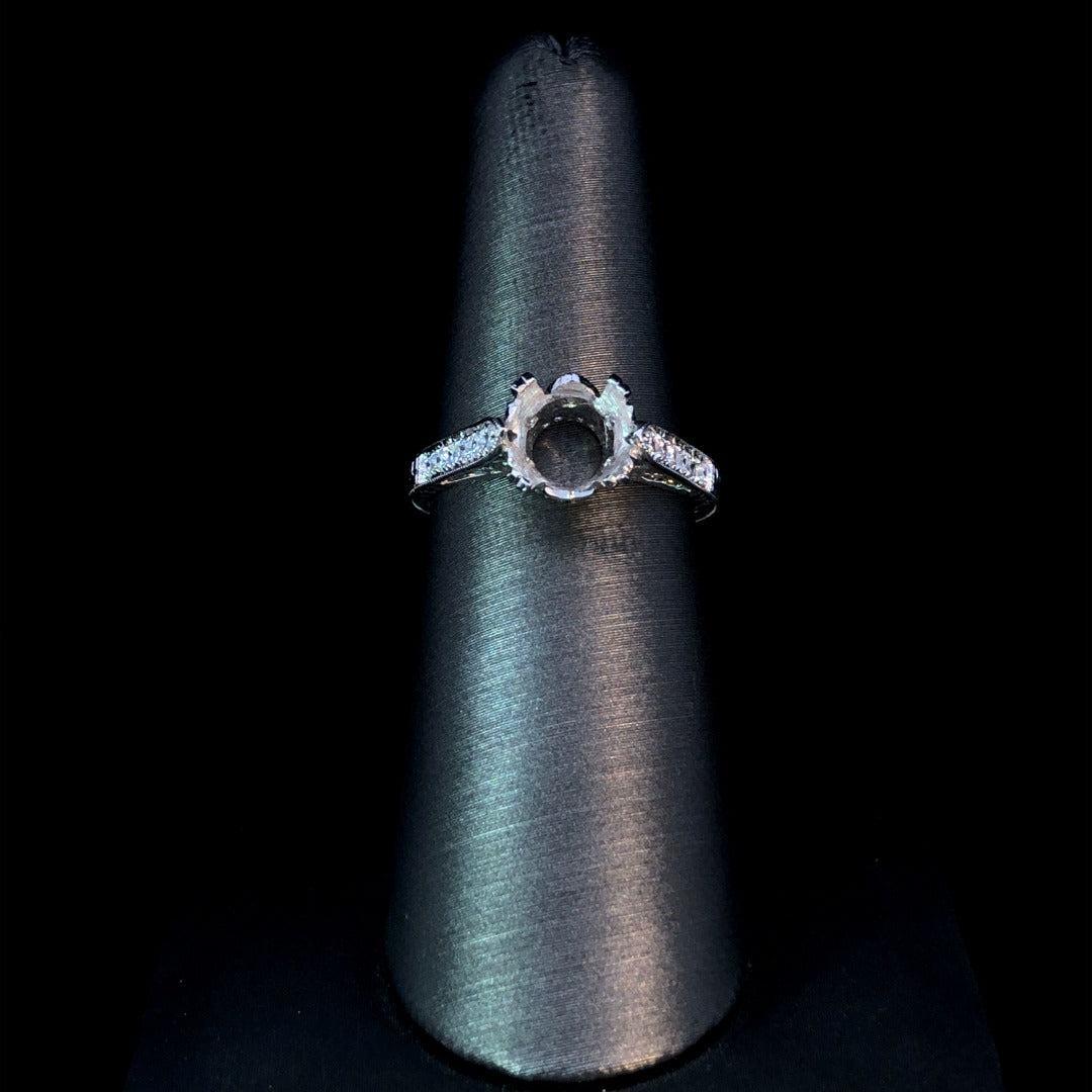 Shine from all sides with our gorgeous diamond semi mount. The regal style decorative head and diamond detailing, along with milgrain and etchings on the 14kt white gold band, make this piece a true treasure. Choose your perfect round center stone from our wide selection for a complete and stunning look! Price is for the semi mount only. Center stone will be added at an additional cost. This ring is a size 6.25. If that size is not a perfect fit, first time sizing is free at the time of purchase. Additional sizing fees may apply.