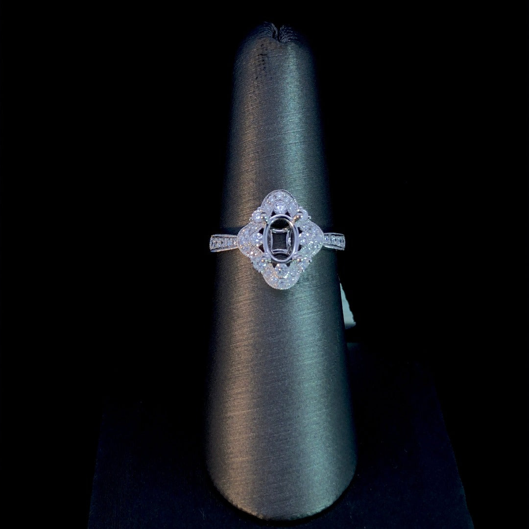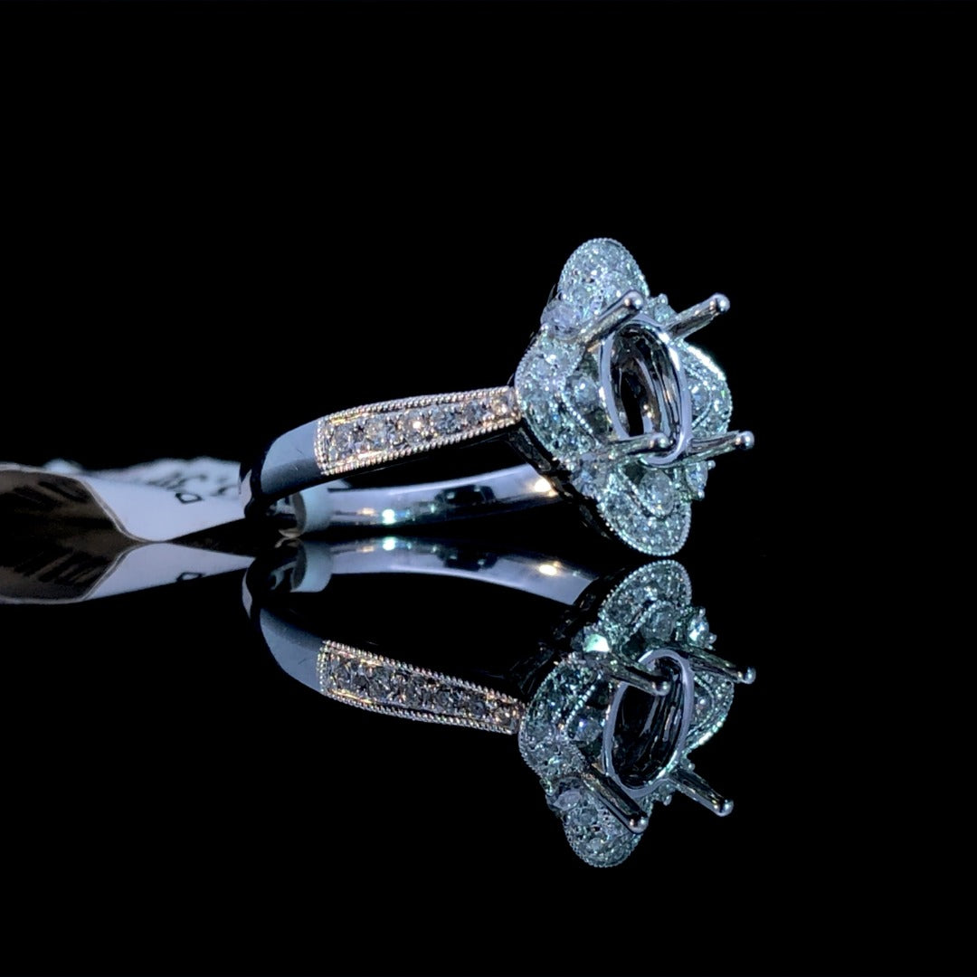 Elevate your style with this gorgeous diamond semi mount. Crafted in 14kt white gold, this exquisite piece features a decorative oblong halo design with delicate milgrain detailing. Adorned with a sparkling total of .42ctw diamonds, this semi mount allows you to choose your own center stone from our stunning selection. Make a statement with this luxurious and timeless design. Price is for the semi mount only. Center stone will be added at an additional cost. This ring is a size 6.5. If that size is not a perfect fit, first time sizing is free at the time of purchase. Additional sizing fees may apply.
