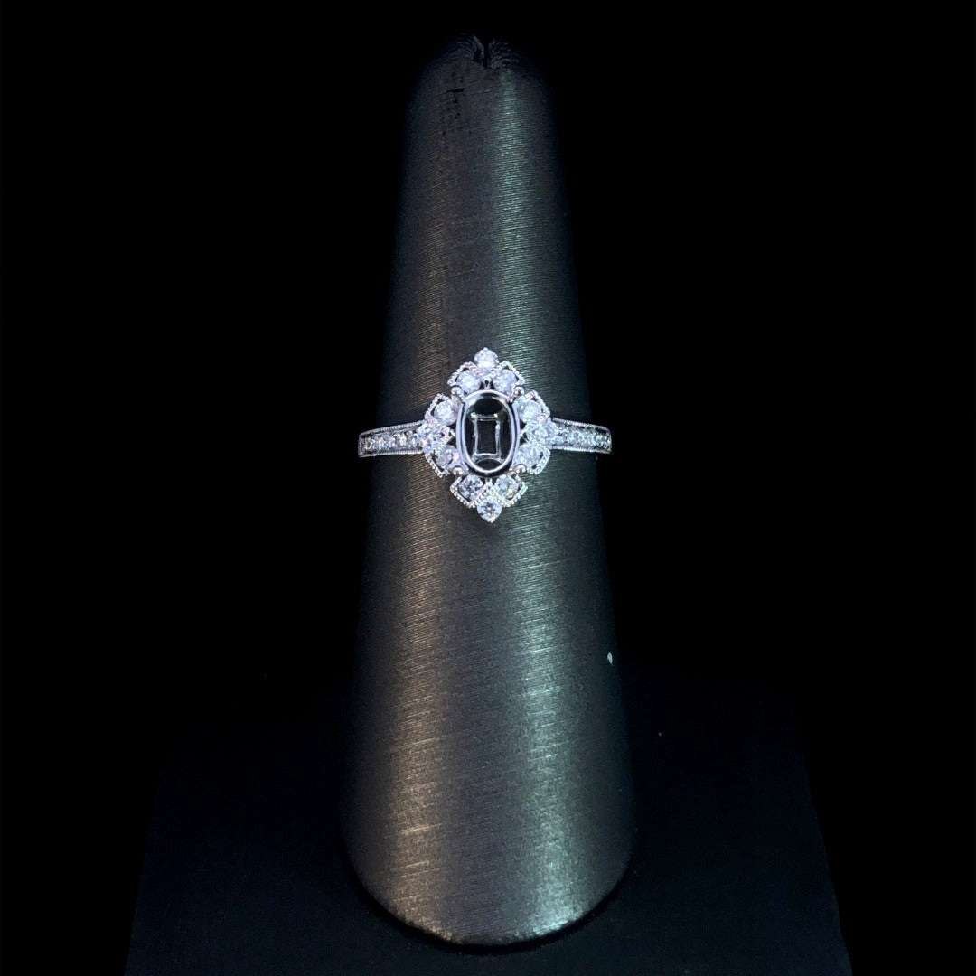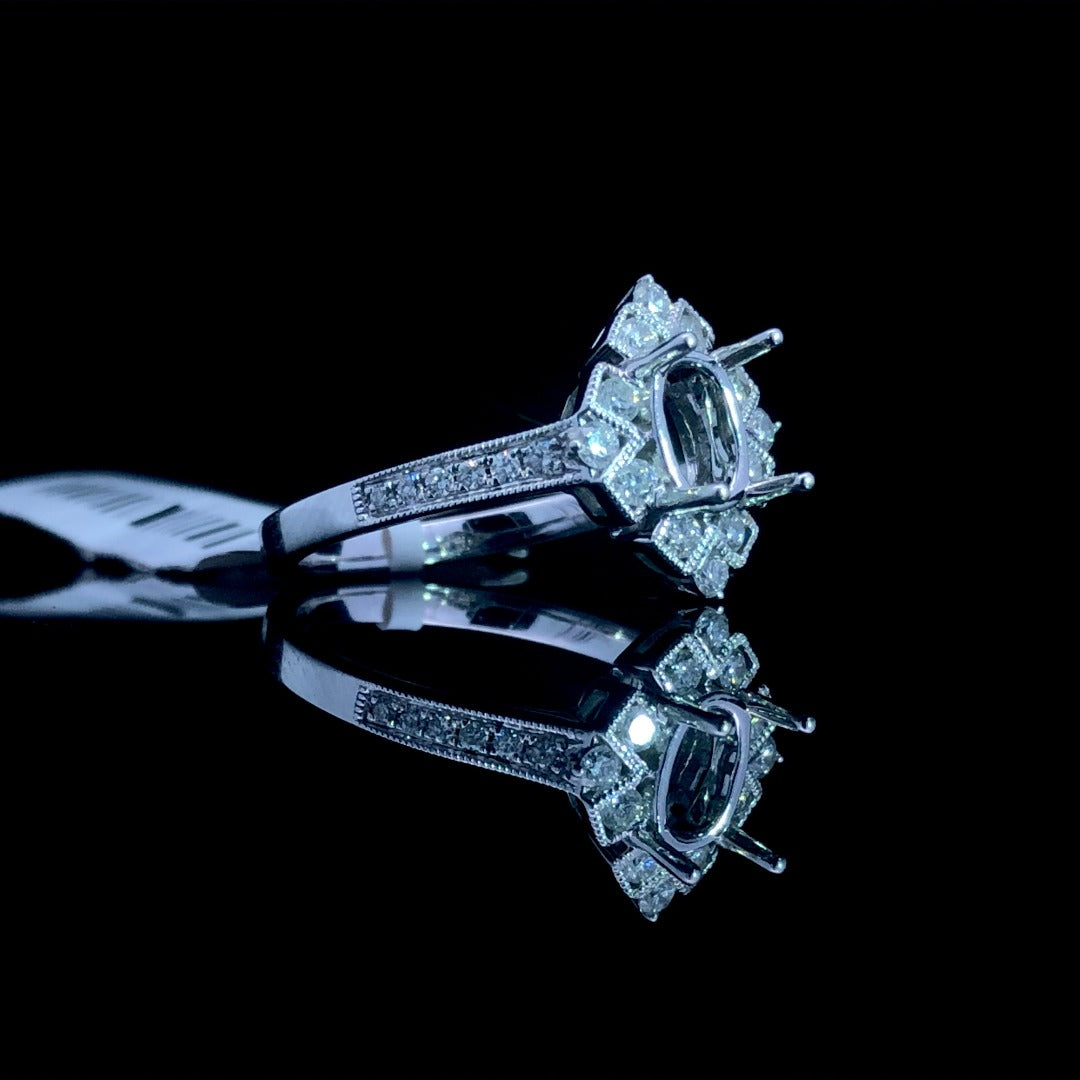Elevate your bridal style with our exquisite diamond semi mount. Designed for the modern bride, this unique piece features a decorative halo surrounding the oval center stone of your choosing. With a vintage touch and sparkling diamonds adorning the band, this 14kt white gold setting boasts a total diamond weight of .41ctw. Price is for the semi mount only. Center stone will be added at an additional cost. This ring is a size 6.5. If that size is not a perfect fit, first time sizing is free at the time of purchase. Additional sizing fees may apply.