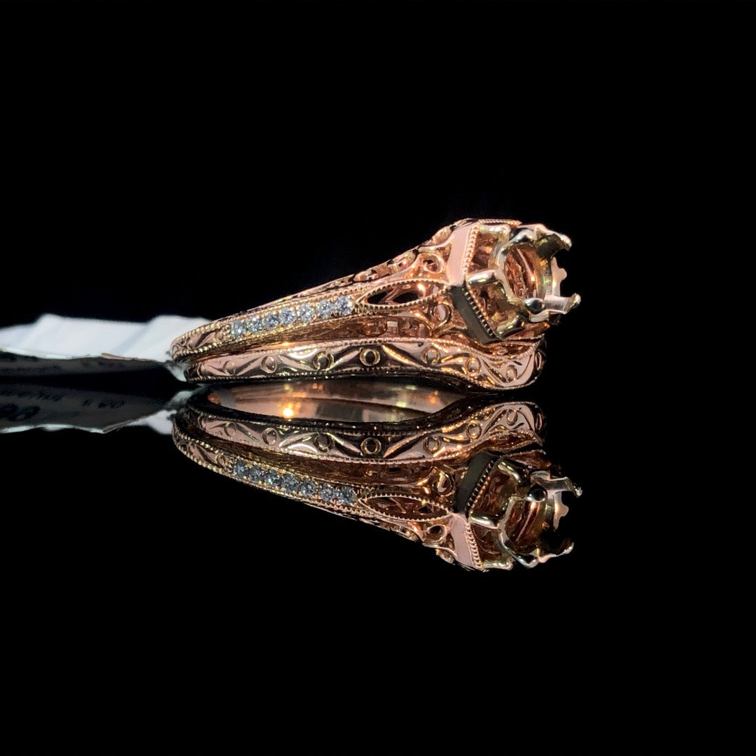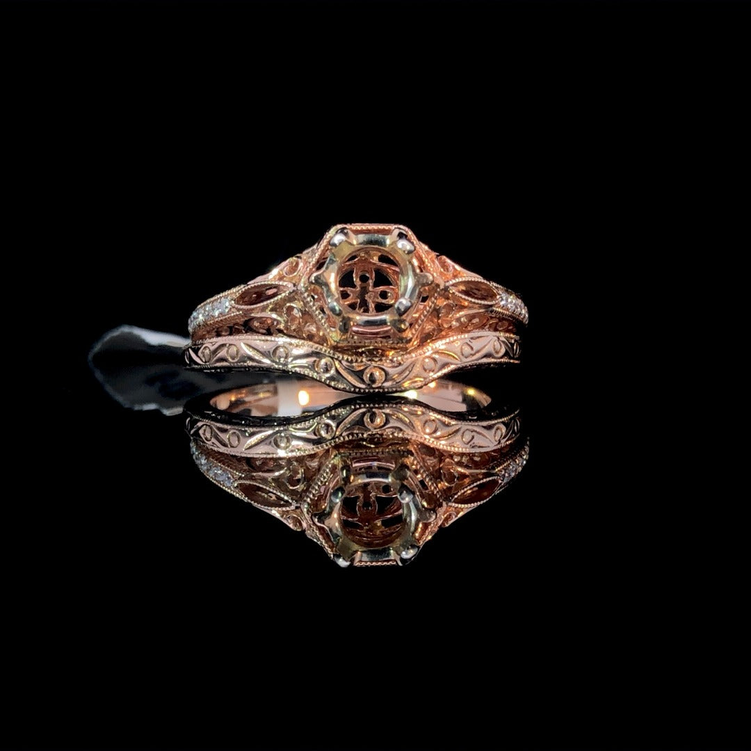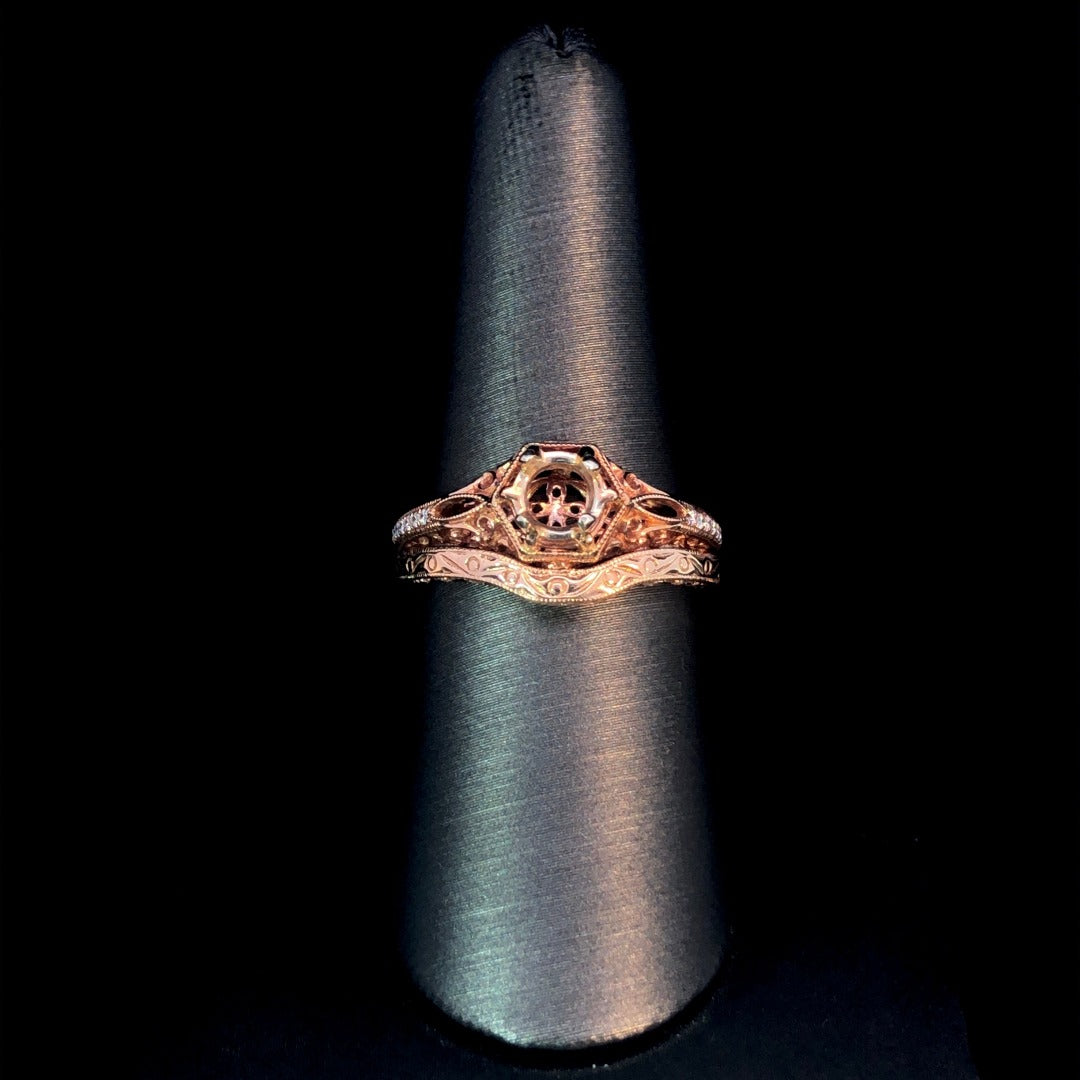 Elevate your engagement ring game with this intricate and unique 14kt rose gold diamond semi mount and band set. Featuring filigree, milgrain, and .13ctw of diamond accents, this set is designed to make your center stone shine even brighter. Make it truly yours by choosing a stone from our unbeatable selection. Price is for the semi mount and band only. Center stone will be added at an additional cost. This ring is a size 7. If that size is not a perfect fit, first time sizing is free at the time of purchase. Additional sizing fees may apply.