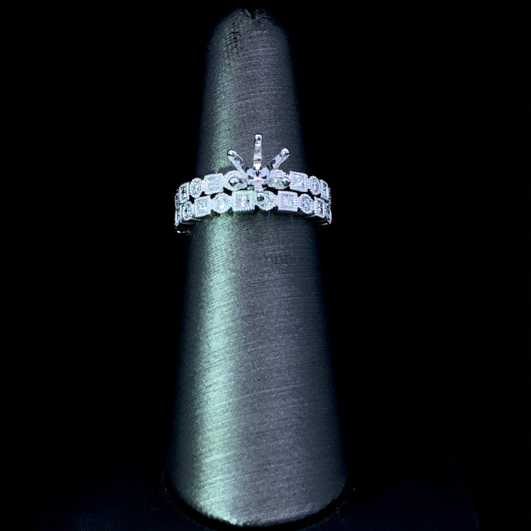 This unique bridal set is a stunning art deco inspired piece of jewelry. Featuring alternating patterns of round and princess cut diamonds with a combined .54ctw and delicate milgrain detailing, you'll make an unforgettable statement on your special day! Price is for the semi mount only. Center stone will be added at an additional cost. This set is a size 6.5. If that size is not a perfect fit, firs time sizing is free at the time of purchase. Additional sizing fees may apply.