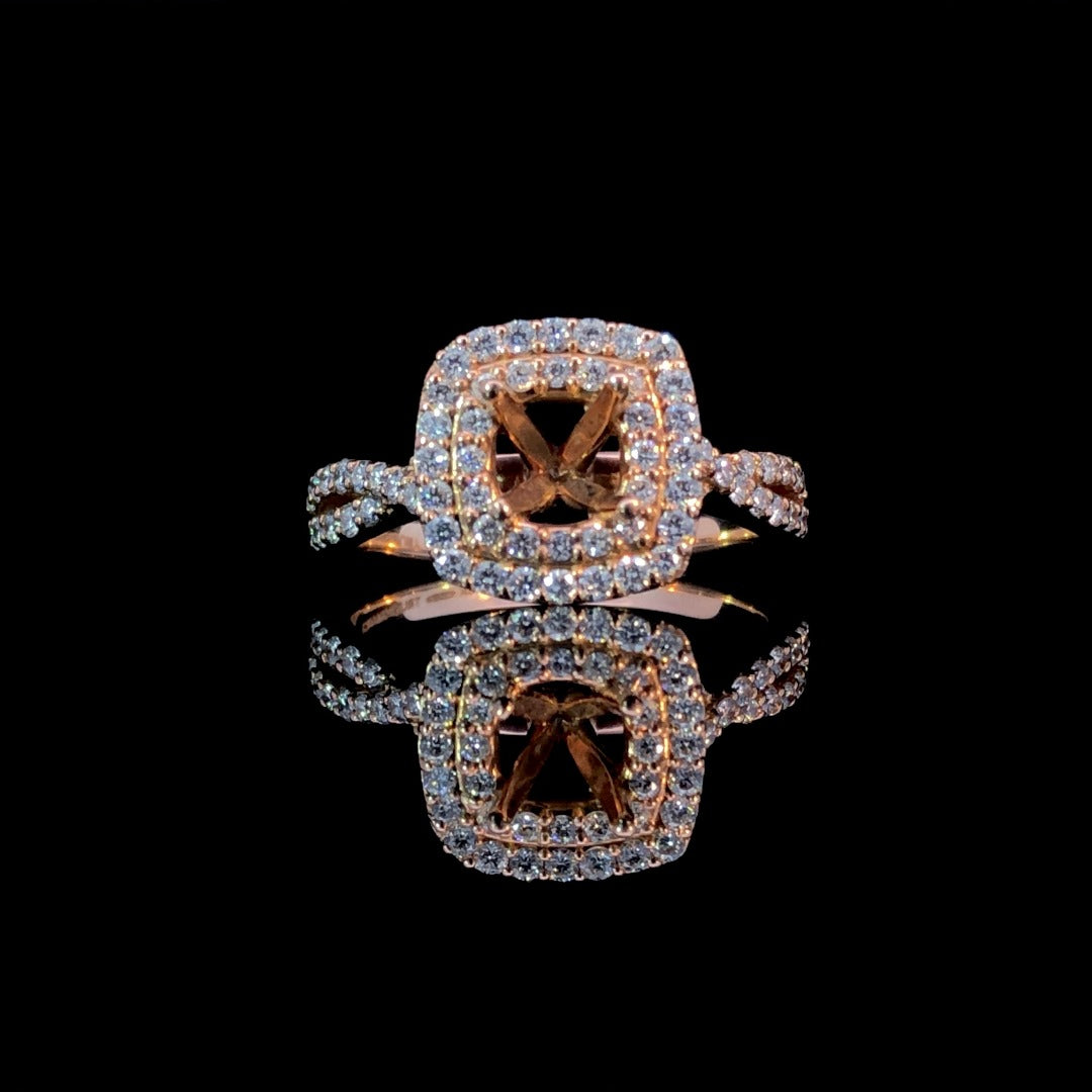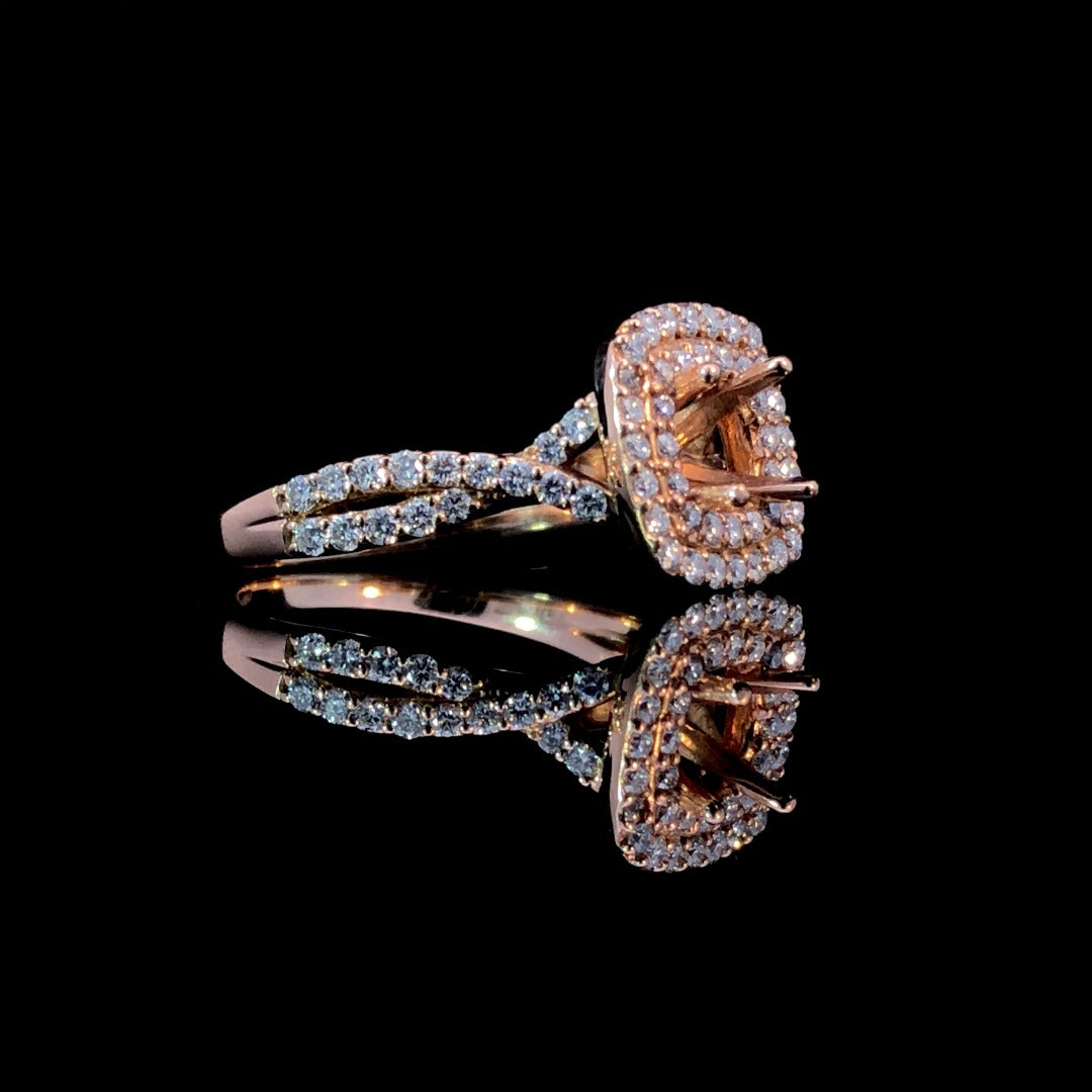 Make a statement with our 14kt rose gold semi mount ring featuring a double halo design and a twisted band adorned with sparkling round diamonds. With .68ctw of diamonds, this ring captures attention wherever you go. Customize it with your choice from our wide selection of loose stones for a truly unique piece. Price is for the semi mount only. Center stone will be added at an additional cost. This ring is a size 7. If that size is not a perfect fit, first time sizing is free at the time of purchase. Additional sizing fees may apply.