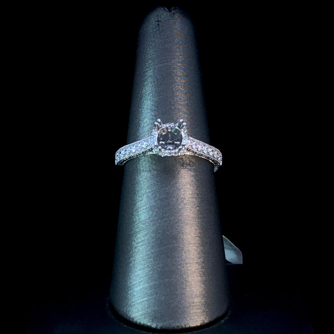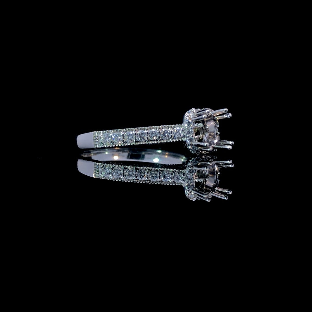 This classic diamond semi-mounting is a timeless ode to luxury and sophistication. Crafted in 14kt white gold, the halo design and milgrain detailing lend timeless elegance, while the .28ctw of round diamonds create a sparkling elegance. Radiate sophistication and understated glamour with this exclusive piece. Price is for the semi mount only. Center stone will be added at an additional cost. This ring is a size 7. If that size is not a perfect fit, first time sizing is free at the time of purchase. Additional sizing fees may apply.