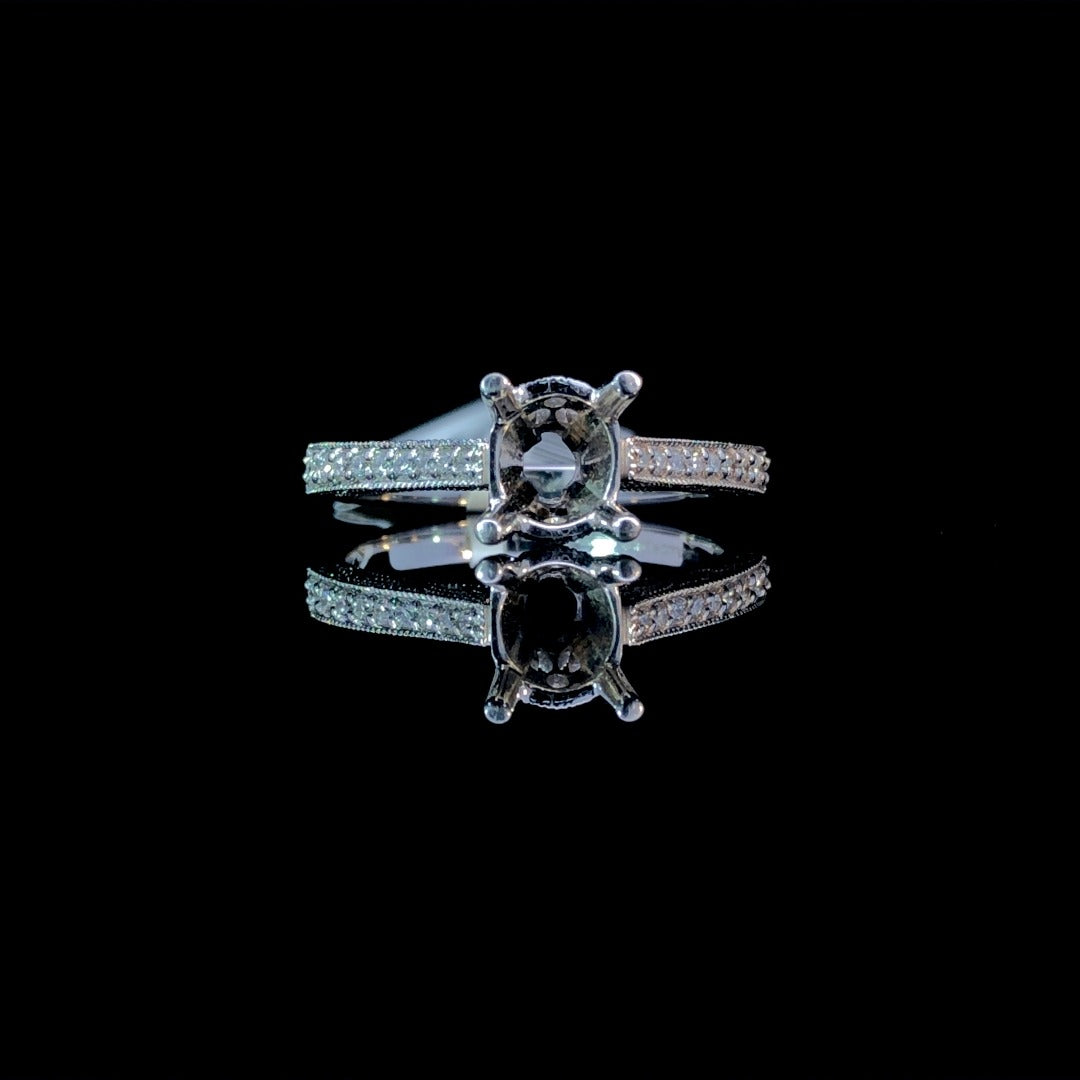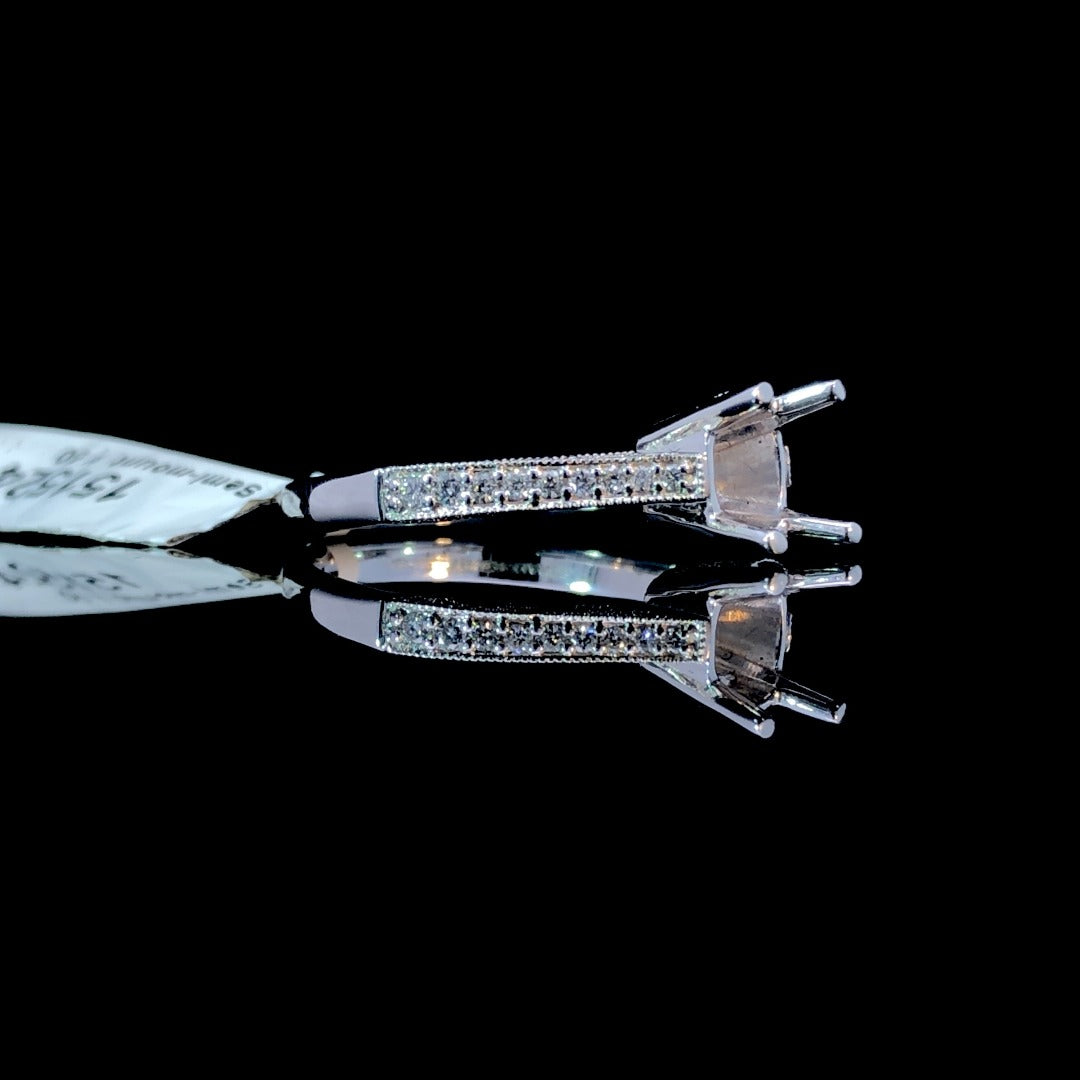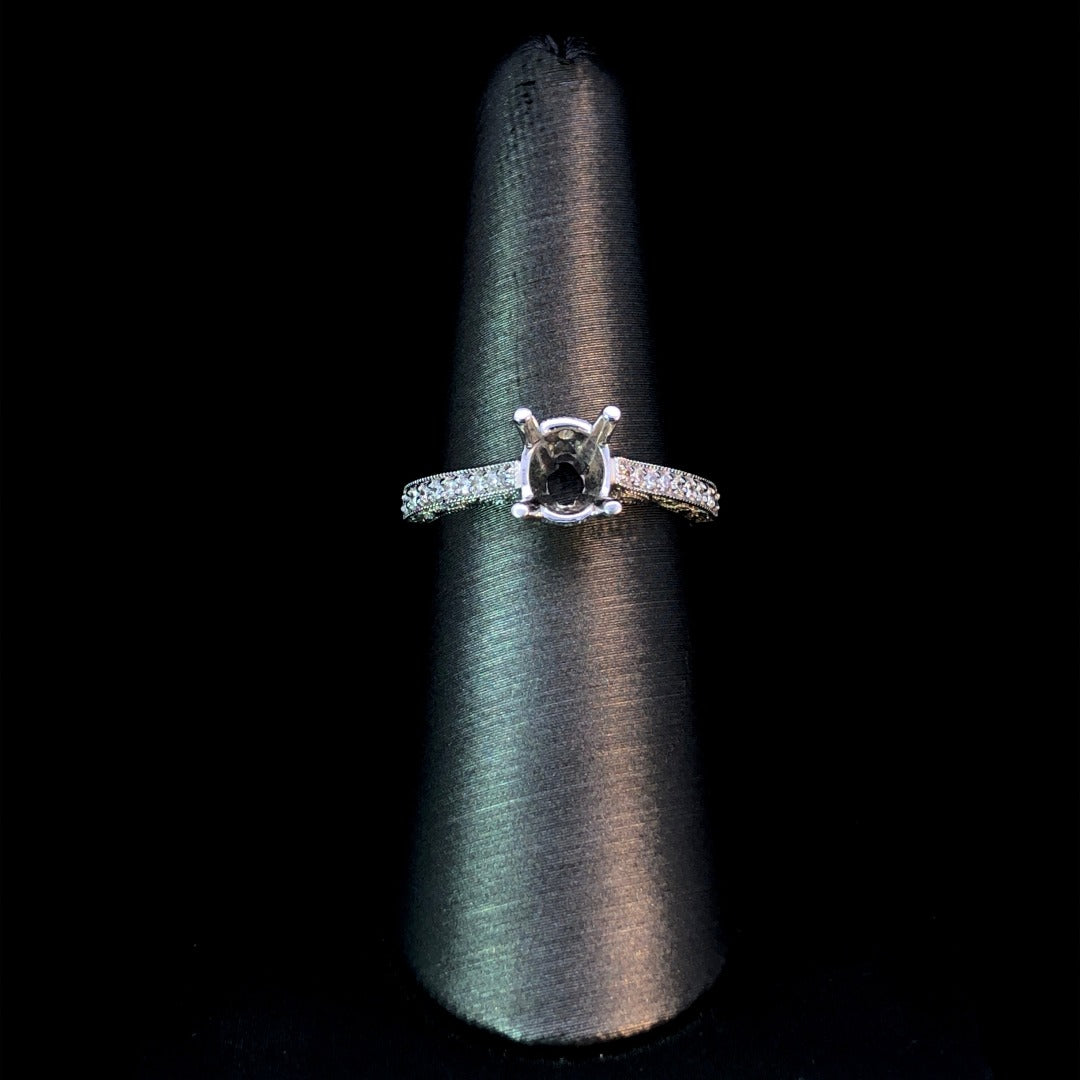 Elevate your style with this stunning diamond semi mount. Its classic design paired with intricate details and .14ctw of round diamonds on the band promises to make a lasting impression. Express your individuality by selecting the perfect oval center stone from our wide range of options. Price is for the semi mount only. Center stone will be added at an additional cost. This ring is a size 7. If that size is not a perfect fit, first time sizing is free at the time of purchase. Additional sizing fees may apply.