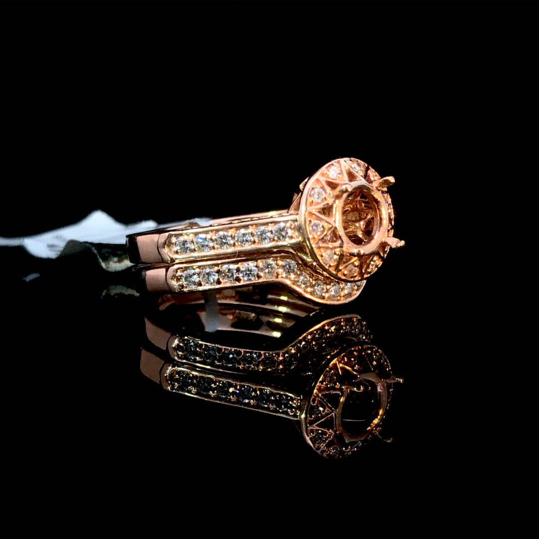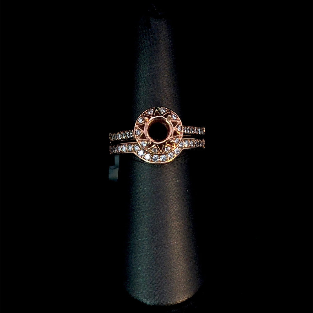 This 14kt rose gold bridal set includes a diamond semi-mount engagement ring featuring a round decorative halo and diamond accents along the band. It pairs seamlessly with a matching curved diamond contour wedding band, together showcasing 0.50ctw of round diamonds. Personalize this elegant set by choosing your own center stone from our extensive loose stone collection for a timeless and refined finish. Price is for the semi and band only. Center stone will be added at an additional cost. This set is a size 7. If that size is not a perfect fit, first time sizing is free at the time of purchase.
