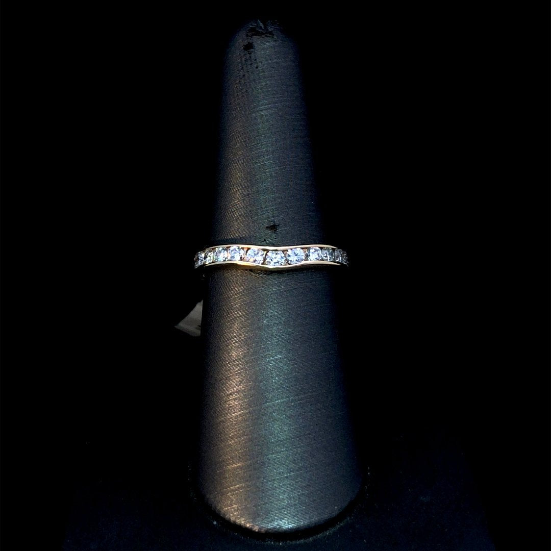 Elevate your style with this classic diamond contour band. Crafted with 14kt yellow gold, this band boasts a stunning .71ctw of round diamonds for a touch of elegance. Perfect for any occasion, this band is the epitome of timeless beauty and sophistication. Upgrade your jewelry collection today. This ring is a size 7. If that size is not a perfect fit, first time sizing is free at the time of purchase. Additional sizing fees may apply.