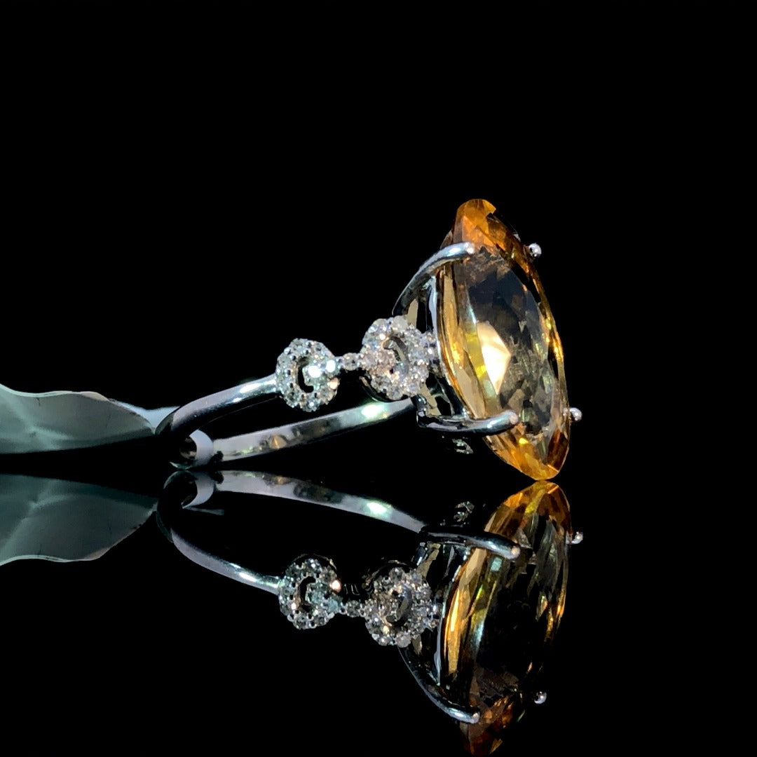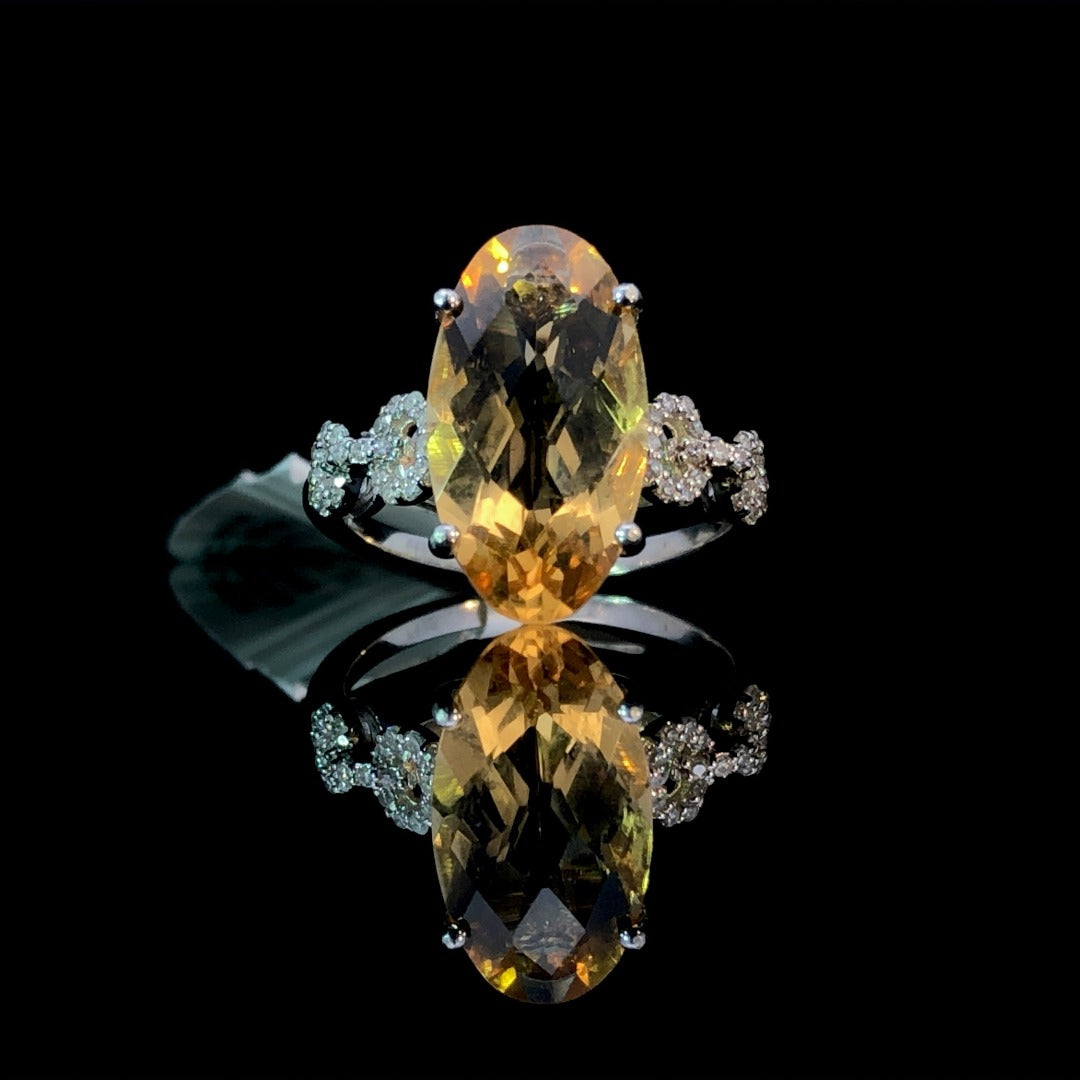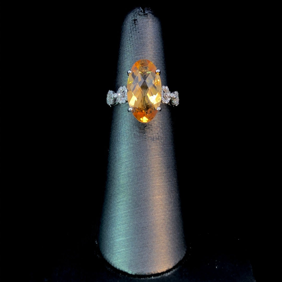 Indulge in luxury with this stunning ring. A 3.50ct oval Citrine commands attention at the center, while .13ctw of round diamond accents sparkle on either side. Set in 14kt white gold, this ring exudes elegance and opulence. This ring is a size 5. If that size is not a perfect fit, first time sizing is free at the time of purchase. Additional sizing fees may apply.