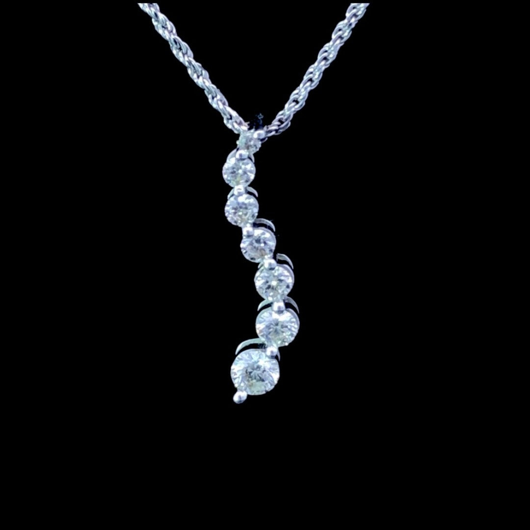Crafted in luxurious 14kt white gold, this exquisite pendant features a journey of .49ctw diamonds, sparkling luminously against your skin. Perfect for any stylish occasion, let this exquisite pendant be your accessorizing companion. Chain is not included.
