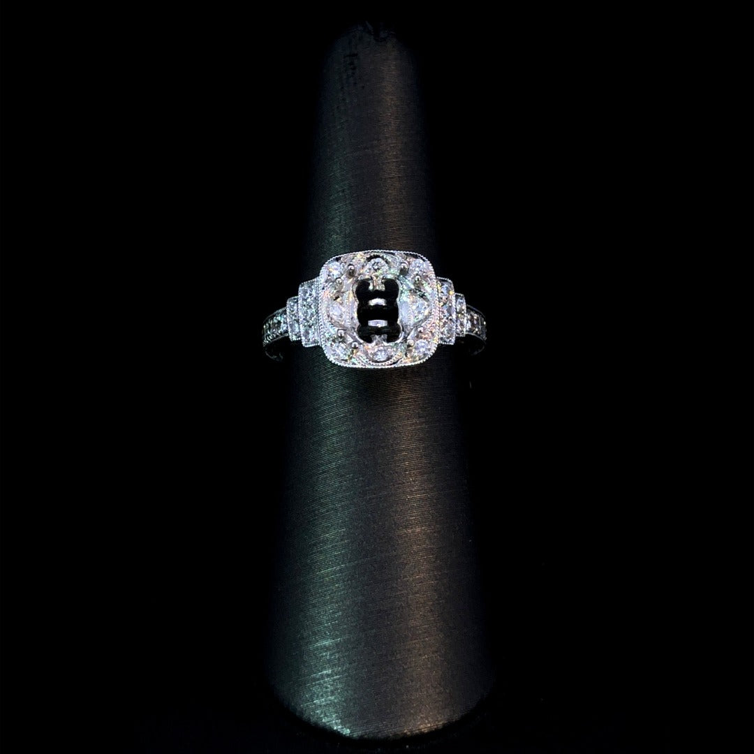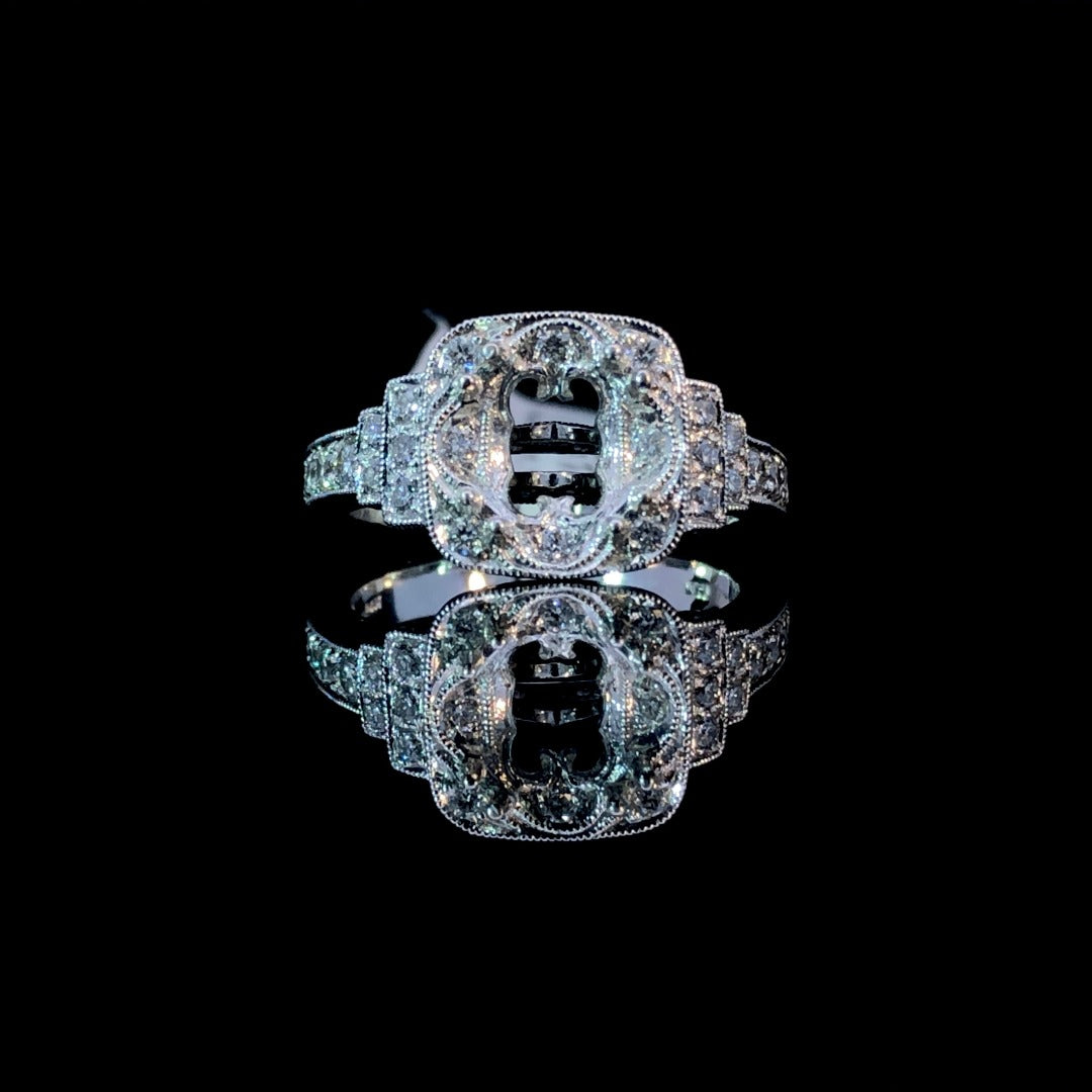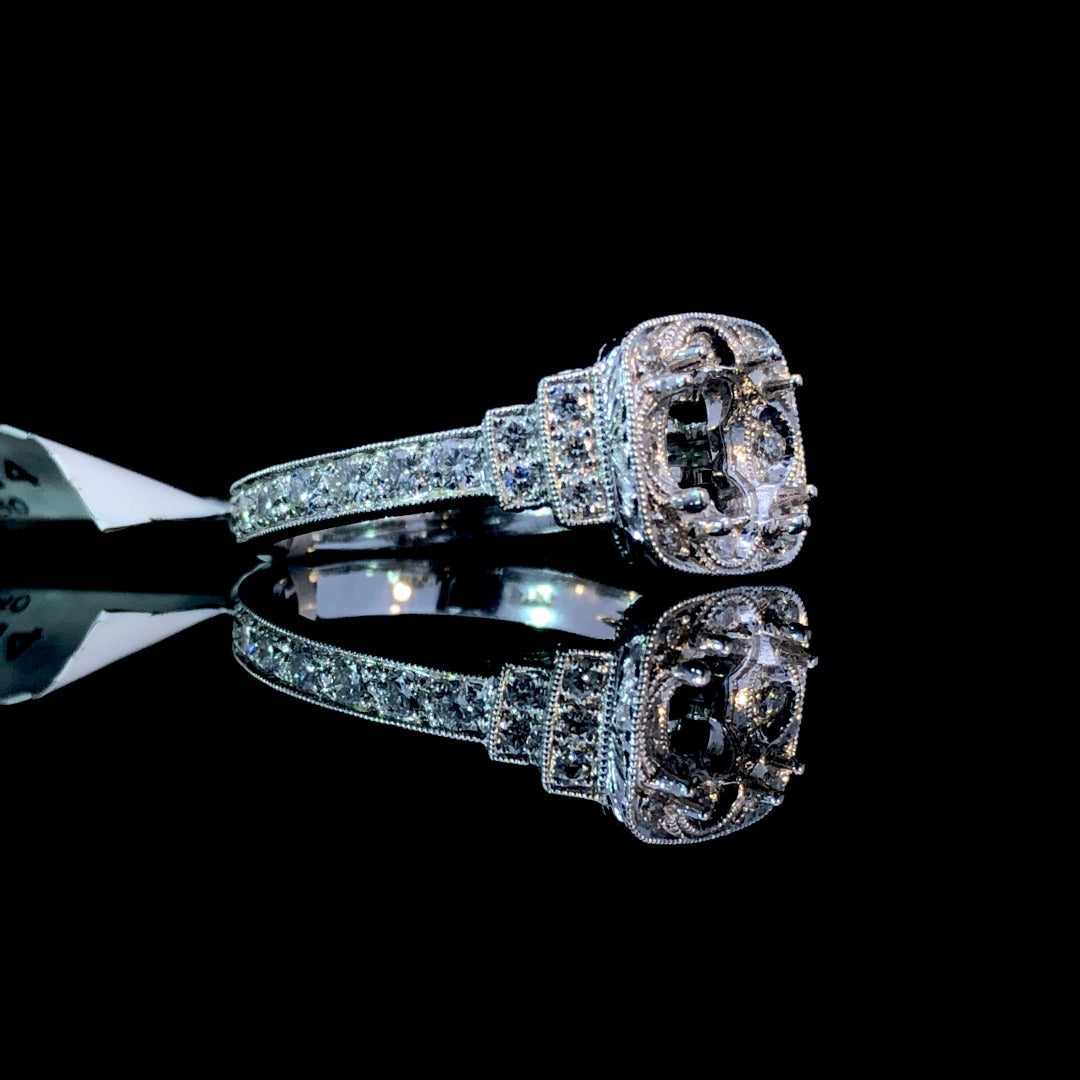 This luxurious diamond semi mount boasts a gorgeous cushion-shaped halo adorned with intricate detailing and .71ctw of round diamond accents. Crafted in 14kt white gold, it allows you to choose your own center stone from our extensive loose stone collection, creating a truly unique and stunning piece. Price is for the semi mount only. Center stone will be added at an additional cost. This ring is a size 6.5. If that size is not a perfect fit, first time sizing is free at the time of purchase. Additional sizing fees may apply.