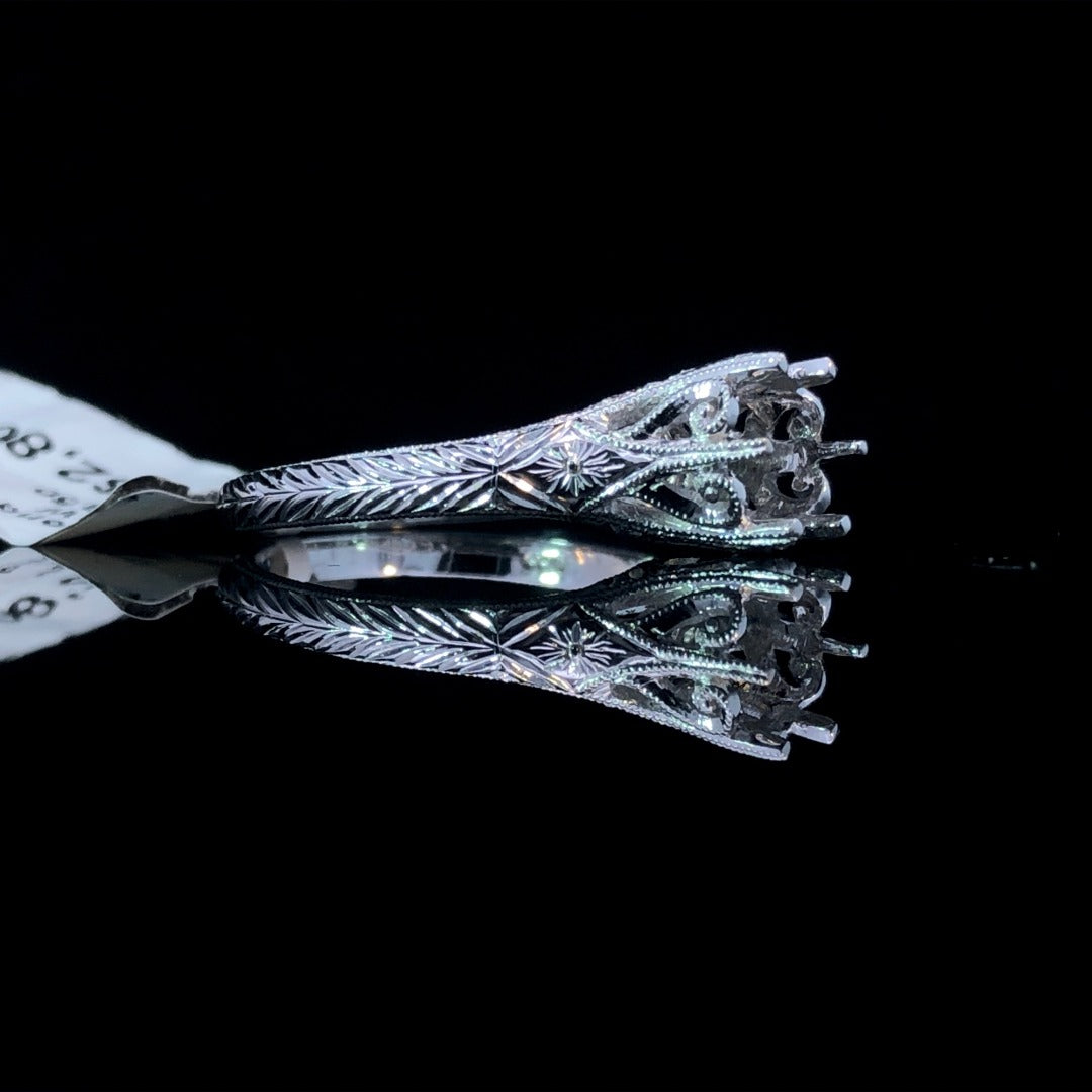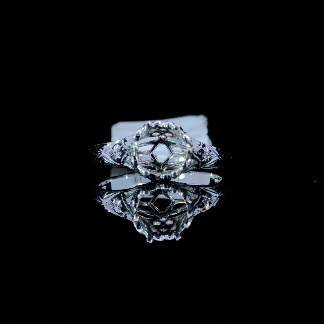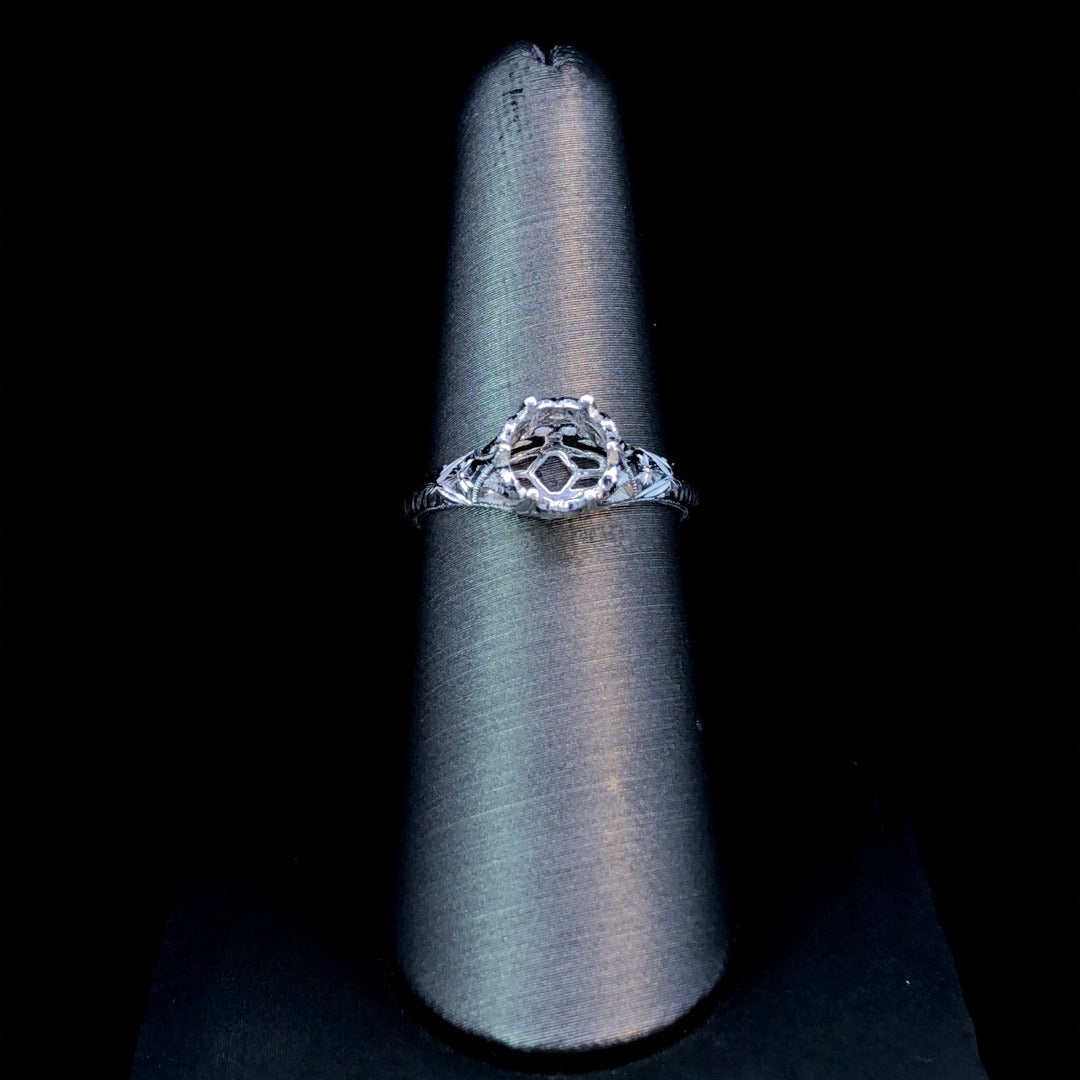 Create a timeless and unique ring with our vintage-inspired semi mount. The intricate etching and milgrain details exude elegance, while the crown-style head adds a touch of regal charm. Personalize it with a center stone of your choice. Make a statement with this gorgeous design! Price is for the semi mount only. Center stone will be added at an additional cost. This ring is a size 6.5. If that size is not a perfect fit, first time sizing is free at the time of purchase. Additional sizing fees may apply.