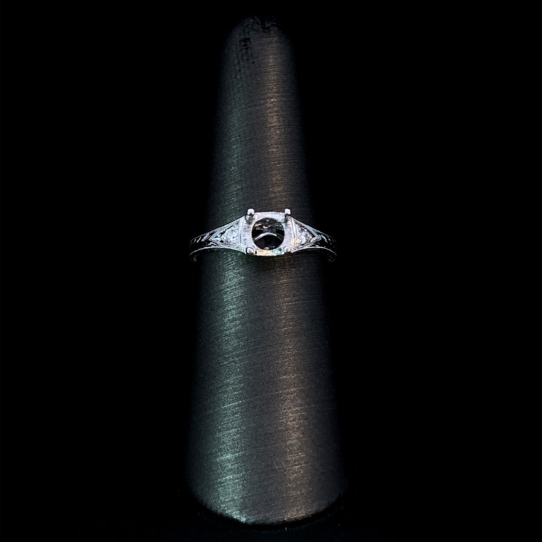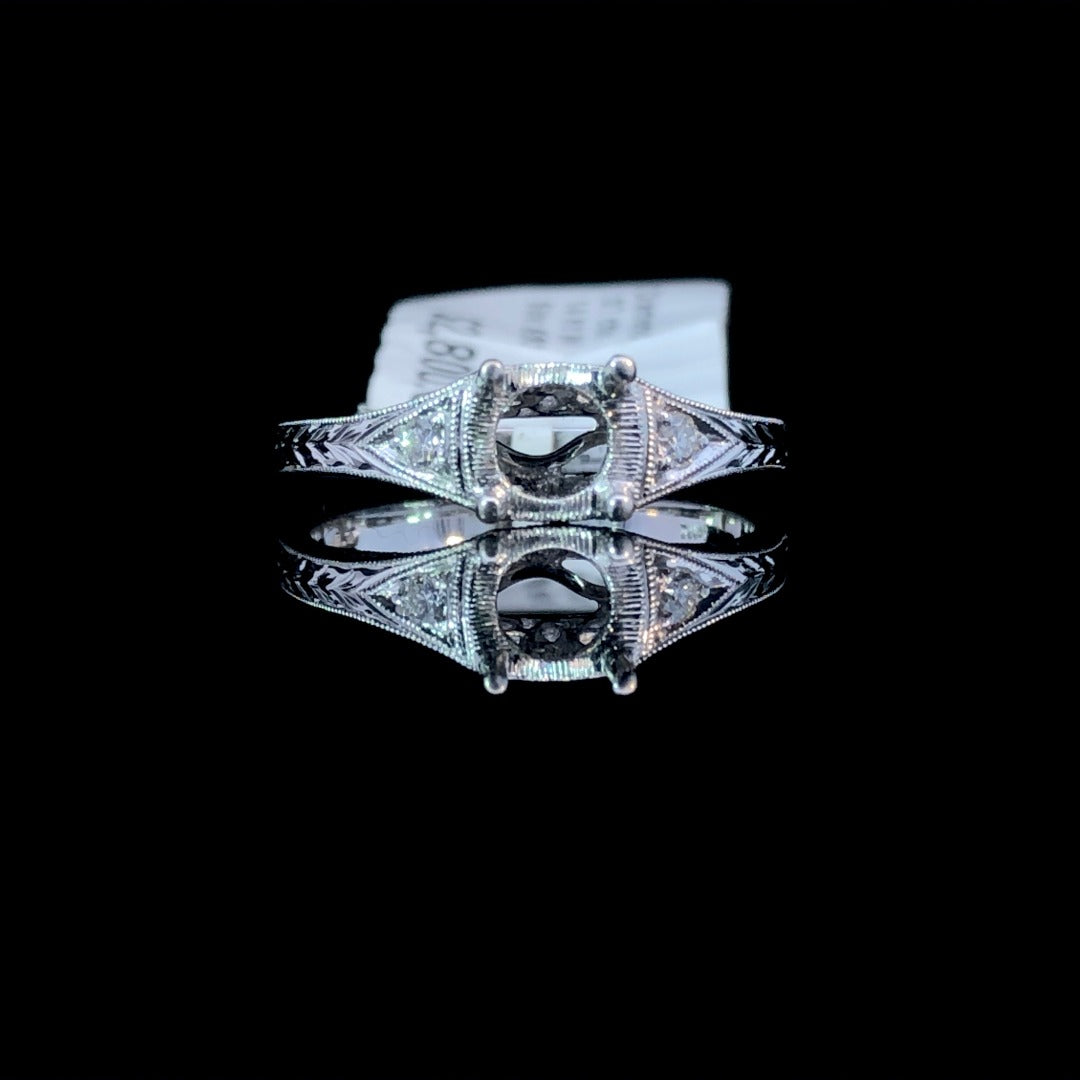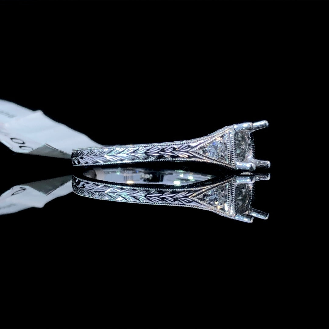 Choose your perfect center stone from our unbeatable selection and let it shine in this intricate 14kt white gold semi mount. Adorned with etchings, filigree, and milgrain details, this piece exudes elegance and class. Two round diamonds on the sides add extra sparkle to complete this work of art. Price is for the semi mount only. Center stone will be added at an additional cost. This ring is a size 6.5. If that size is not a perfect fit, first time sizing is free at the time of purchase. Additional sizing fees may apply.