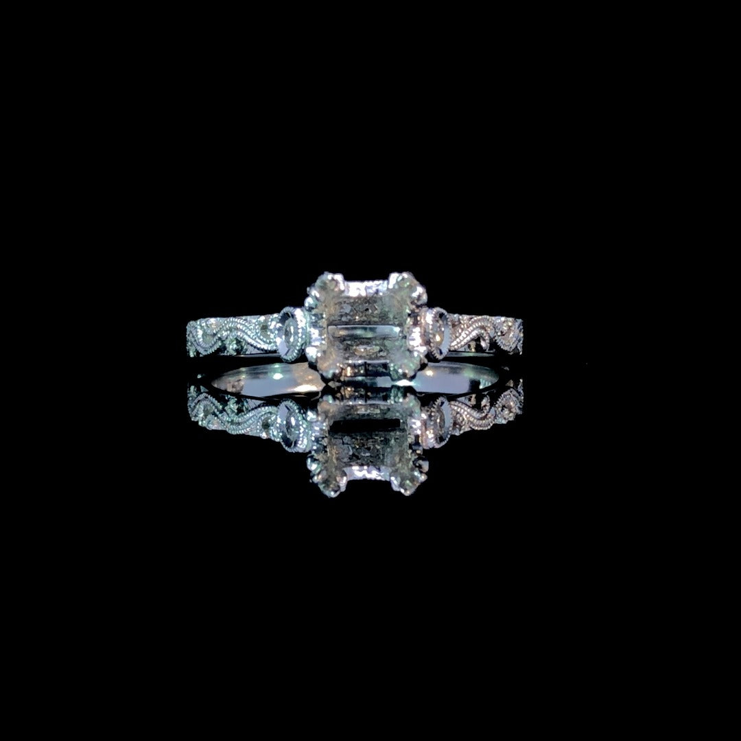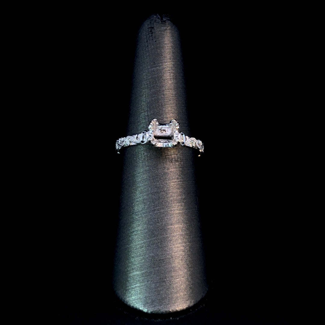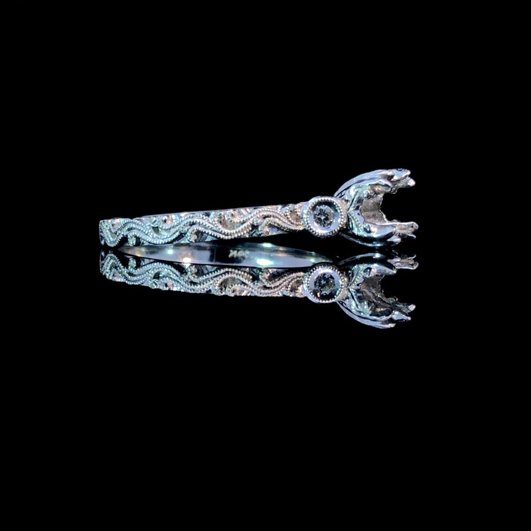 Complete your look with our stunning diamond semi mount. Featuring a beautifully intricate swirl design and subtle milgrain detailing, this 14kt white gold piece includes 2 round diamond accent side stones totaling .07ctw. Choose from our wide selection of loose stones to make this piece truly yours! Price is for the semi mount only. Center stone will be added at an additional cost. This ring is a size 6.5. If that size is not a perfect fit, first time sizing is free at the time of purchase. Additional sizing fees may apply.