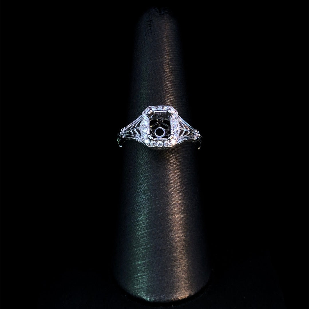 This stunning diamond semi mount boasts a detailed rectangular halo adorned with round diamonds, intricate etchings, and milgrain accents. Customize it by choosing your own center stone from our extensive collection of loose stones. Elevate any look with this exquisite piece of fine jewelry. Price is for the semi mount only. Center stone will be added at an additional cost. This ring is a size 6.5. If that size is not a perfect fit, first time sizing is free at the time of purchase. Additional sizing fees may apply.