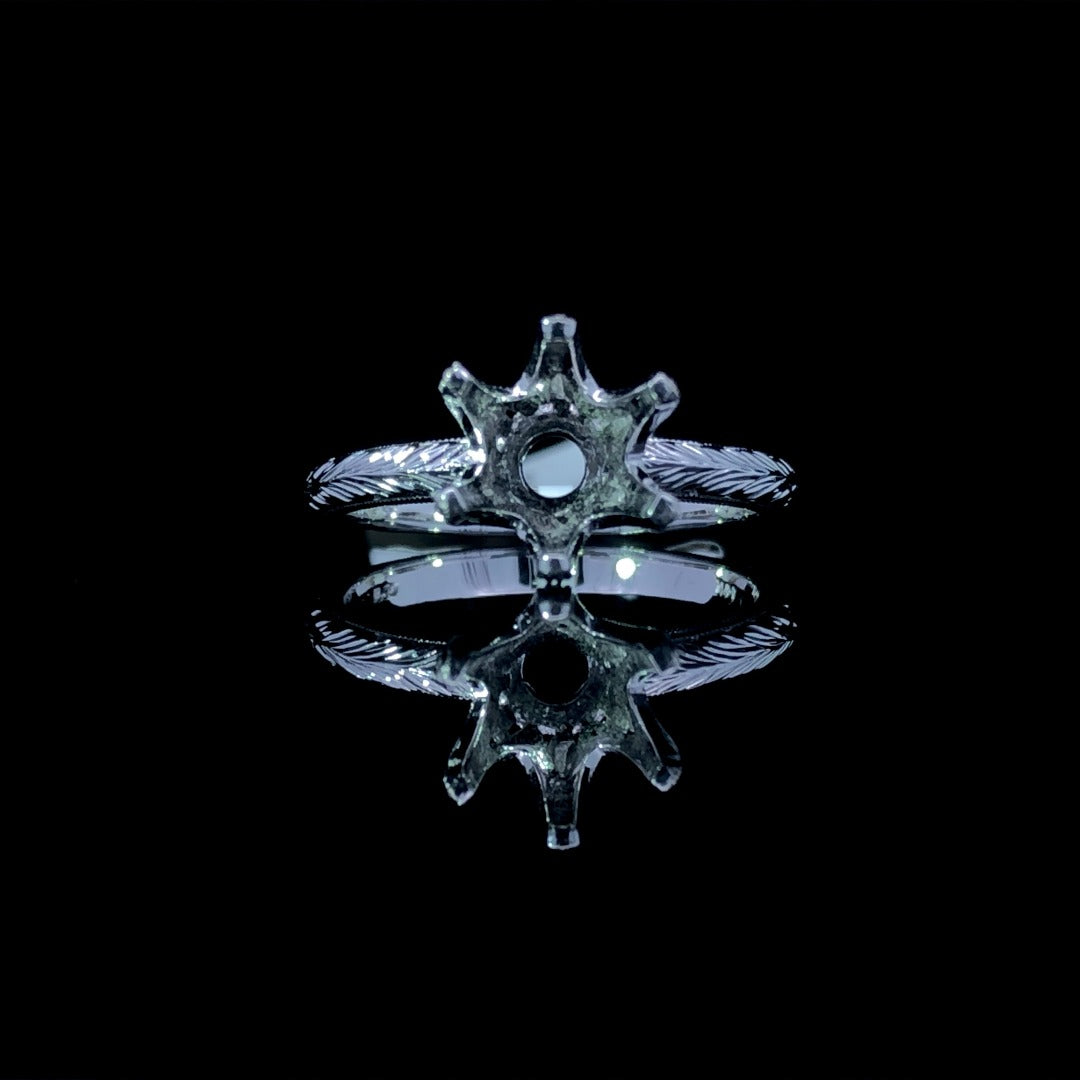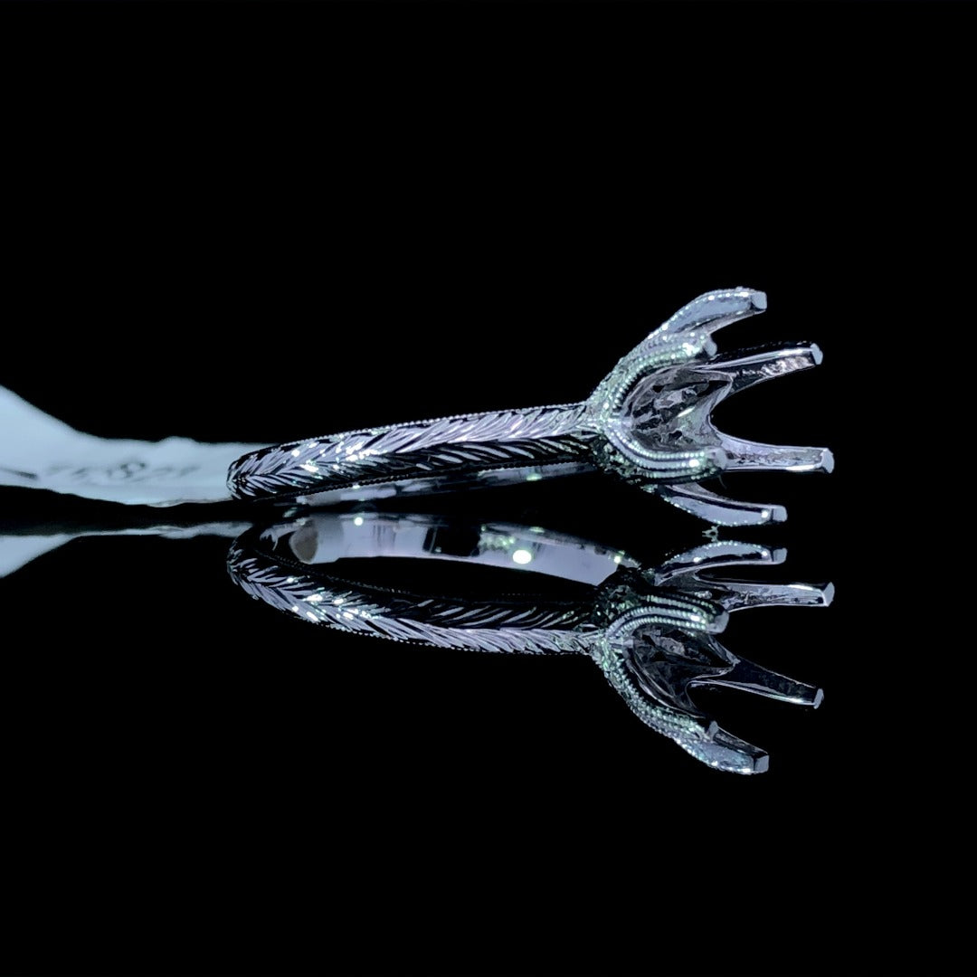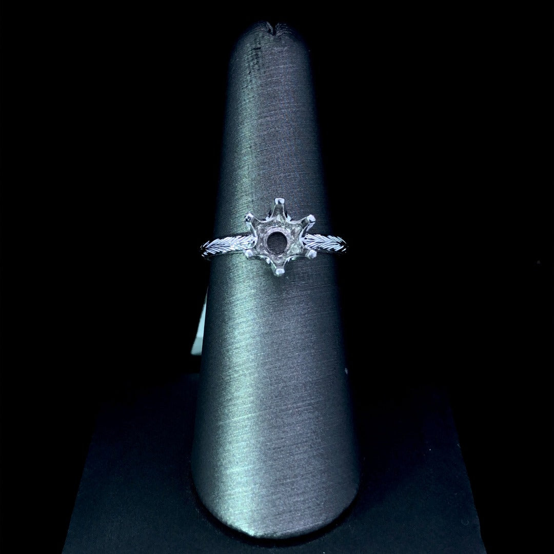 Elevate your style with our stunning semi mount ring. Crafted in 14kt white gold, its intricate etched design adds a touch of elegance. Personalize it by choosing your own round center stone from our large selection of loose stones. Make a statement with this one-of-a-kind piece! Price is for the semi mount only. Center stone will be added at an additional cost. This ring is a size 6.5. If that size is not a perfect fit, first time sizing is free at the time of purchase. Additional sizing fees may apply.